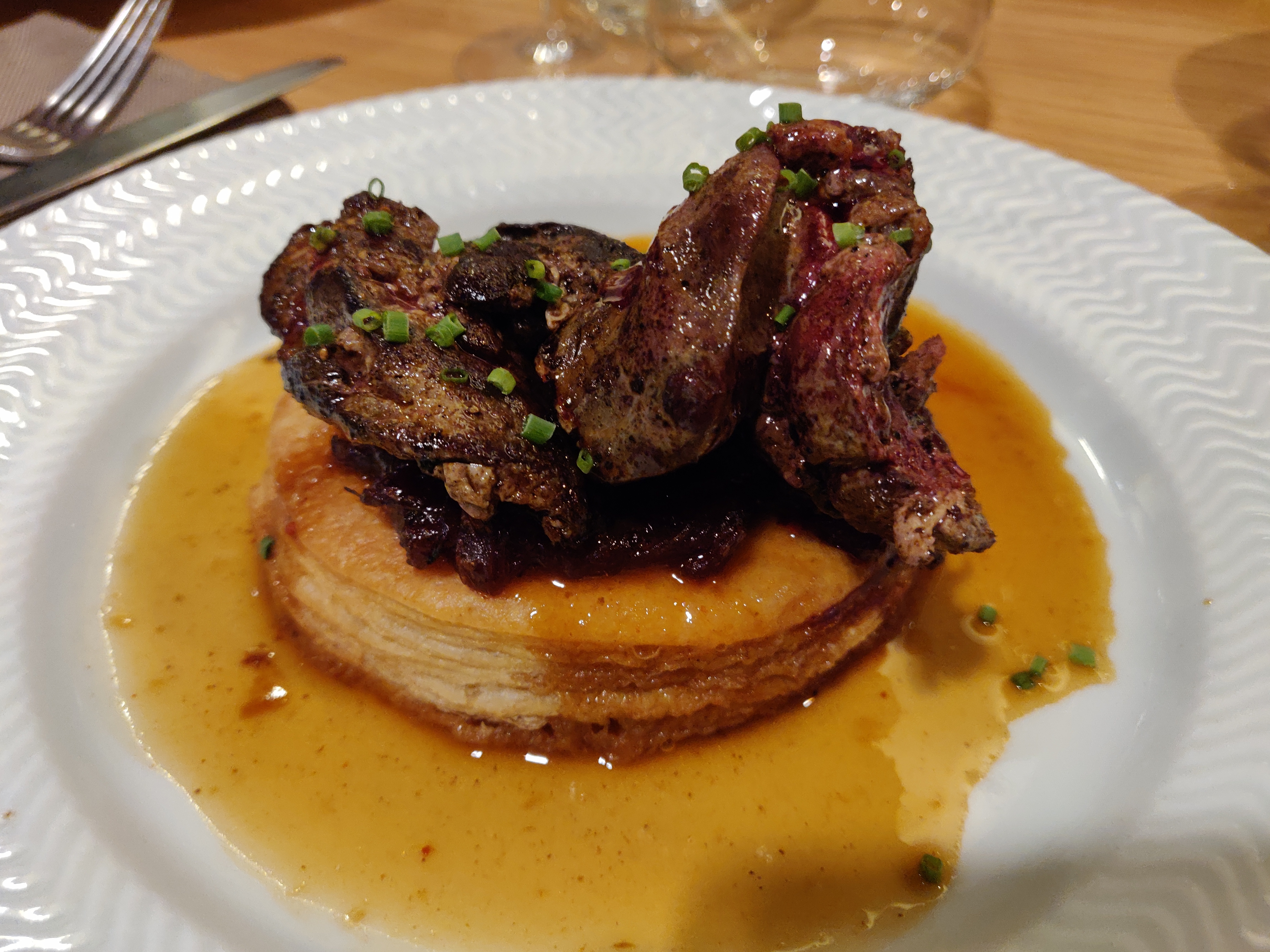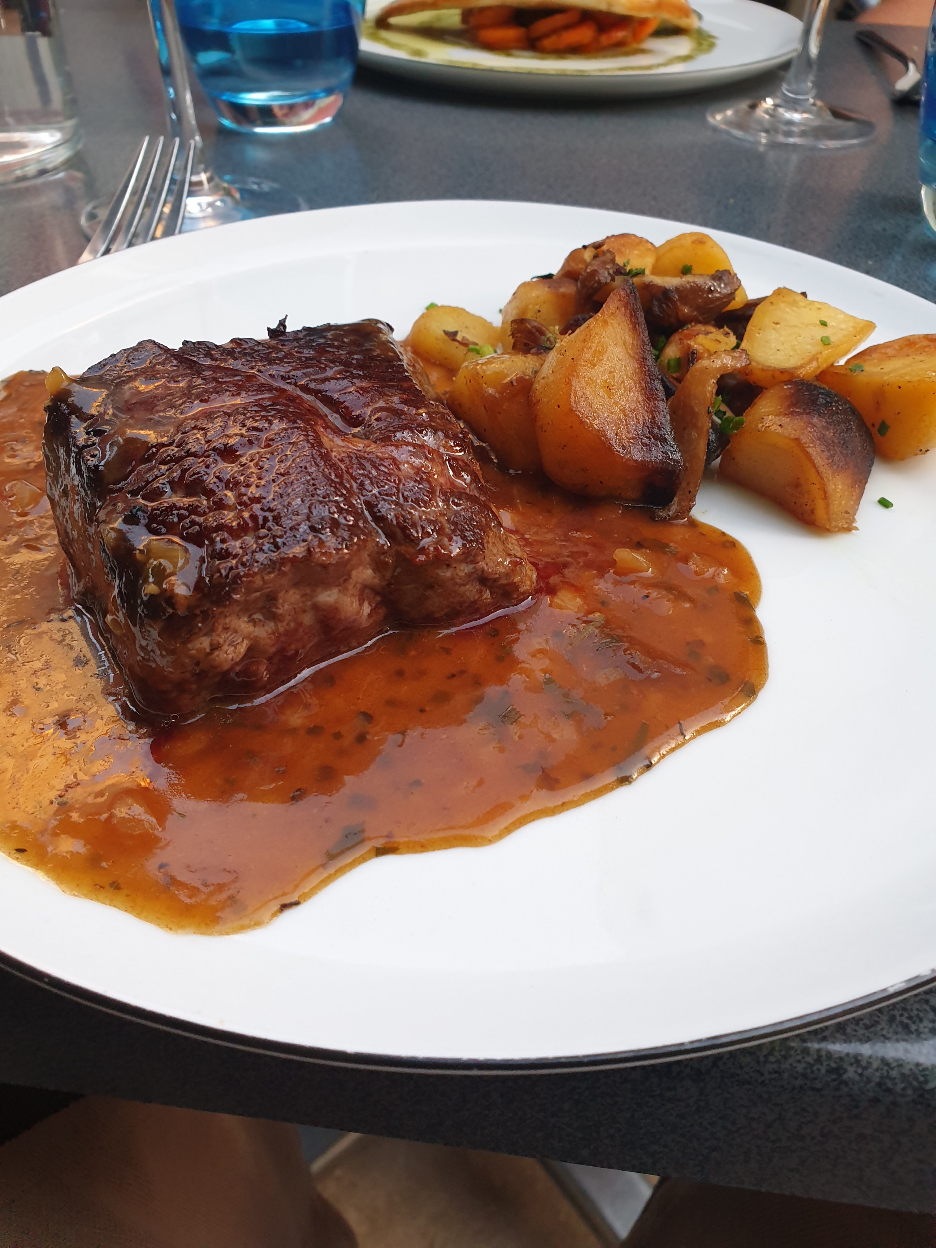 Cadre très agréable ; feuilleté à la tapenade, coeur de rumsteack duo de pleurotes et charlottes, crème brûlée pistache et framboises. Tout était bon, la viande parfaitement cuite mais LA pleurote et le peu de pommes de terre laisse sur sa faim, c'est dommage ! Le Saumur Champigny : excellent.