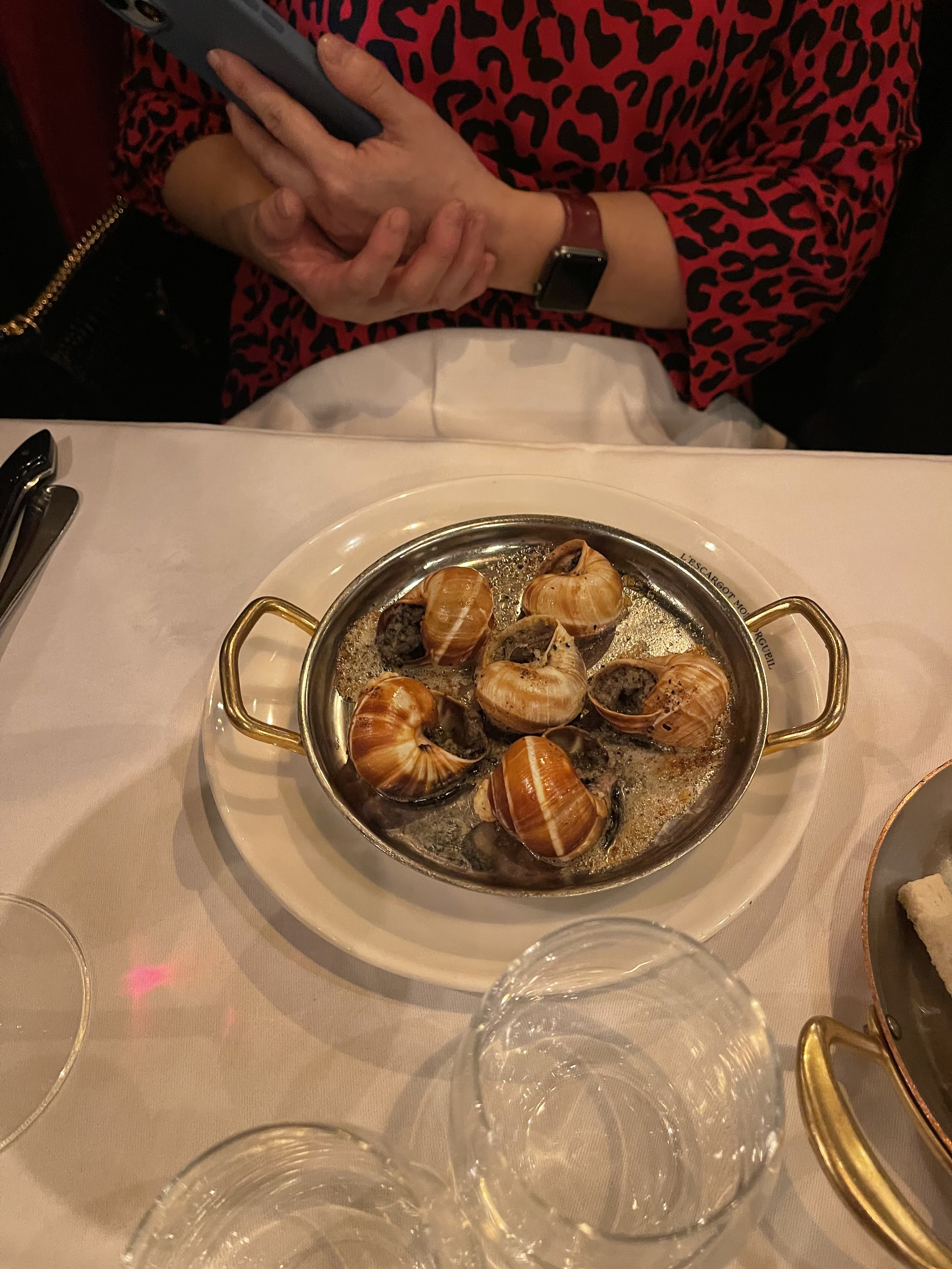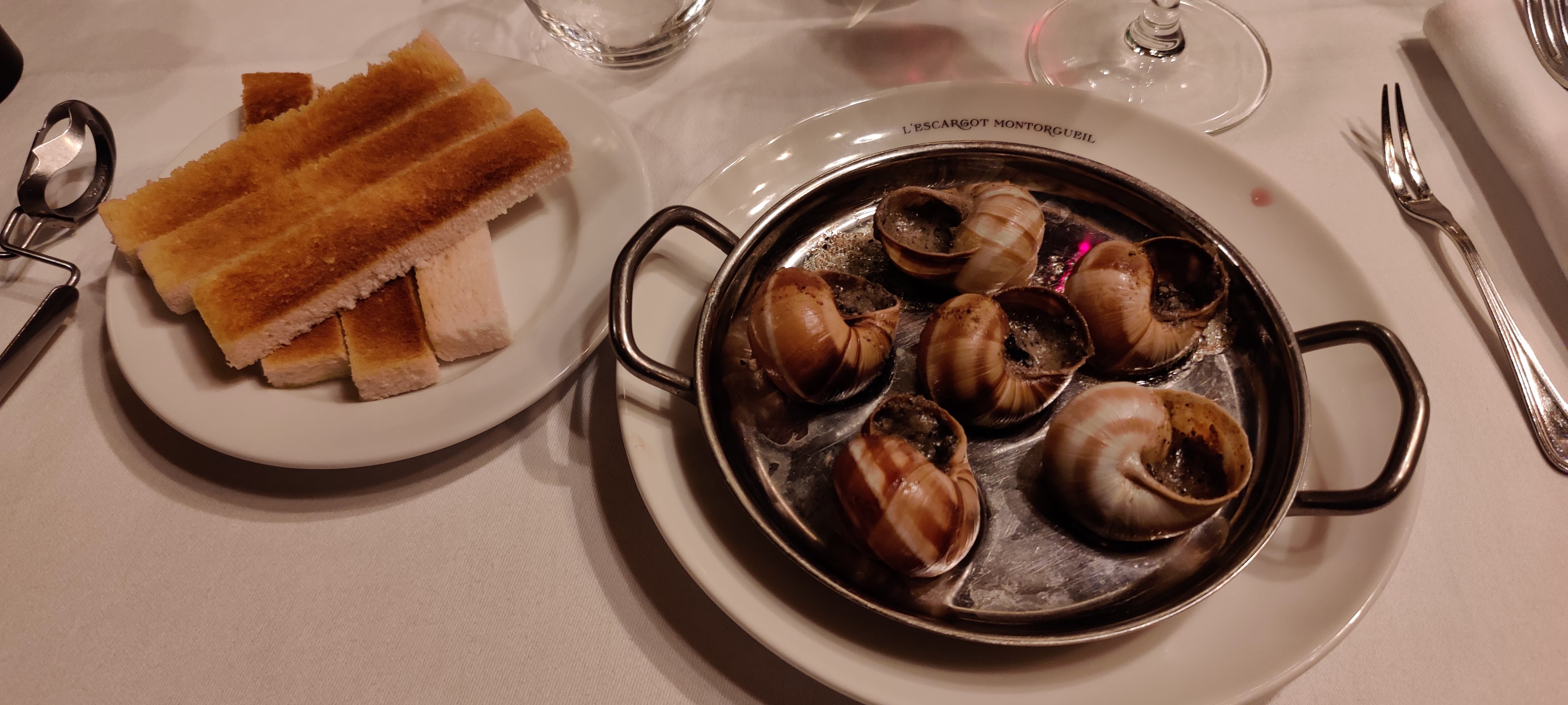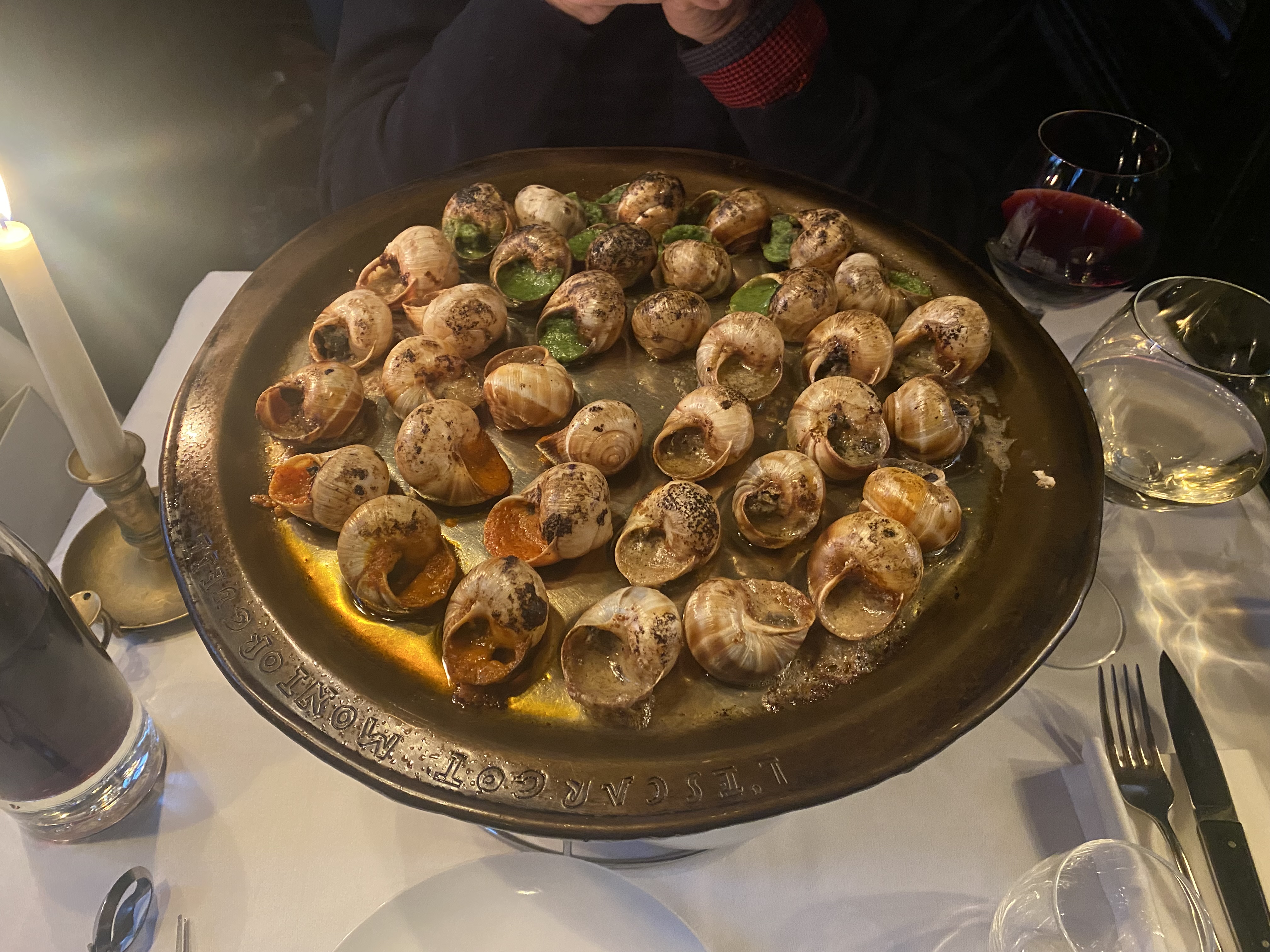 Traduction française oblige sur le thème de l'escargot, ... Je n'y ai pas goûté pour cette fois J'avais peur d'une assiette pour touriste, je le suis qd même régalée du bœuf bourguignon. Par contre le service a été complètement raté, on a dû réclamer sans cesse un couvert manquant. Qui a été apporté avec mille excuses et gentillesse mais j'aurais préféré ne pas avoir à réclamer ! Les assiettes sont gourmandes et généreuses ... Le prix en conséquence !! Salle remplie comme un œuf, pas d'intimité de conversation !!