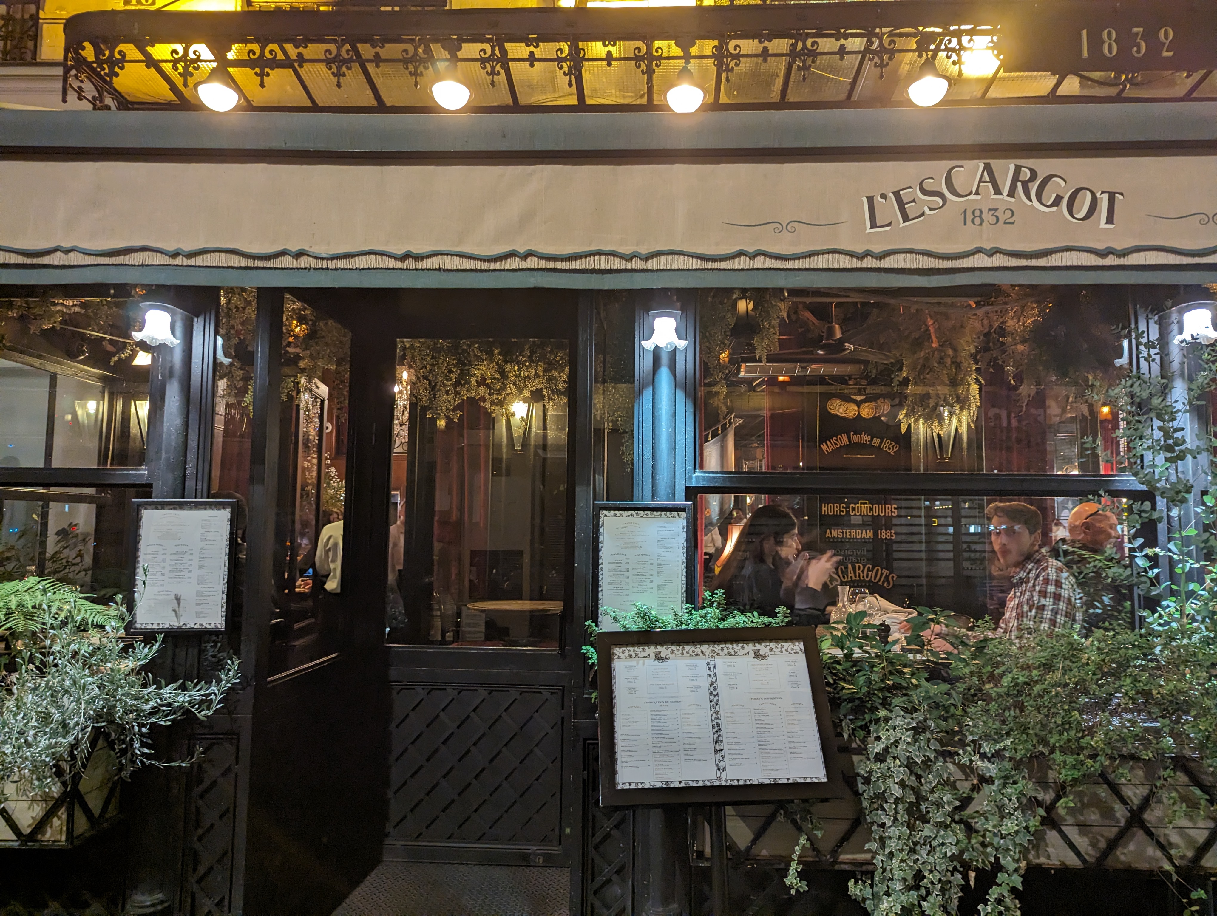 Passé plusieurs fois devant ce restaurant, je me suis décidé à pousser sa porte. Au préalable bien sûr j’ai réservé, et je vous le conseille, vu le niveau de fréquentation de l’établissement. La carte qui nous a été présentée était en anglais, et cela se comprend très facilement vu le nombre de touristes présents ce jour, et à l’accoutumée j’imagine. Bien entendu, vu le nom de l’établissements, on y retrouve les escargots, mais aussi si on veut varier un peu, tout un tas de plats français, tel que des cuisses de grenouilles, des tourtes ou du confit de canard. Loin d’être mauvais, les plats ne sont pas non plus exceptionnels, et l’addition peut très vite grimper dans cet établissement ( 12€ les 6 escargots, et la plupart des plats dépassants les 30€). Au final, on se dit que pour ces tarifs, on peut trouver un petit étoilé, mais après tout ce fut une expérience, et je peux maintenant dire que j’y suis allé lorsque je passe devant.