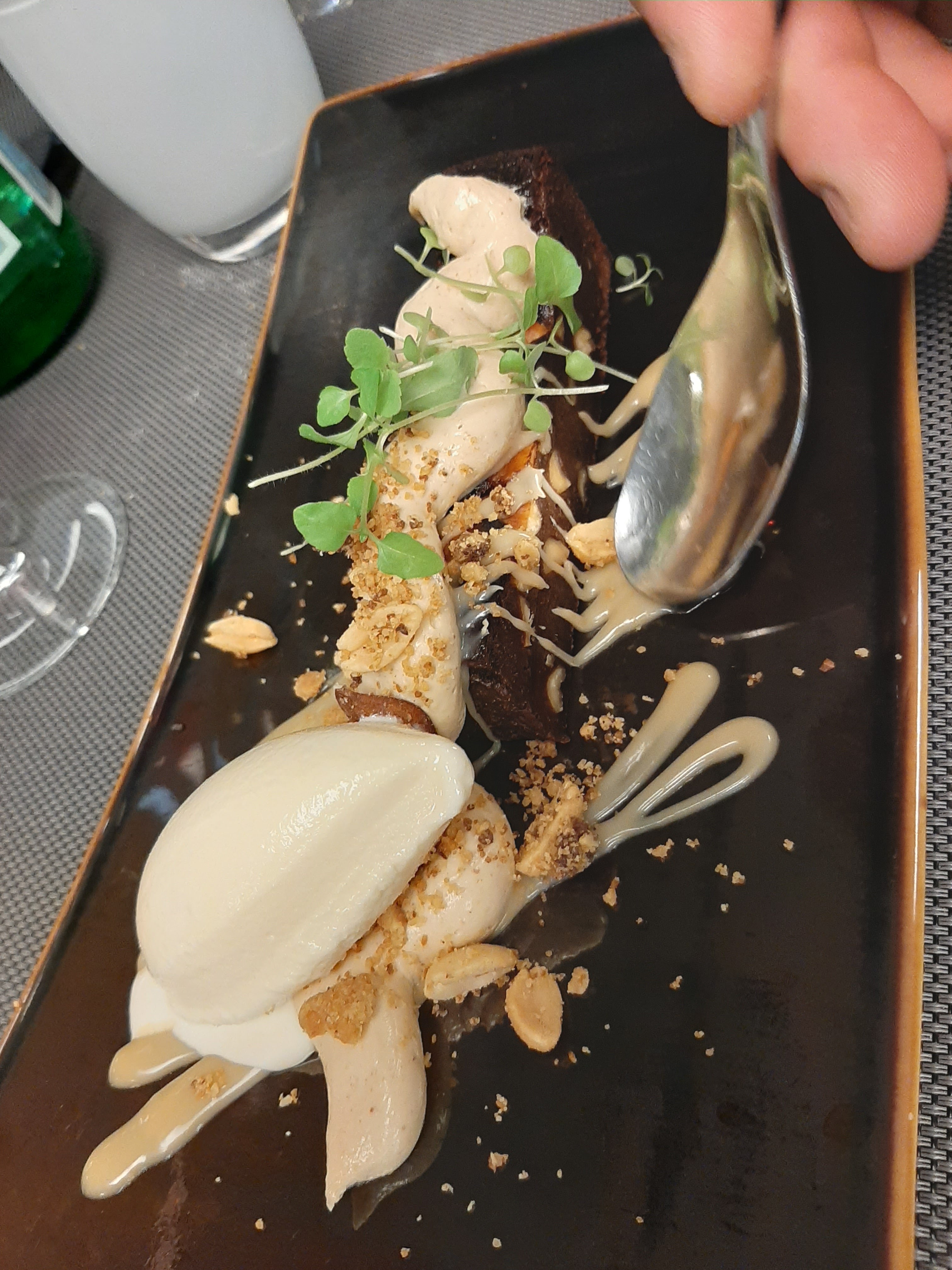 Bien mangé, bien servi. 2 petits points qui me gêne pour un beau tarif Cuillère en bois jetable dans le mise en bouche. Décalage entre nos 2 tables.