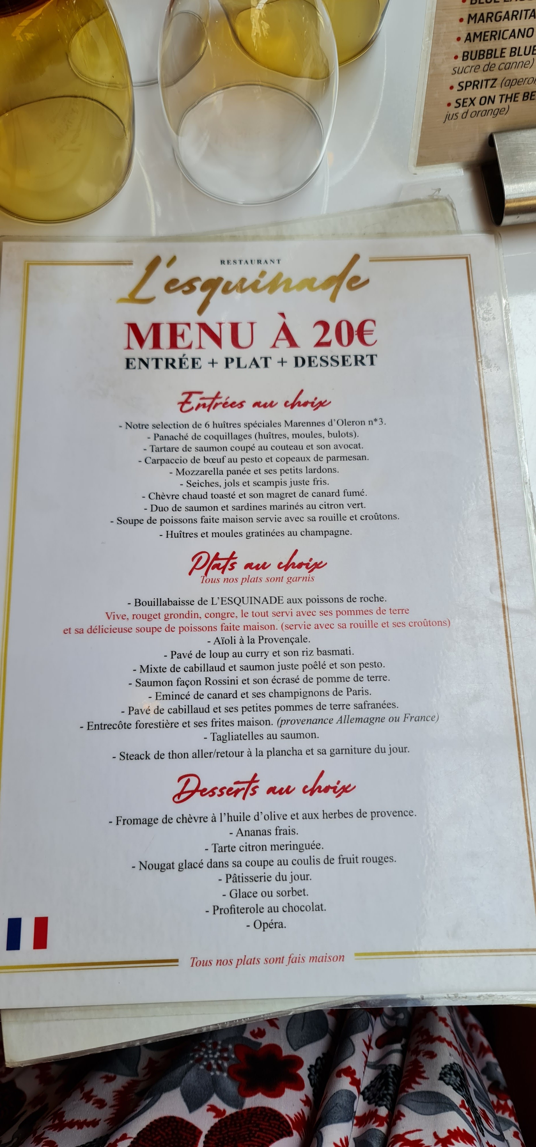 menu 20 euro entrée plat dessert. très correct pour le prix. cadre agréable. la bouillabaisse pour le prix c'est plus une soupe de poissons....mais pour 20 euro c'est cohérent....beaucoup de choix. ticket moyen 35 euro par personne. je reviendrai avec. plaisir... ❤