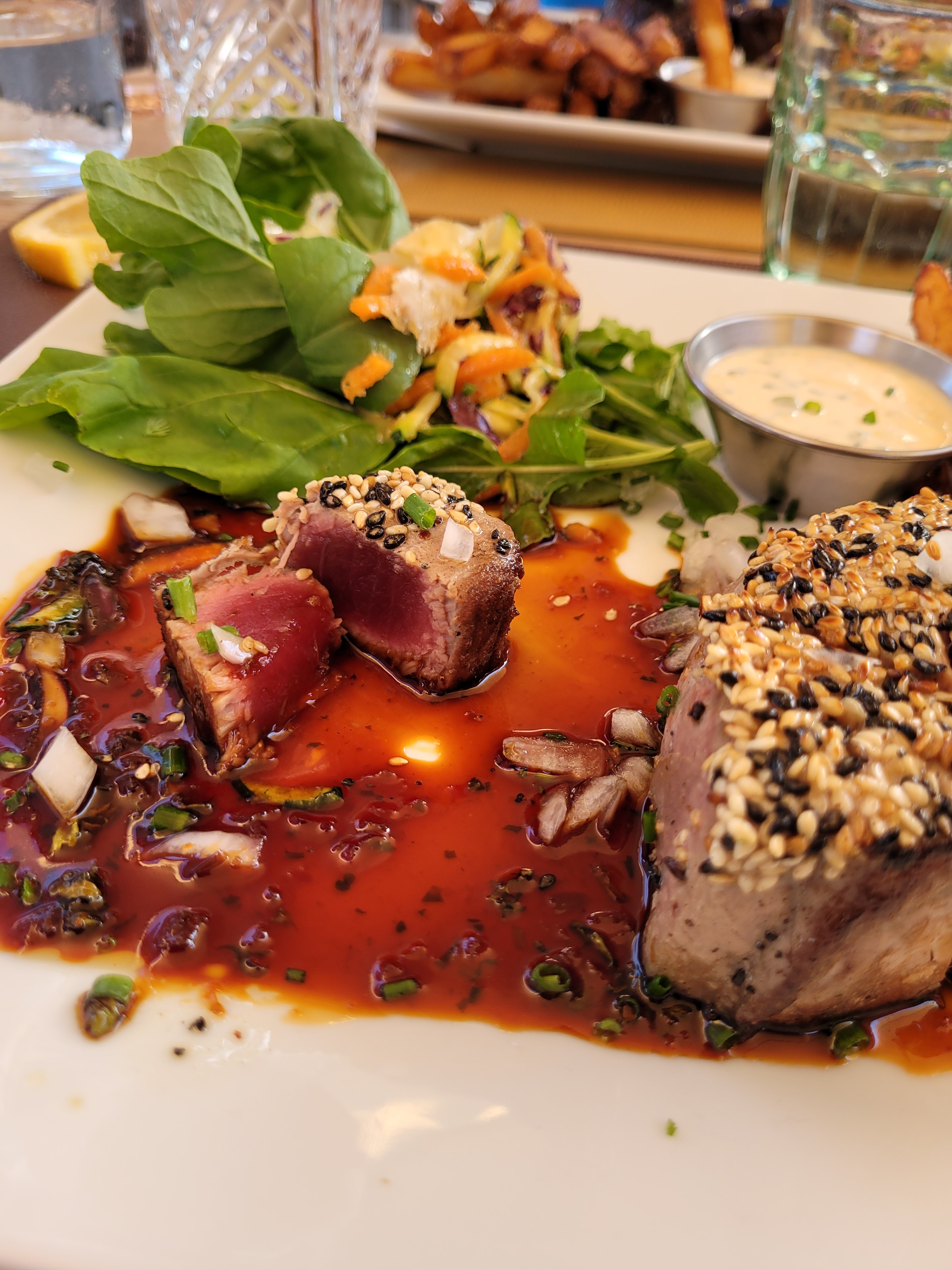 Très très bon accueil chaleureux, souriant, agréable. Rien à dire. Explications des Entrées, Plats et Desserts top. L'équipe se préoccupe du bien-être de la clientèle. Plats délicieux. Les cocktails sont bons. Monsieur a pris une pièce de viande qu'il a beaucoup apprécié. Pour ma part le thon mi-cuit qui fût un pur régal. Les frites et la salade qui accompagnaient le plat étaient très bonnes également. Je voulais prendre le magret, mais il a été victime de son succès. .J'espère bientôt pouvoir le déguster lors d'une prochaine visite. Courage à l'équipe et bonne continuation