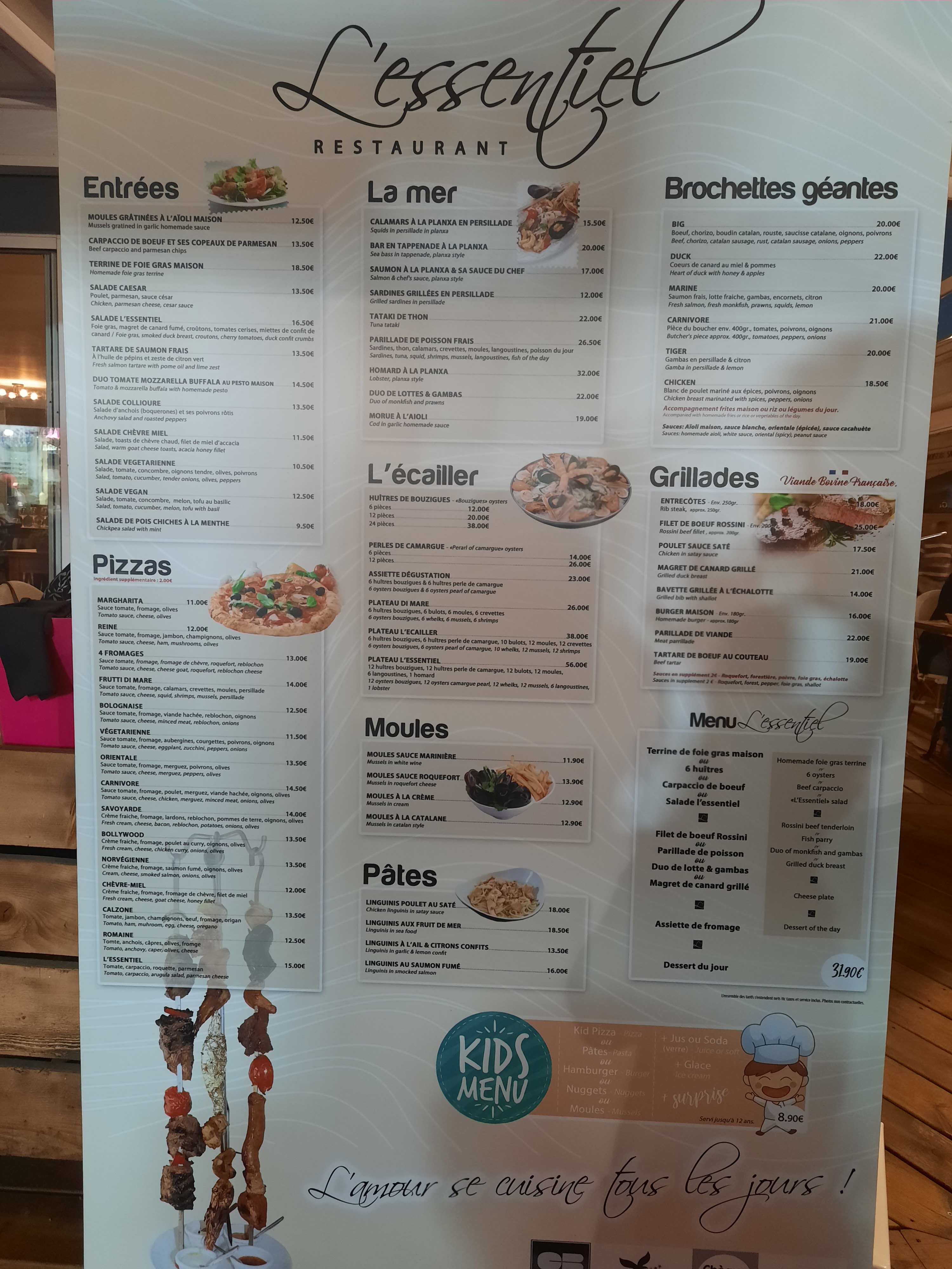 Excellente expérience à l'Essentiel ! Avec madame et notre enfant, nous avions envies de produits frais et de qualité et nous nous sommes arrêté sur ce jolie restaurant. L'accueil à été super, et le service excellent. La cuisine ouverte sur la salle rajoute un petit quelque chose. Terrasse tres aérée et très agréable. Nous avons mangé des huîtres en entrée bien fraîche et une parillade de poissons avec des produits frais, et un Pavé de saumon pour madame. En dessert nous avons pris le mythique mille feuille de Framboise un délice. Rapport qualité/prix très correct. Service au top très attentionné Expérience d'un tres bon restaurant qui merite plus de visibilité, je recommande.