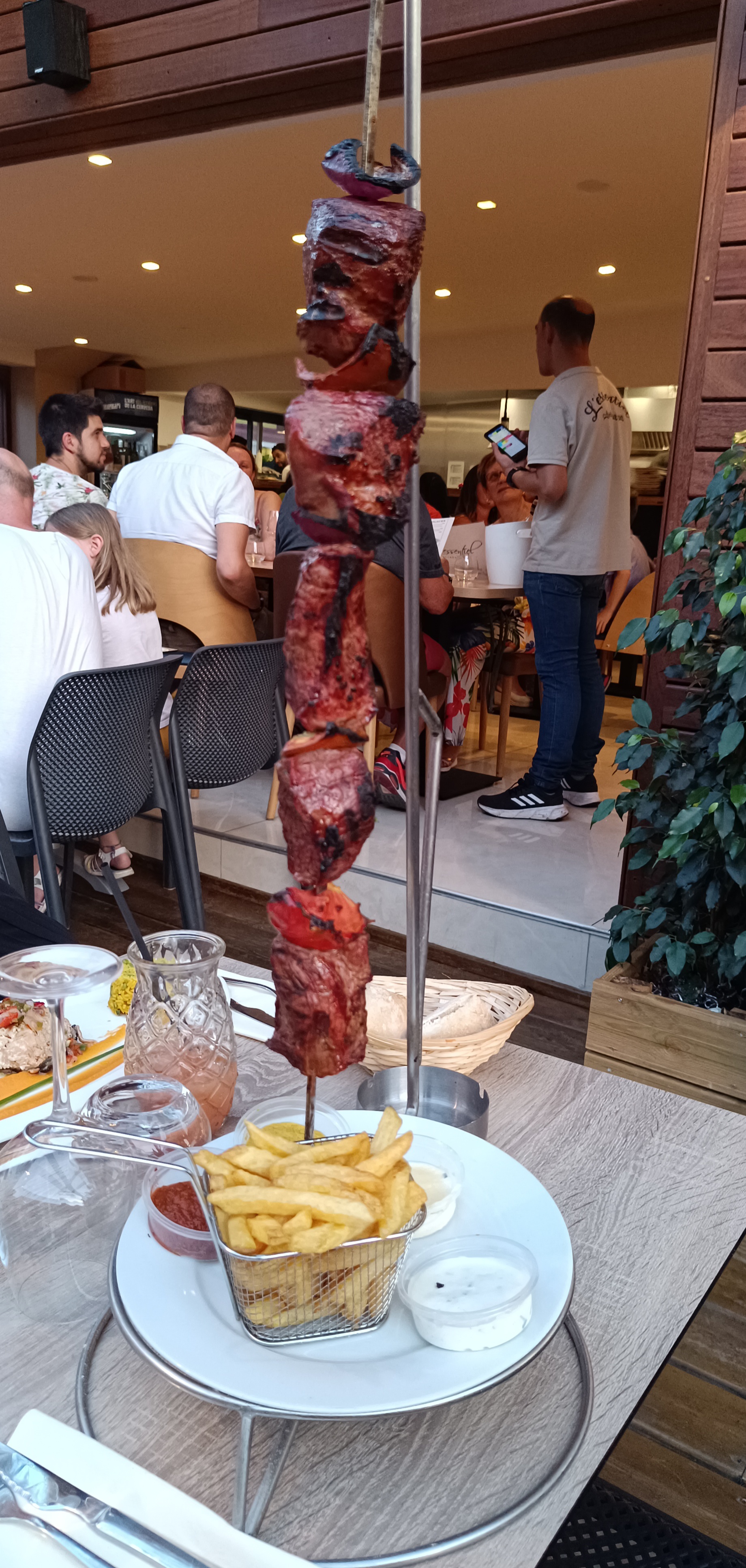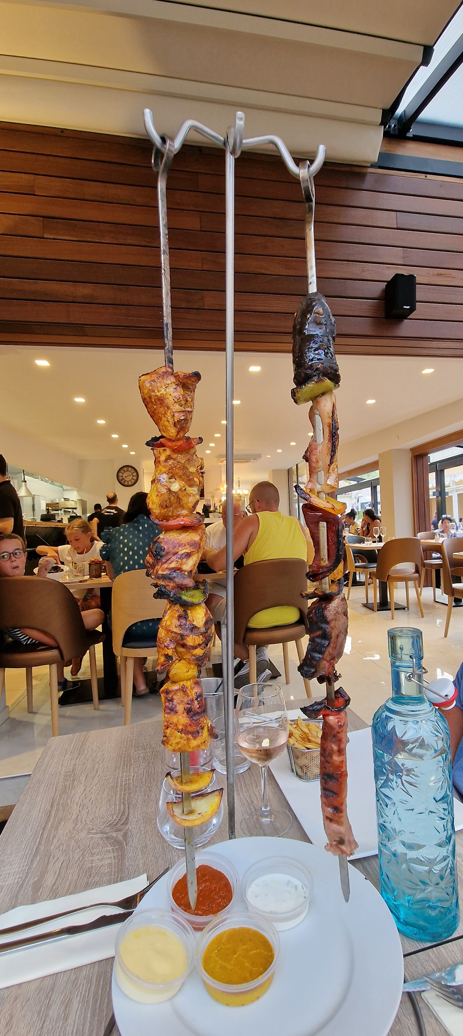 Repas bof. Nous avons pris chacun une brochette, boeuf et Big (boeuf, boudin, chorizo agneau, poivron). Pas terrible, le boeuf sur, le boudin catalan gras et l'agneau, je cherche encore la viande. Le rosé servi était tiède. Nous avons demandé à ce qu'ils mettent que des glaçons dans le seau pour le rafraîchir. Pas de dessert vu la qualité du plat.