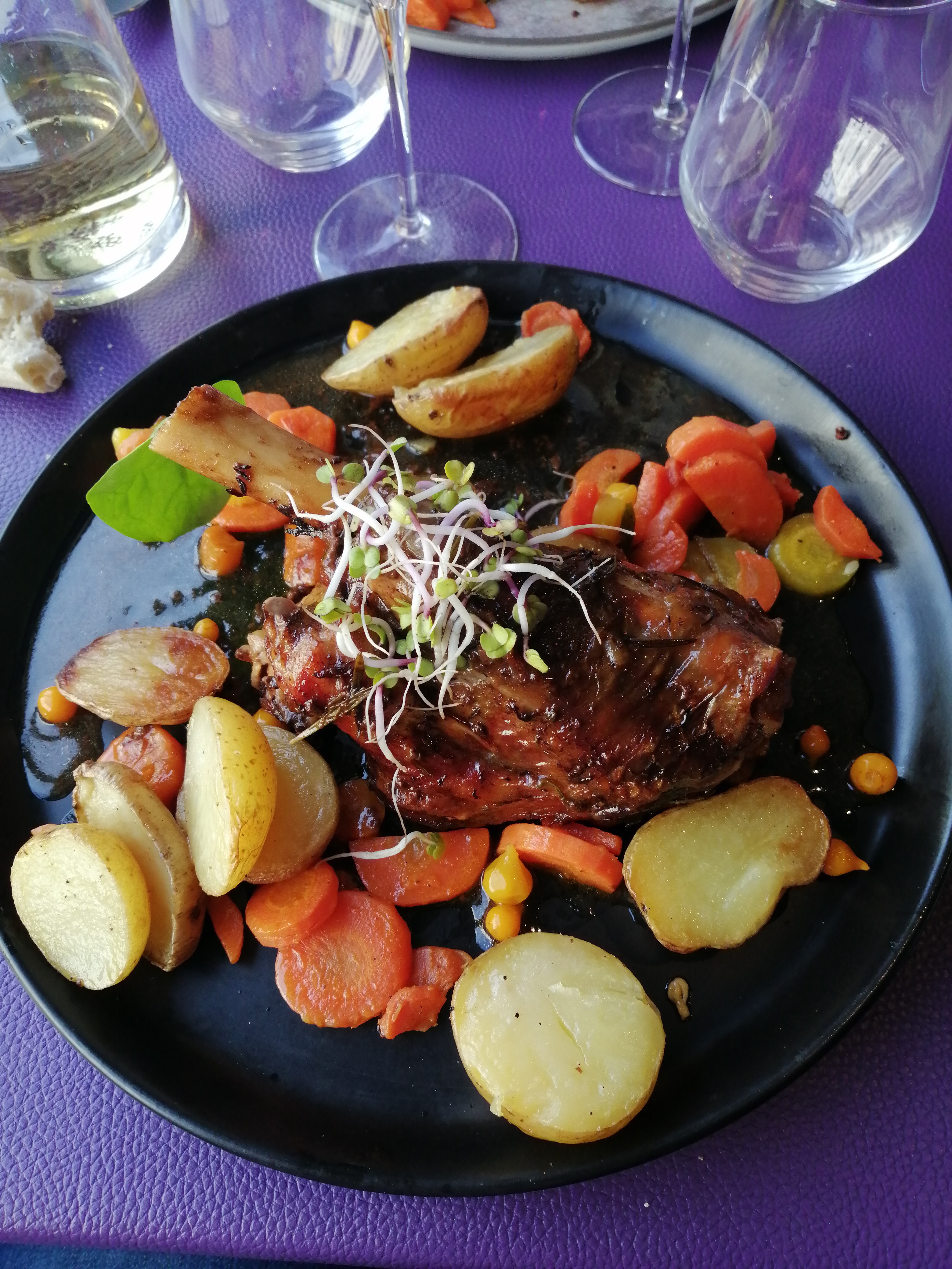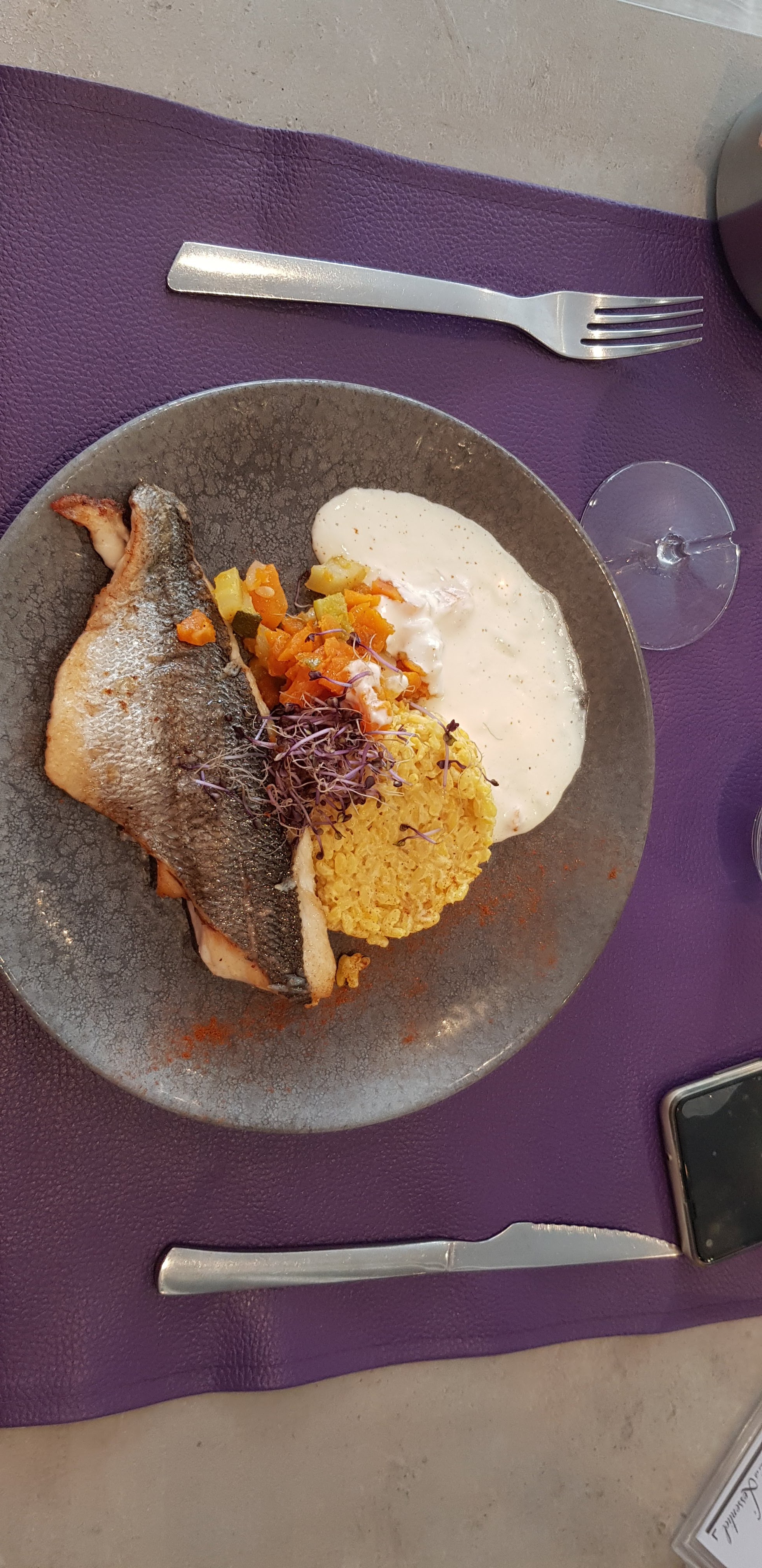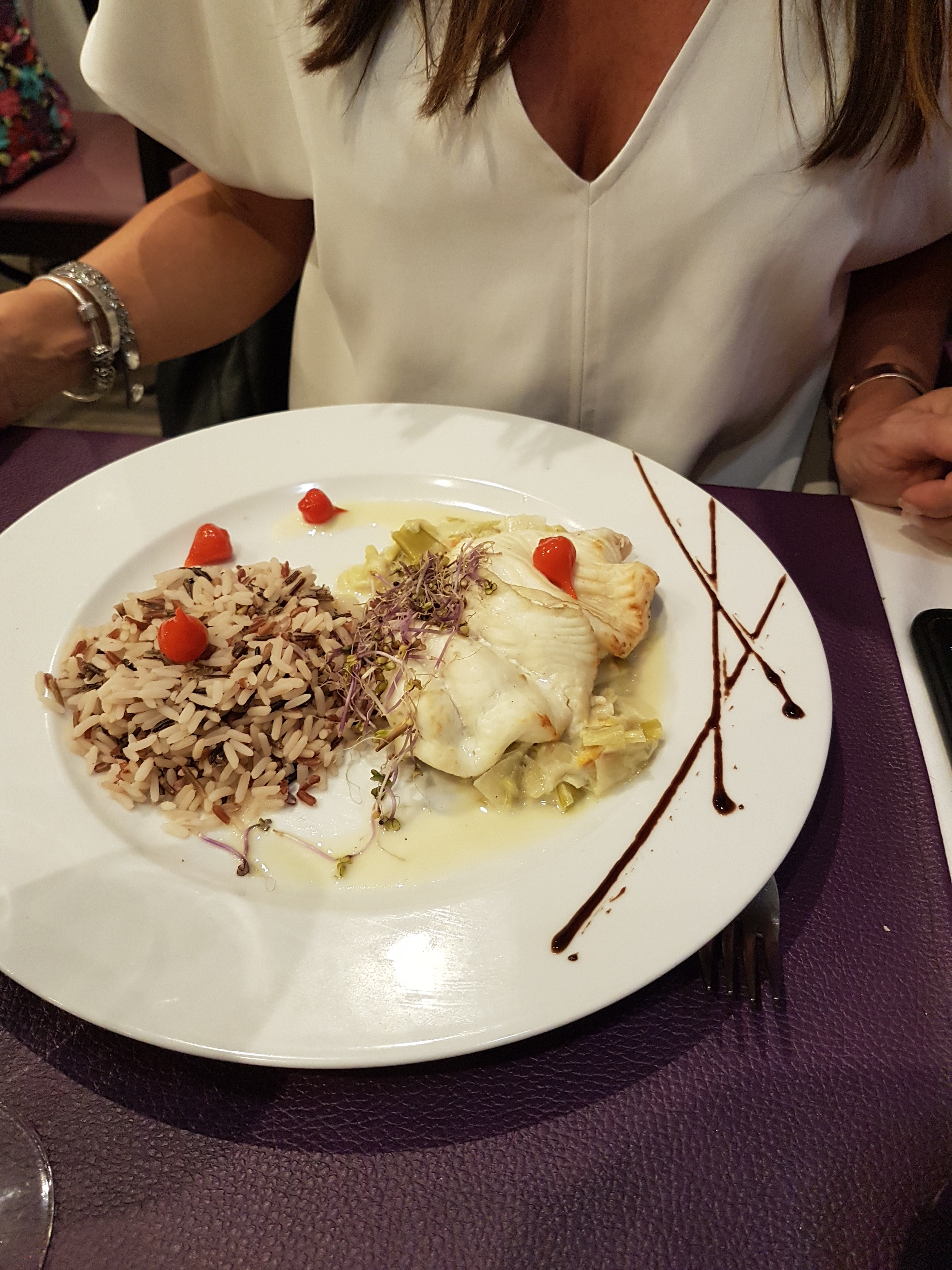Déçu nous avons fait confiance au commentaire et malgré ça… décevant Déjà quand vous rentrer on à l’impression d’entrer dans une cantine tellement c’est bruyant… Les verres ont des traces l’assiette des apéritif c’est pareil elle n’avait pas l’air propre Vraiment Déçu Nous avons pris du vin en 50 cl servi en pichet… J’ai pris en entrée les escargots aux crumble C’est fade et bien trop pâteux Mon plat était bon Mon dessert impossible de manger là poire tellement c’était dur et sans goût mon ami à pris la souris d’agneau Et Manque d’assaisonnement rien d’exceptionnel et le souci aussi c’est quand on veut ajouter le sel Attention car avec la salière on se retrouve avec moitié du sel dans l’assiette Au final seul l’addition et salée …