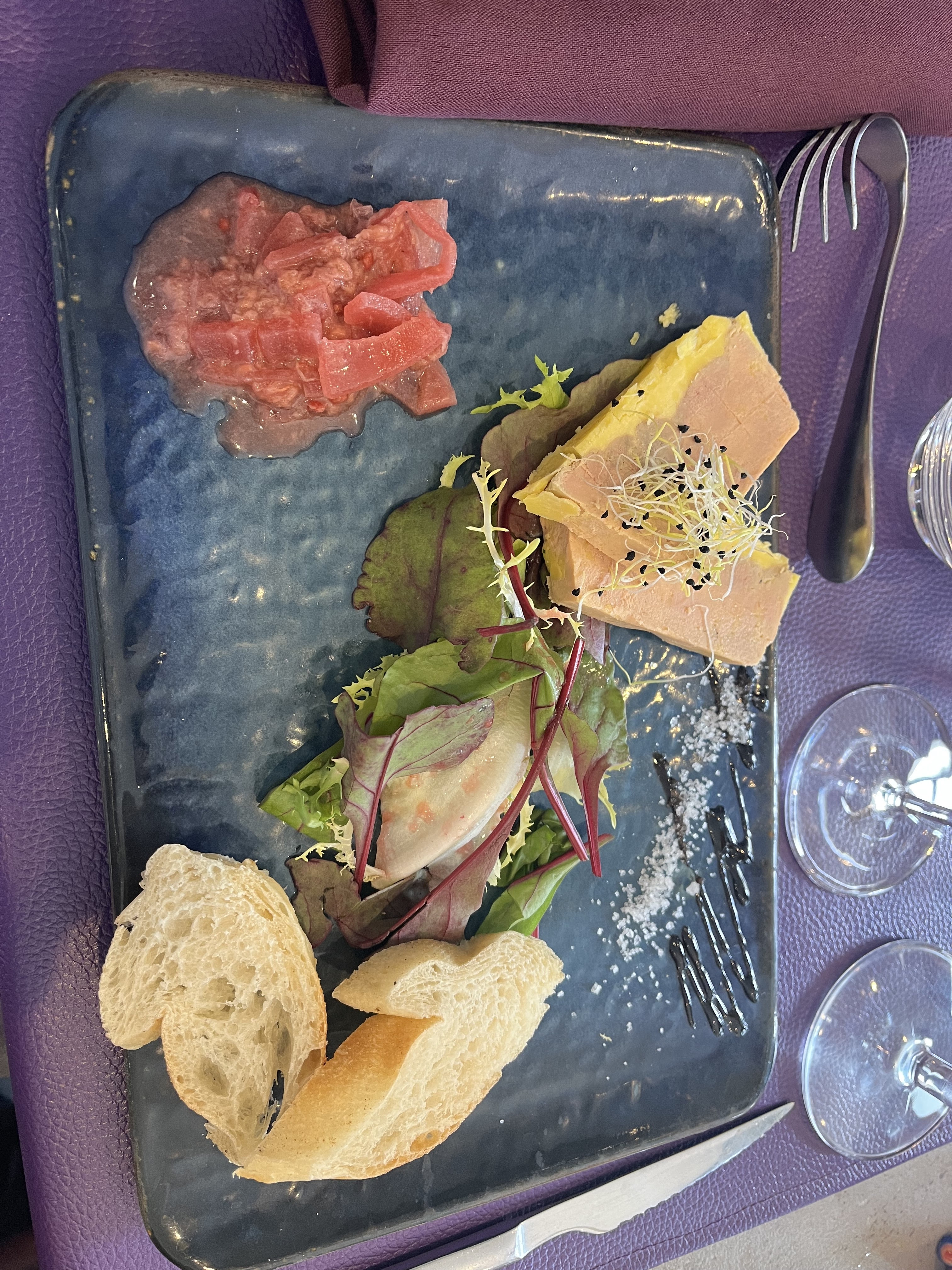 Nous sommes venus samedi soir très déçus surtout quand on voit les photos ce n’est pas ce nous avons eu foie gras plus de gras que de foie saint Jacques pas cuites avec riz est tt étais froid ainsi que le bar qui étais semble t’il cuisiné avec de la farine … fait peut être revoir l’excuse de la phrase tout préparer cuisson minute … nous allons pas nous plaindre de trop petit geste commercial on nous as offert deux cafés