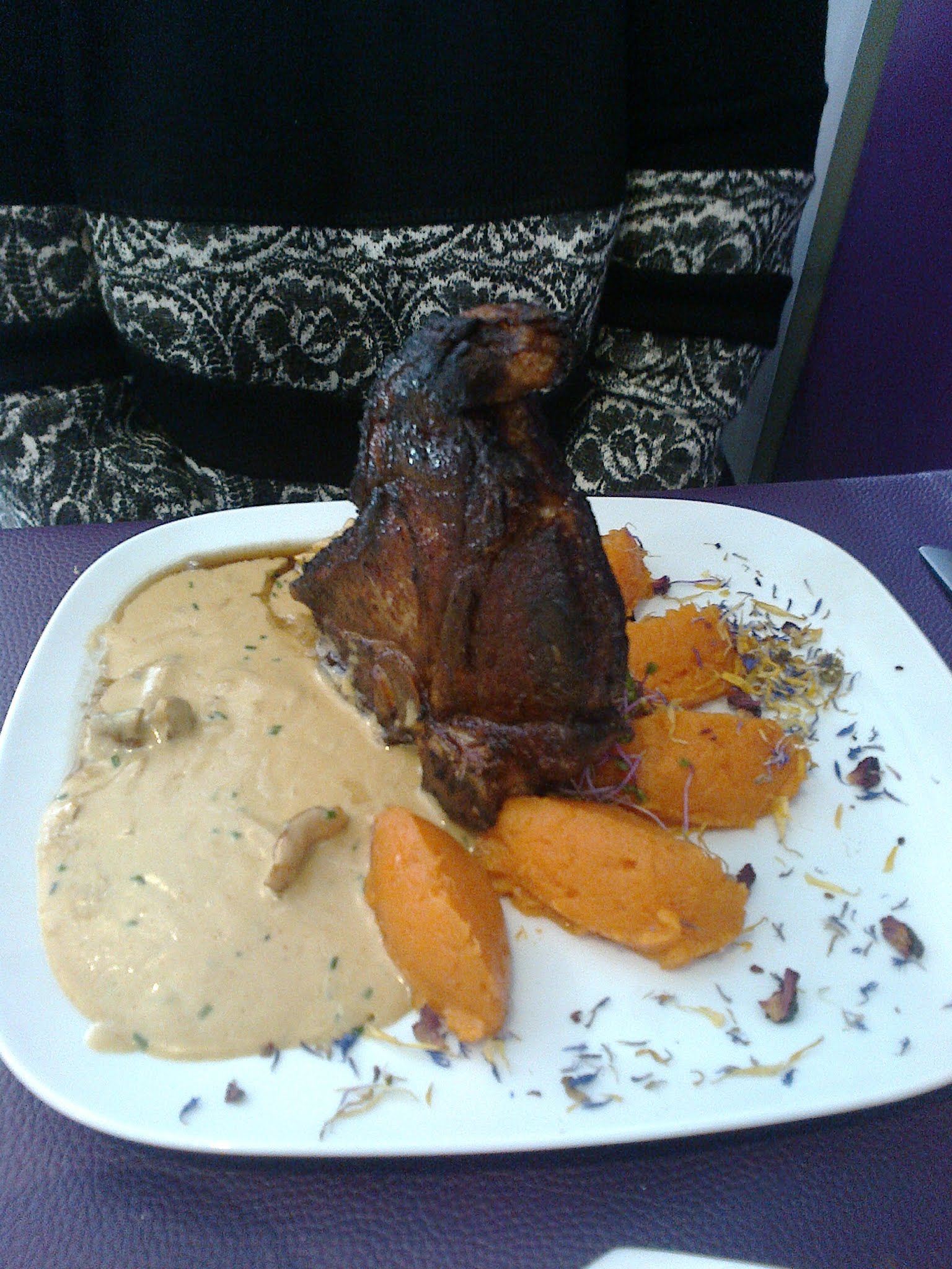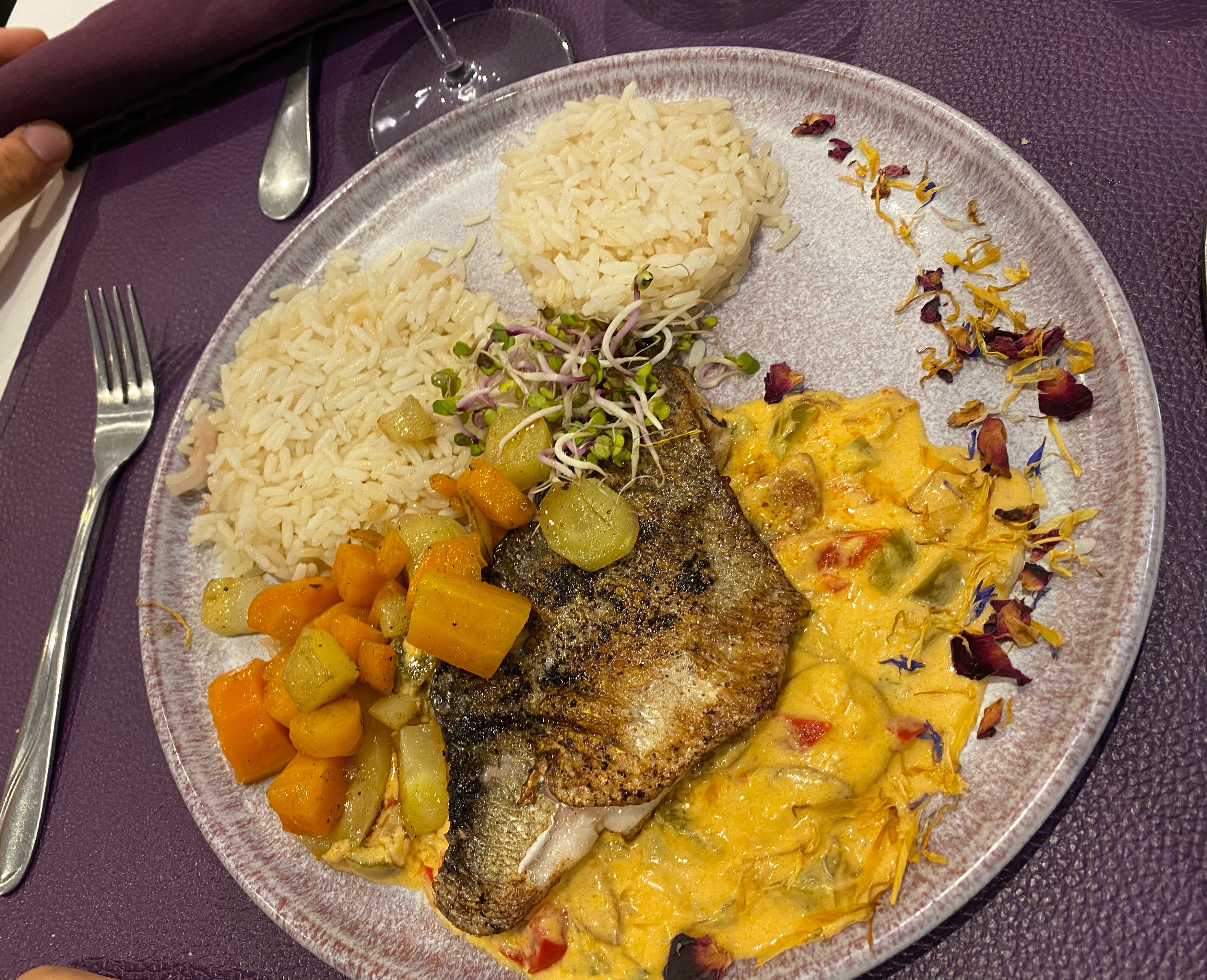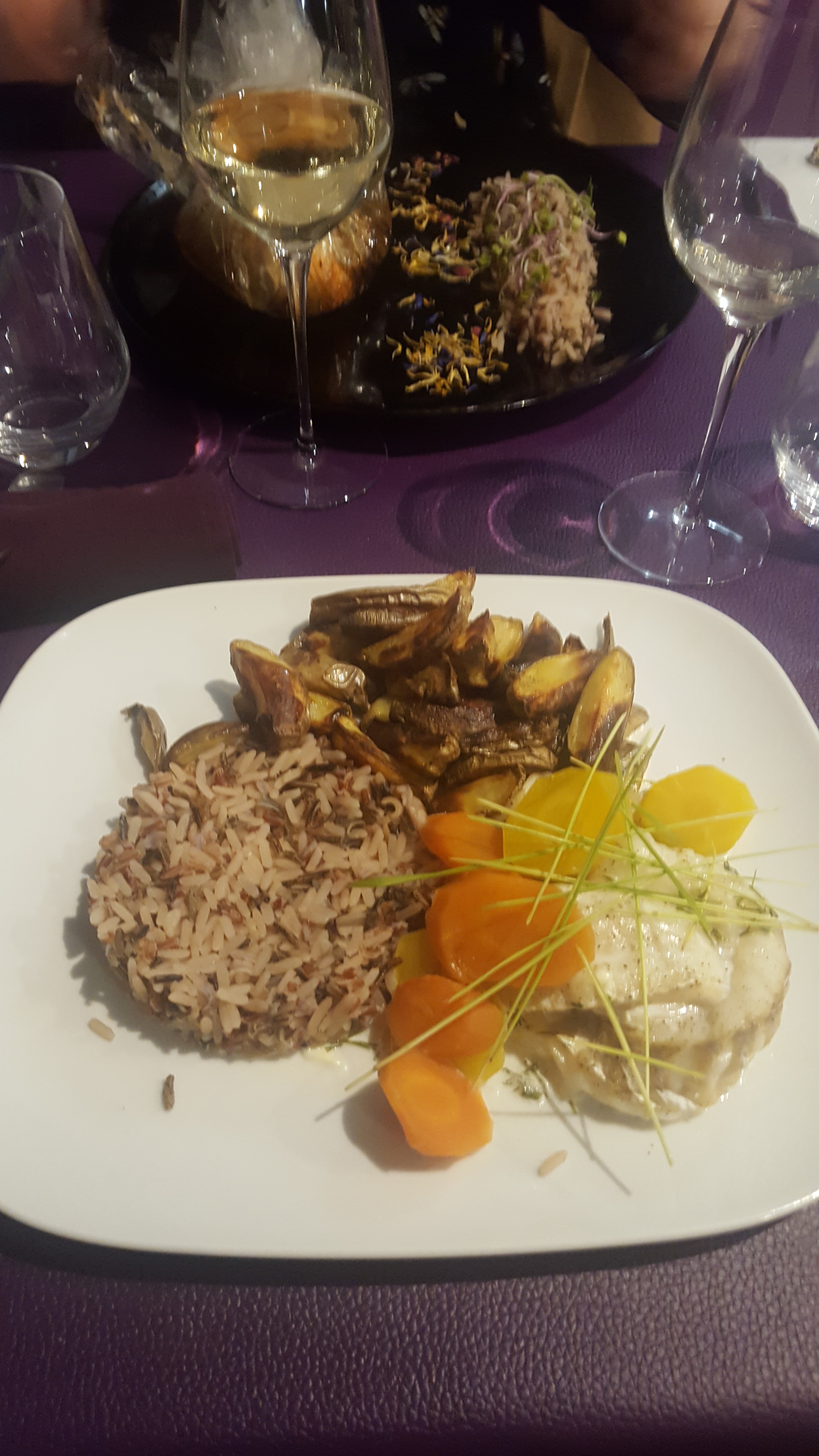 Mais quelle déception au regard des commentaires .... les plats sont basiques, pas cuisinés, insipides.... les annonces pompeuses, compotée pour de simples légumes en julienne, une jetée de raisins de corinthe sur une salade peu goûteuse qui accompagnait un roulé de poulet ? Un riz sans aucun goût. Enfin une corbeille de pain dont le fond mériterait un renouvellement pour le moins... En résumé, pas terrible mais pas mauvais. Excellent service en revanche