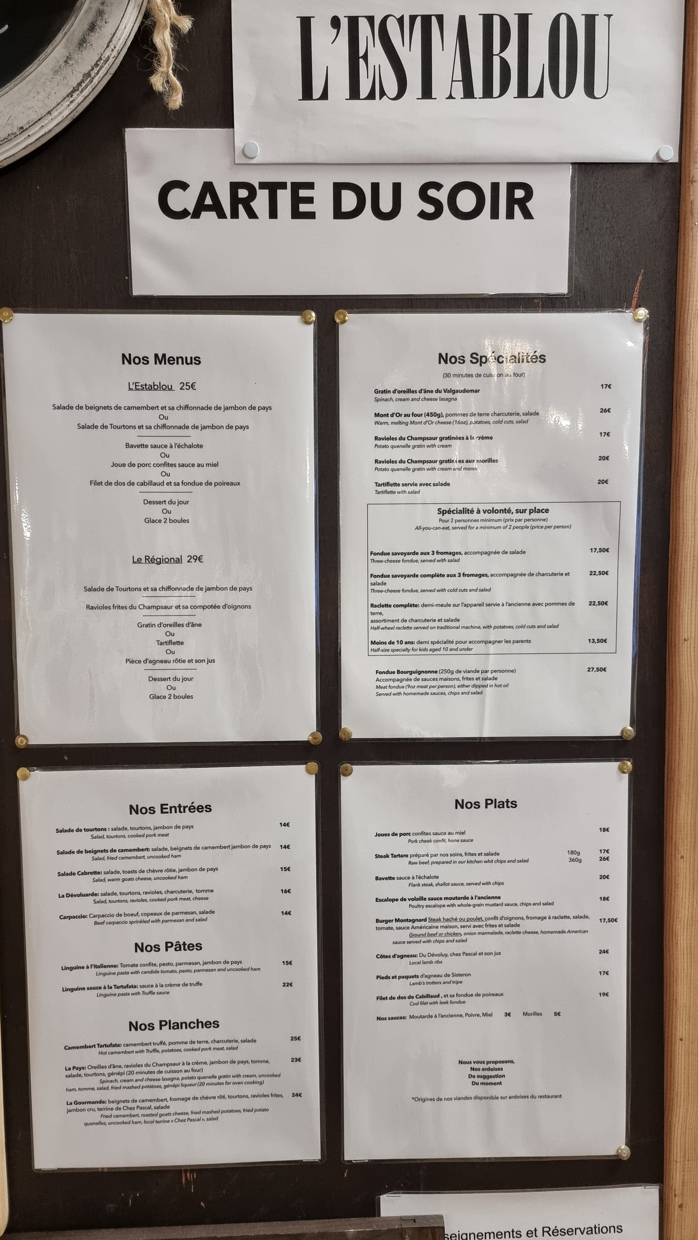 Je recommande se restaurent En vacances au ski à Superdévoluy nous avons tester plusieurs restaurant et notre seul regret et d’avoir découvert l’establou lors de notre dernière soirée... nous avons pris une planche très très copieuse et délicieuse et ma femme pareil, avec une cuisson parfaite comme à ma demande! Et le dessert vraiment très gourmand qui sont renouveler régulièrement . Je recommande vivement ce super restos ! Il ne faut surtout pas le loupé avec sa deco, sa cuisine et son équipe qui est présente agréable et qui connaît son métier ! Bravo nous avons rarement aussi bien mangé ! A l’année prochaine pour nous !