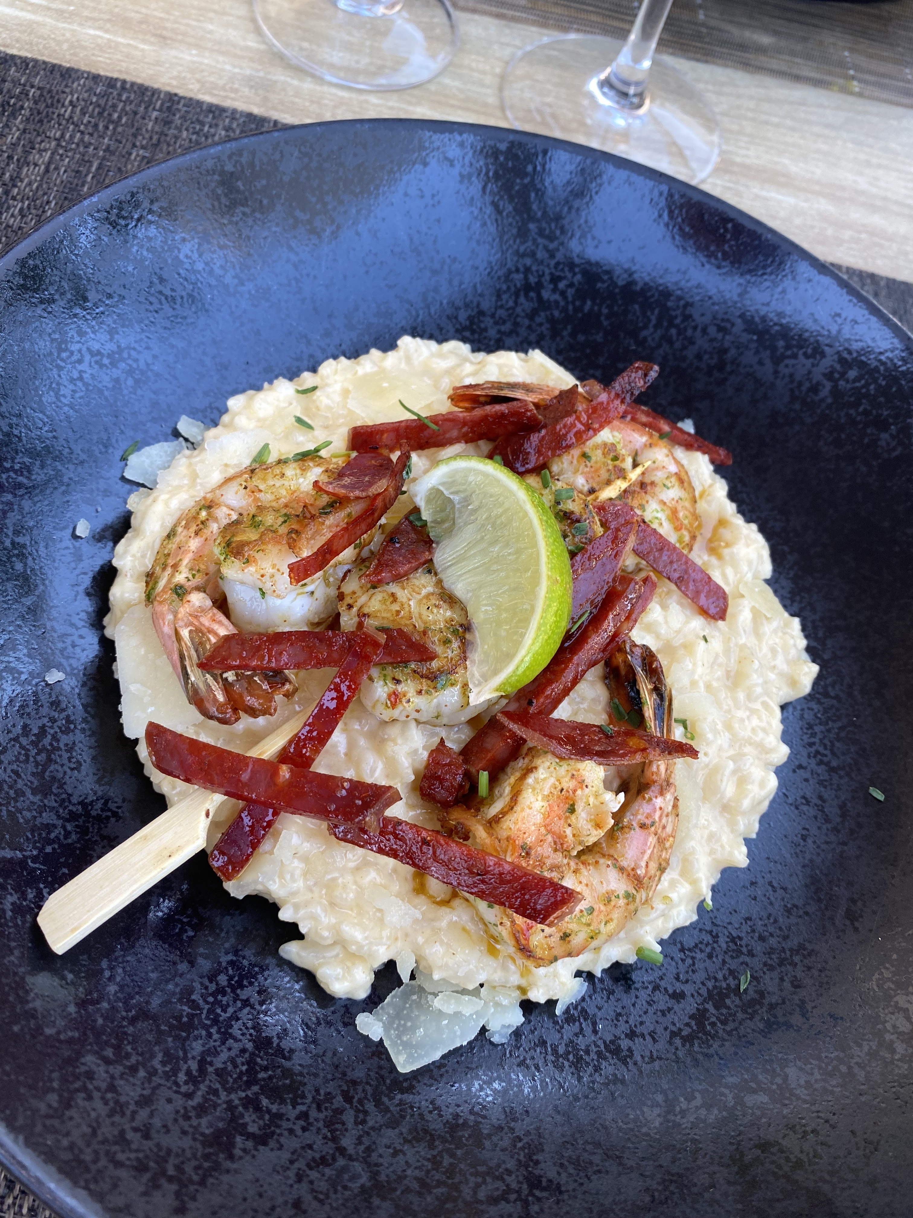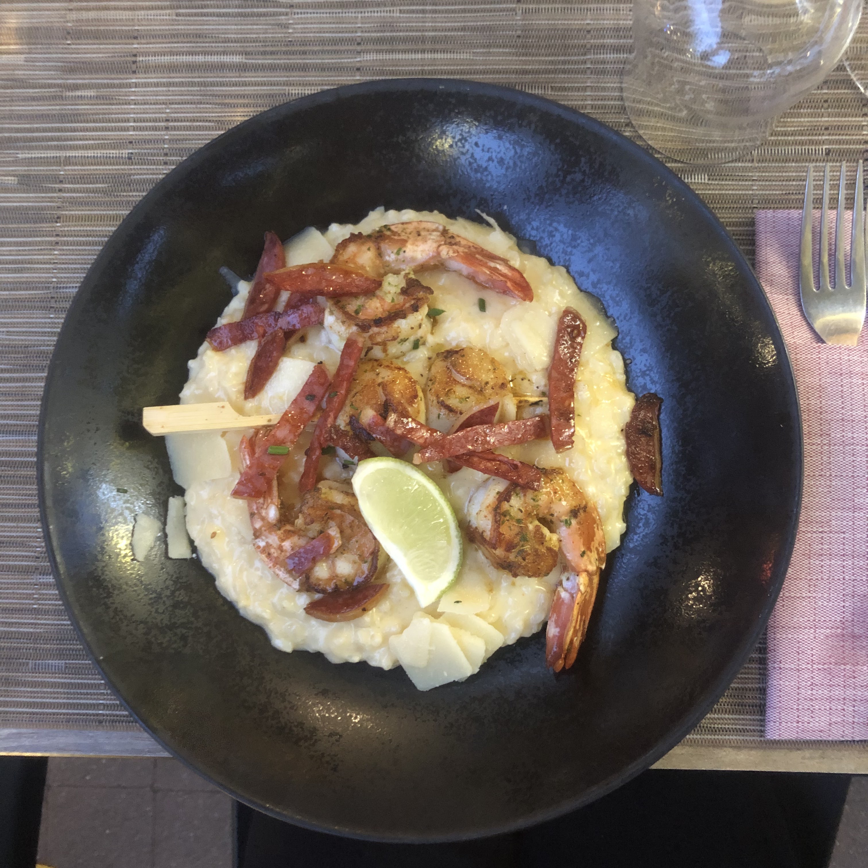 Un régal avec le risotto saint Jacques, crevettes et chorizo suivi d un café gourmand, c'était très bon, un super accueil et service ! Je recommande sincèrement