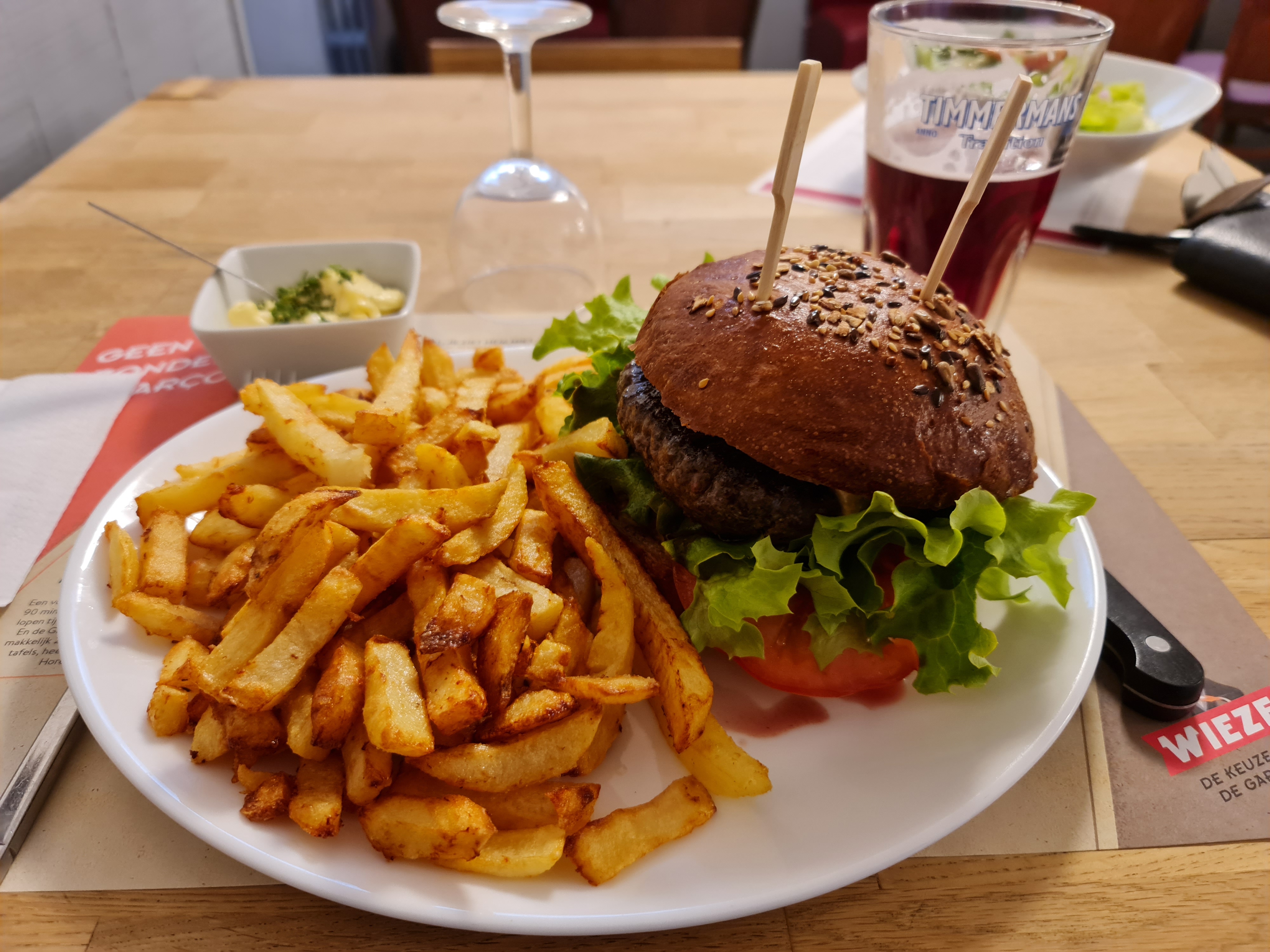Je n'aime pas du tout les critiques, mais ce restaurant le mérite. Même si je préférerais ne pas écrire de critique car l'année prochaine il y aura probablement plus de monde et nous ne pourrons plus avoir de table :-). Quel dommage que nous n'ayons découvert ce restaurant que lors de notre dernière soirée. Sinon, j'aurais pu manger ici tous les soirs. Nous avons eu un repas tellement délicieux et délicieux. Propriétaire sympathique (du moins je suppose que c'était le propriétaire). Plus tard, une jeune femme est venue à la table (elle n'y travaillait pas depuis si longtemps) et il a été très patient et poli pour lui apprendre les ficelles du métier. La nourriture était de très bonne qualité. Et c'était excellent. Et même nos filles (qui sont encore grincheuses à propos de la nourriture) ont eu un repas fantastique. 2x menu enfant (1x burger et 1x nuggets) 1x le burger au bacon 1x bavette (très tendre et non grasse) Le burger était vraiment fantastique. Bien achalandé et tout simplement frais. Hautement recommandé Le menu pour enfants avait également l'air bien. Certes, le hamburger du menu pour enfants n'était pas enfantin en termes de taille et de garnitures. Cette critique est plus que méritée.