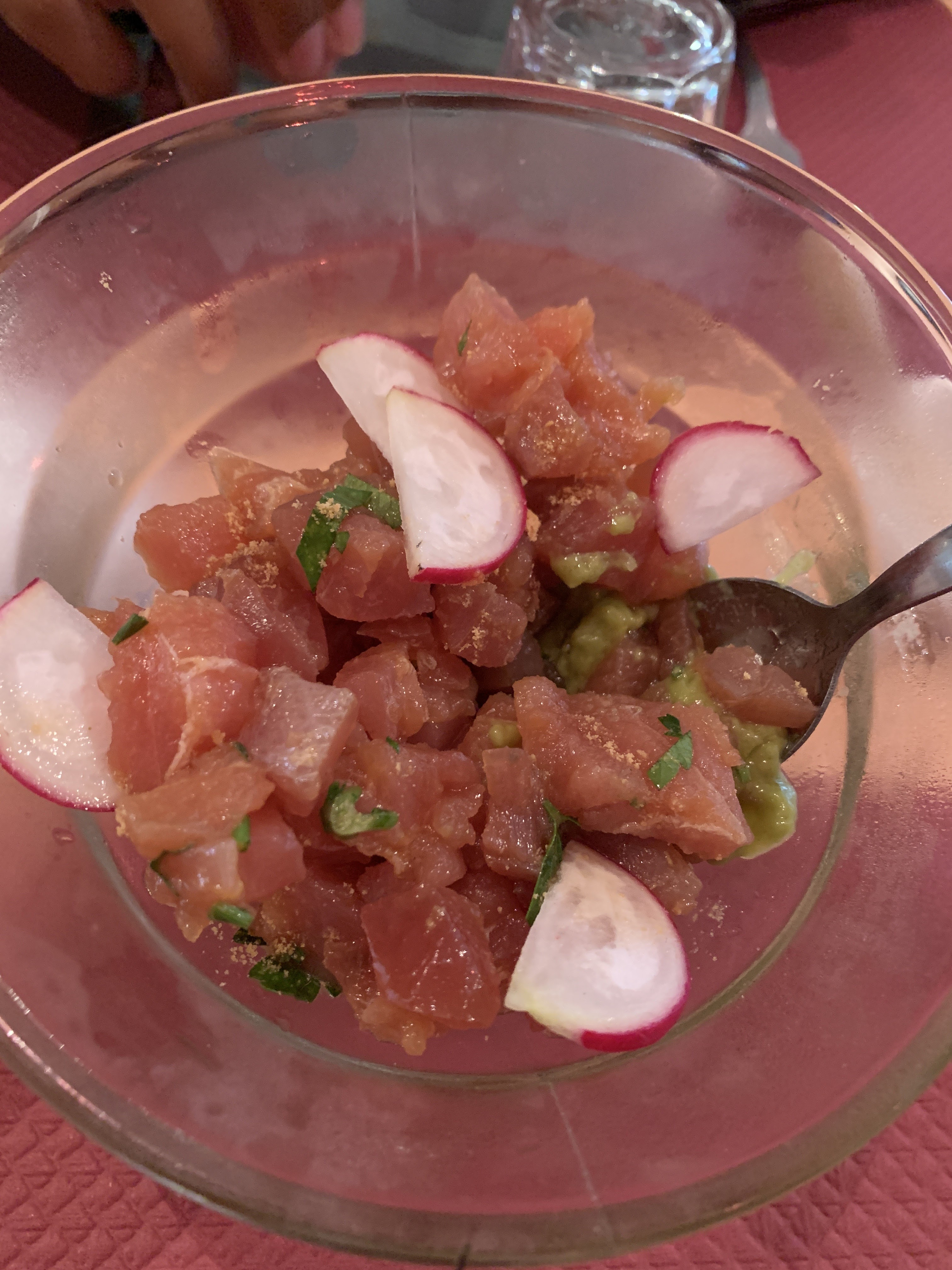 Entrée : Tartare de thon Beaucoup Trop salé et présentant peu de goût tout comme le guacamole trop huileux Plat: Tartare de boeuf Beaucoup Trop huileux et gras Burger chèvre et poulet Burger très bon et présentant une taille très convenable Pommes de terre grenailles trop grasses Assaisonnement de la salade potable voire un peu trop spécial Le restaurant présentait tout de même un très bon café et une serveuse agréable, accueillante et toujours souriante. Reste à l'écoute du client