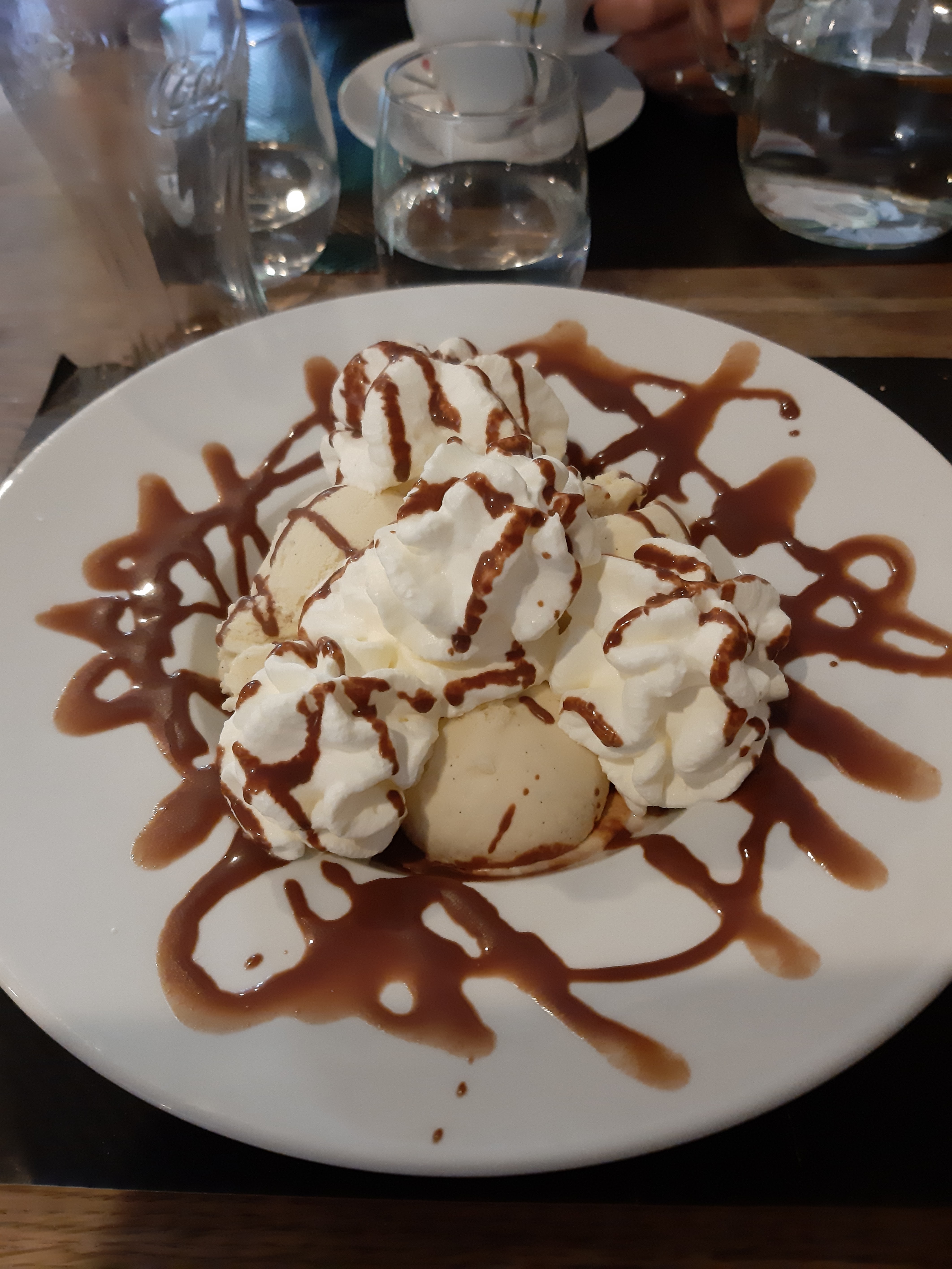 Désolé mais...filet américain insipide, frites trop cuites et trop sèches et trop de vinaigrette dans la salade. Quant aux profiteroles trois monstres avec chantilly à foison et glaces vanille sans goût ( mais que l'on m'a offert). Bref, pour moi y boire un coup oui, y manger non.
