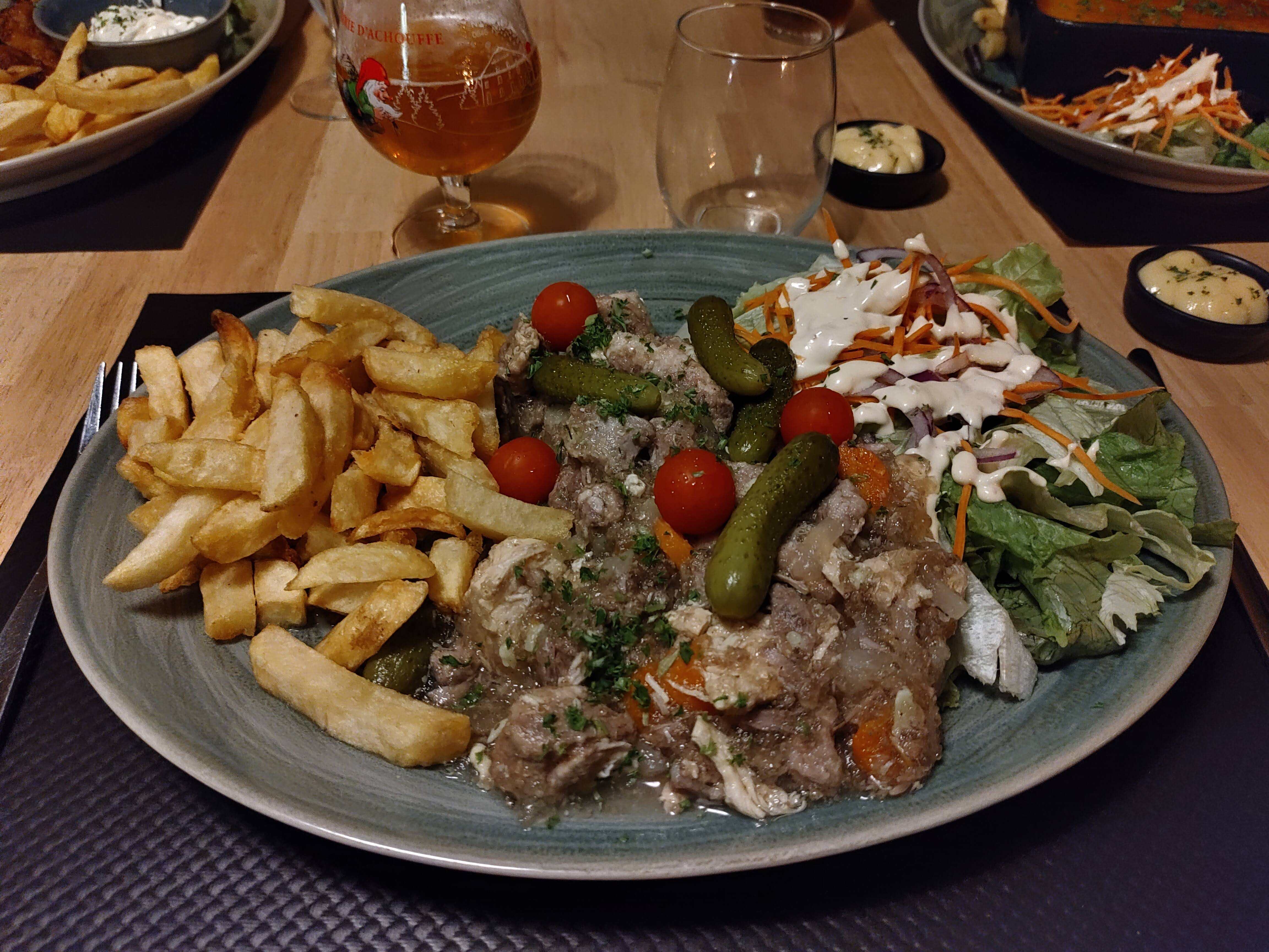 Un potj' d'une bonne maison, très copieux. Des frites au gras de bœuf, une bon secours de Noël pour faire passer le tout, bref une belle découverte ! Sans oublier le cadre, la terrasse pour l'été et la sympathie de l'équipe... Tout est réuni ici pour passer un bon moment