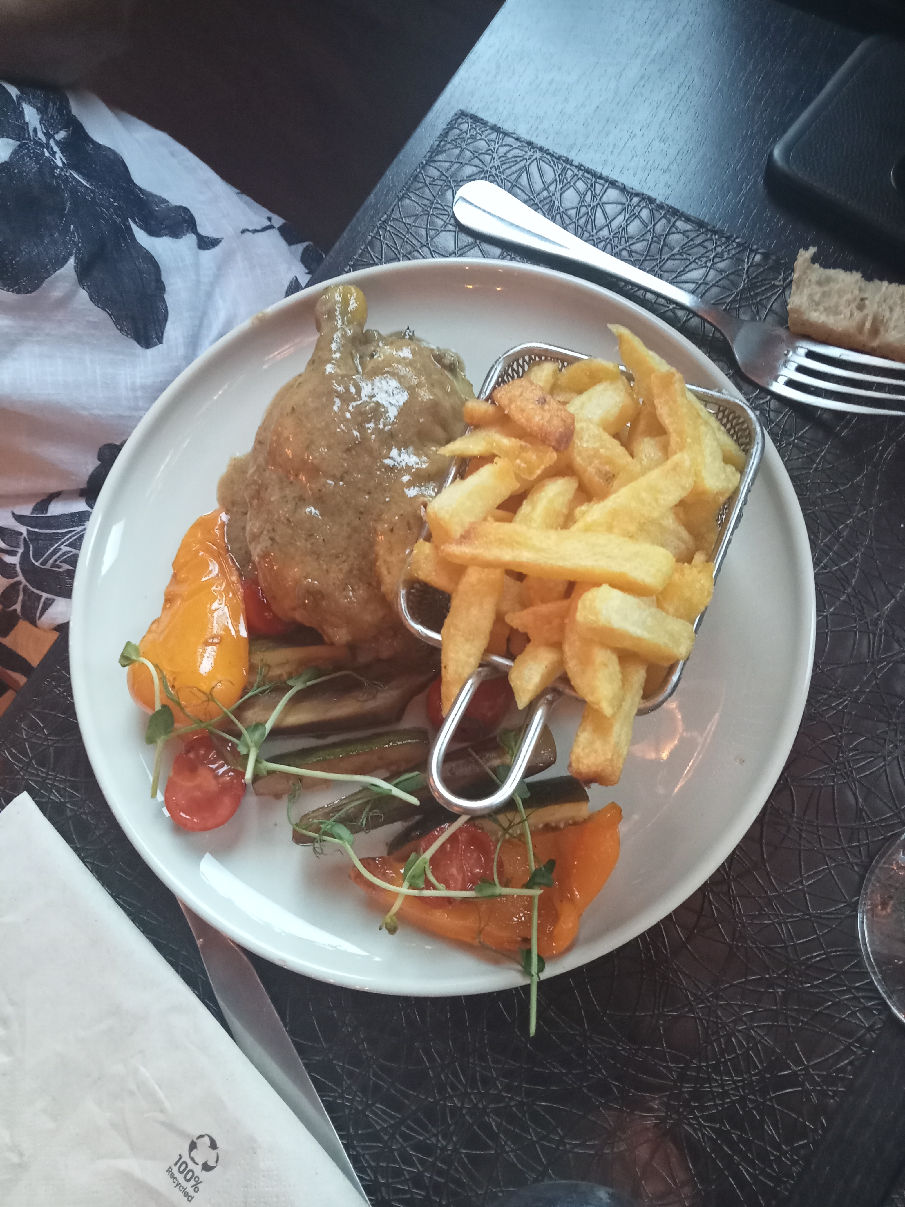 Nous avons pris une cuisse de lapin chasseur avec des champignons et un écrasé de pommes de terre un délice je recommande ce restaurant