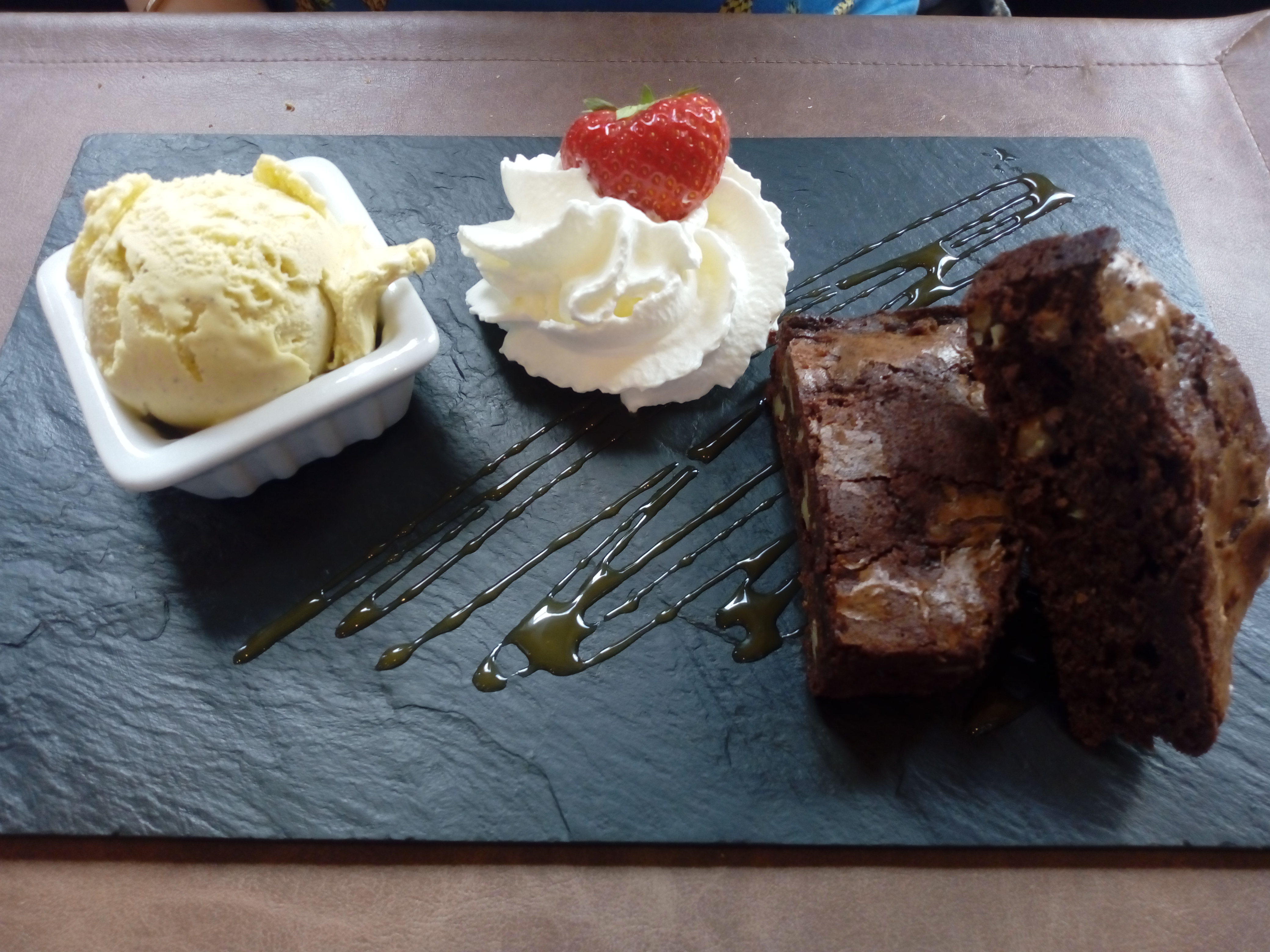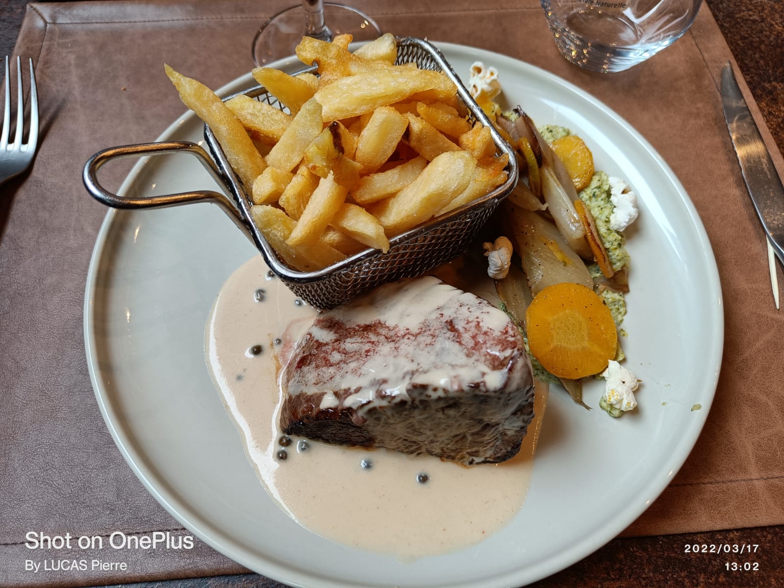 Malgré qu il soit complet, on nous a permis de manger en terrasse, sympathique, un pavé de bœuf accompagné de frites, sauce au poivre à se lécher les babines, je recommande vivement... Dure de repartir à moto, le coco plein..😄😄