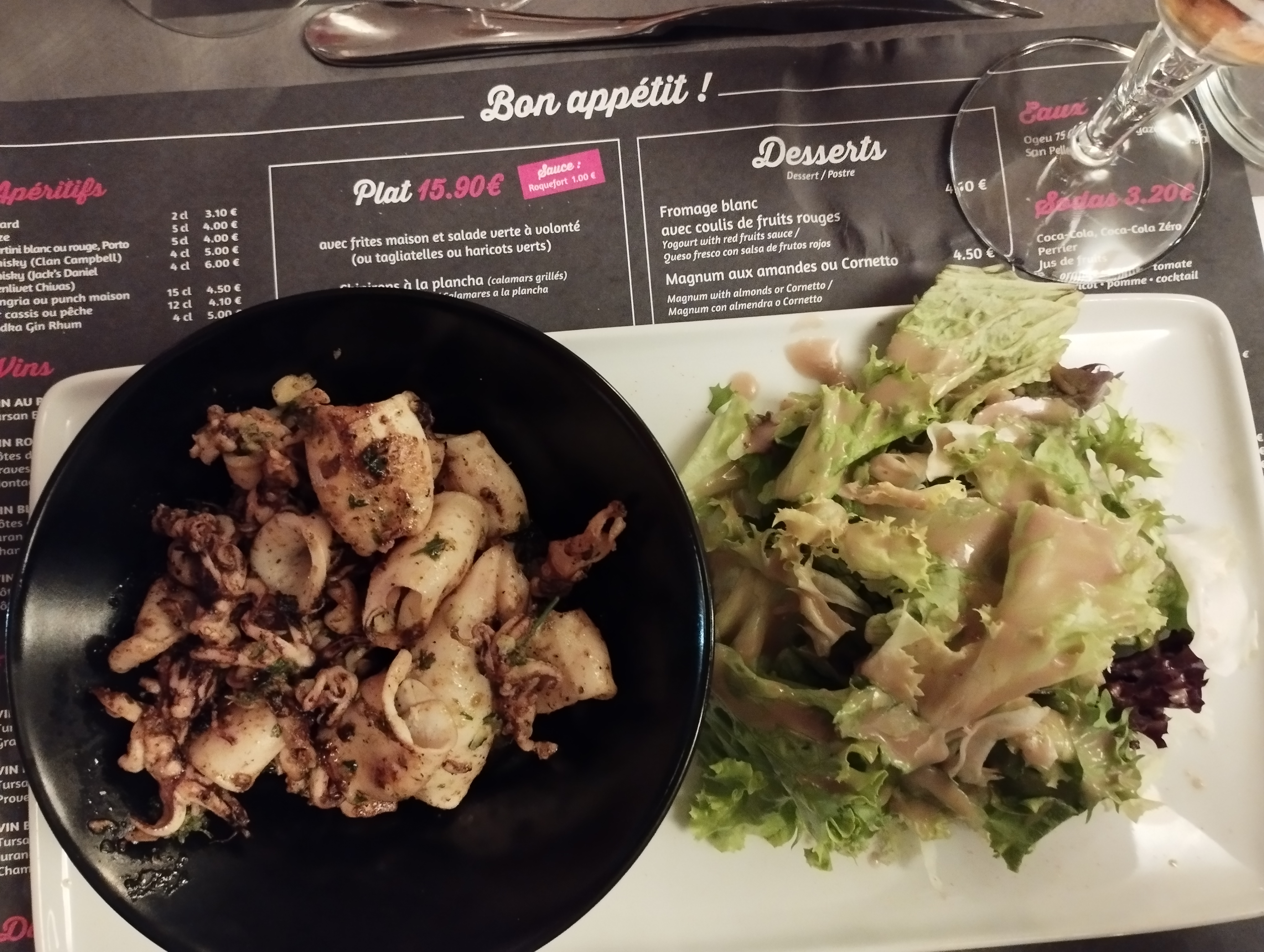 Au top. Chipirons parfait. Le dessert une mousse au chocolat super bonne !