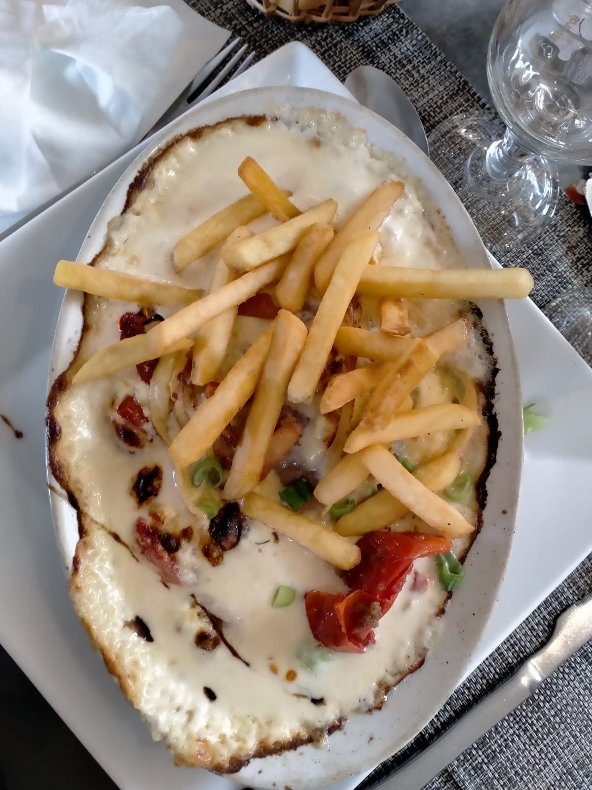 Malgré les 14 heures passées ma dernière chance de manger ce midi tous les autres ne servait j'ai eu le droit au plat du jour et avec le sourire la gentillesse et la serviabilité en plus les frites un peu trop cuite pour moi, mais en fin de service on va parler non plus, un menu complet café y compris, avec fromage et dessert s'il vous plait, une bière ambrée pour moi locale, extraordinaire, la chance d'être tombé là... Pour le dessert un tiramisu framboise renversant, et tout est fait sur place sauf les éclairs (pâtisserie), profitez du reste .. un plaisir.