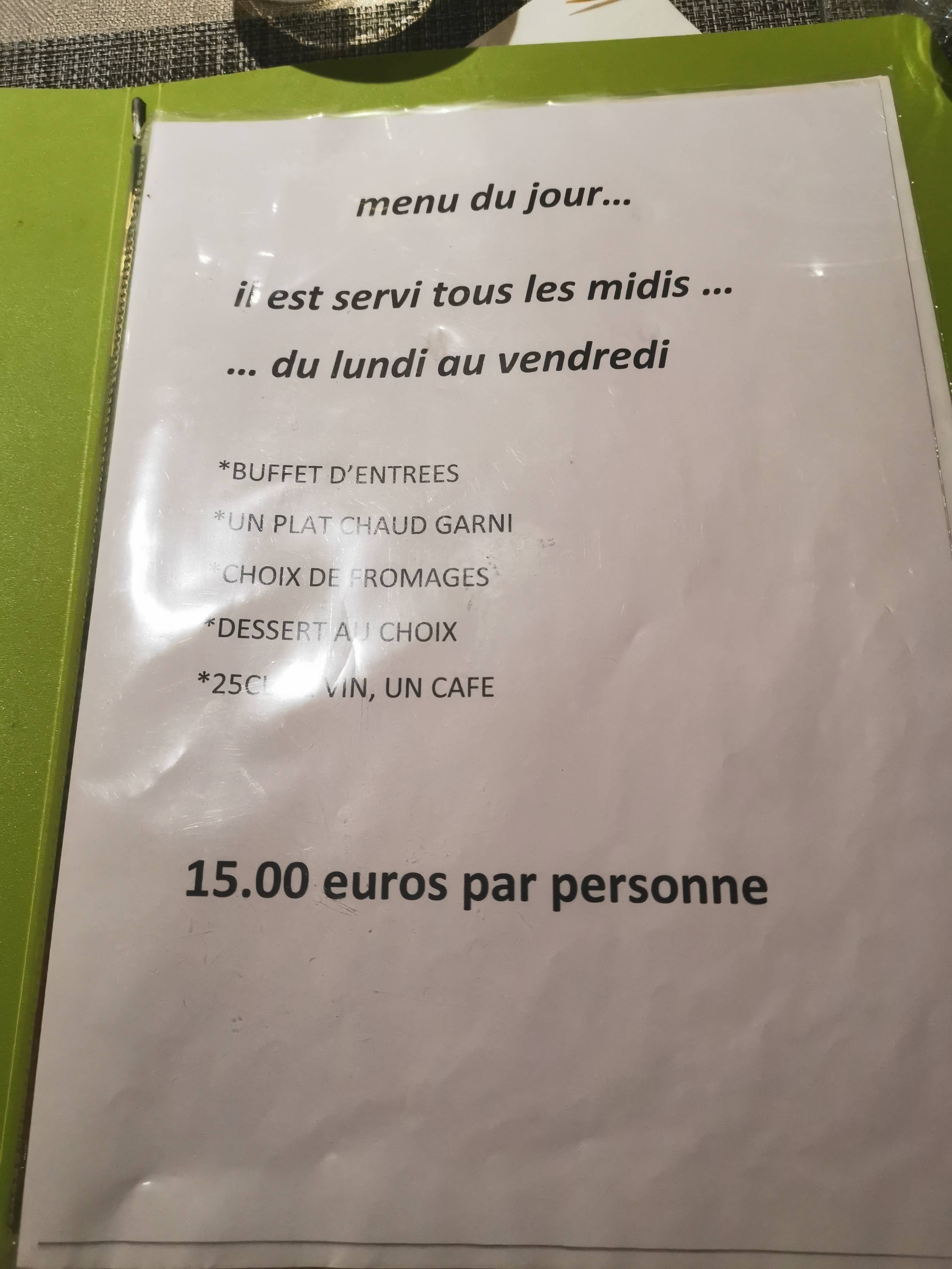 Génial👌 Nous avons pris un menu à 16€ cela comprenait : Grand choix de salades au buffet Un demi-litre de vin Autant d'eau que vous voulez Plat du jour (viande tendre avec une délicieuse sauce et quelque chose de français qui ressemblait à des œufs brouillés) Plateau de yaourt ou de fromage Grand choix de desserts Donc un très bon rapport qualité-prix. Au final, on pensait que la femme s'était promise xD.
