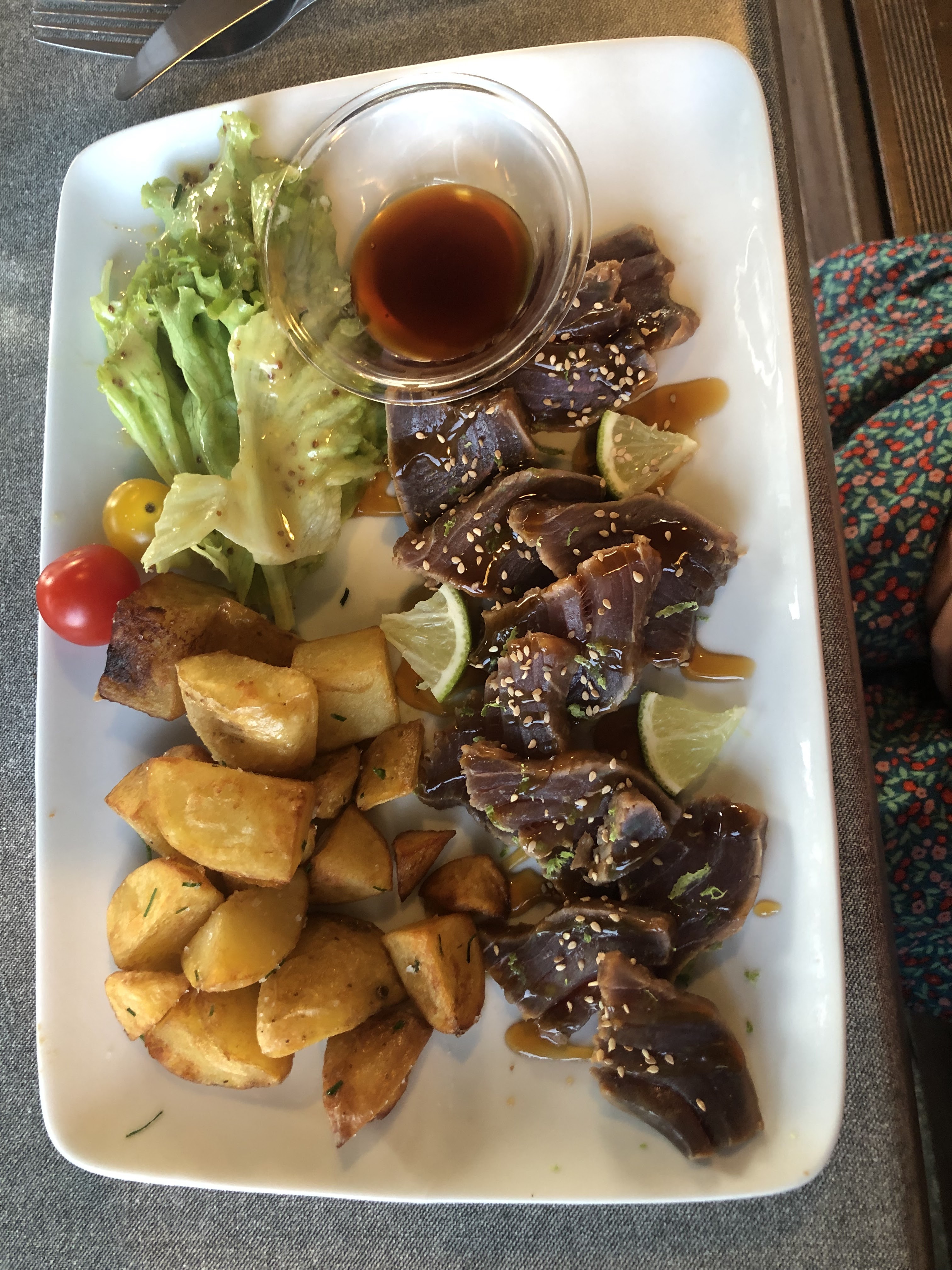 On s'est régalés ! Nous recommandons le tataki de thon, cuit à la perfection ainsi que la morue dans une sauce aïoli au miel et pignons, très originale et gourmande. Le tout accompagné de pdt frites à la fois croustillantes et fondantes,un régal. Il faisait plus de 30° mais nous étions bien sur la terrasse arrière, aérée et ombragée.Les chiens sont acceptés et bien reçus (toutou bar à disposition). Il y avait du monde, il est prudent de réserver. Nous reviendrons, c'est sûr.