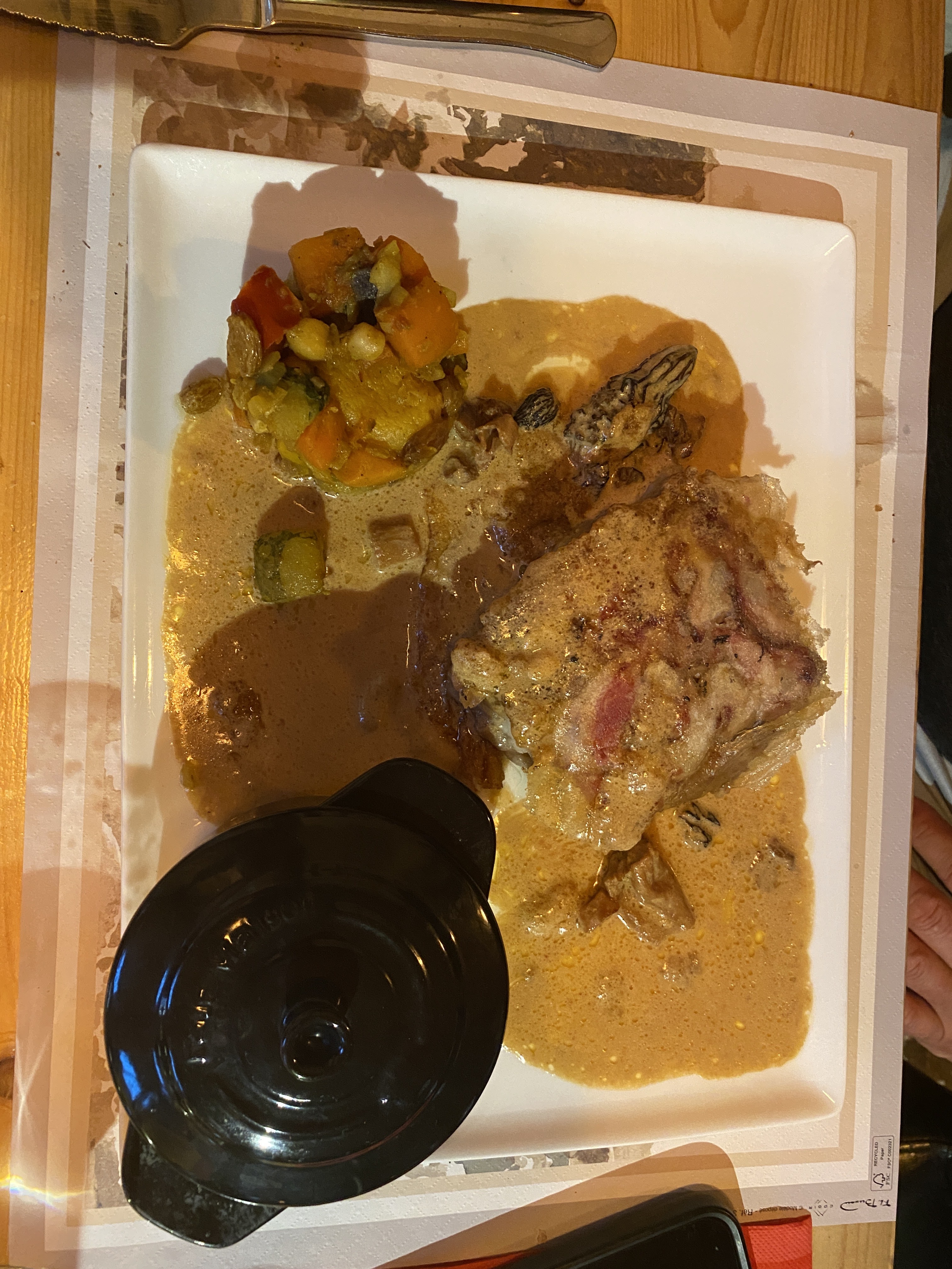 Le repas a été excellent, tant le feuilleté aux St Jacques que le poulet aux morilles très bien cuit. A refaire donc.