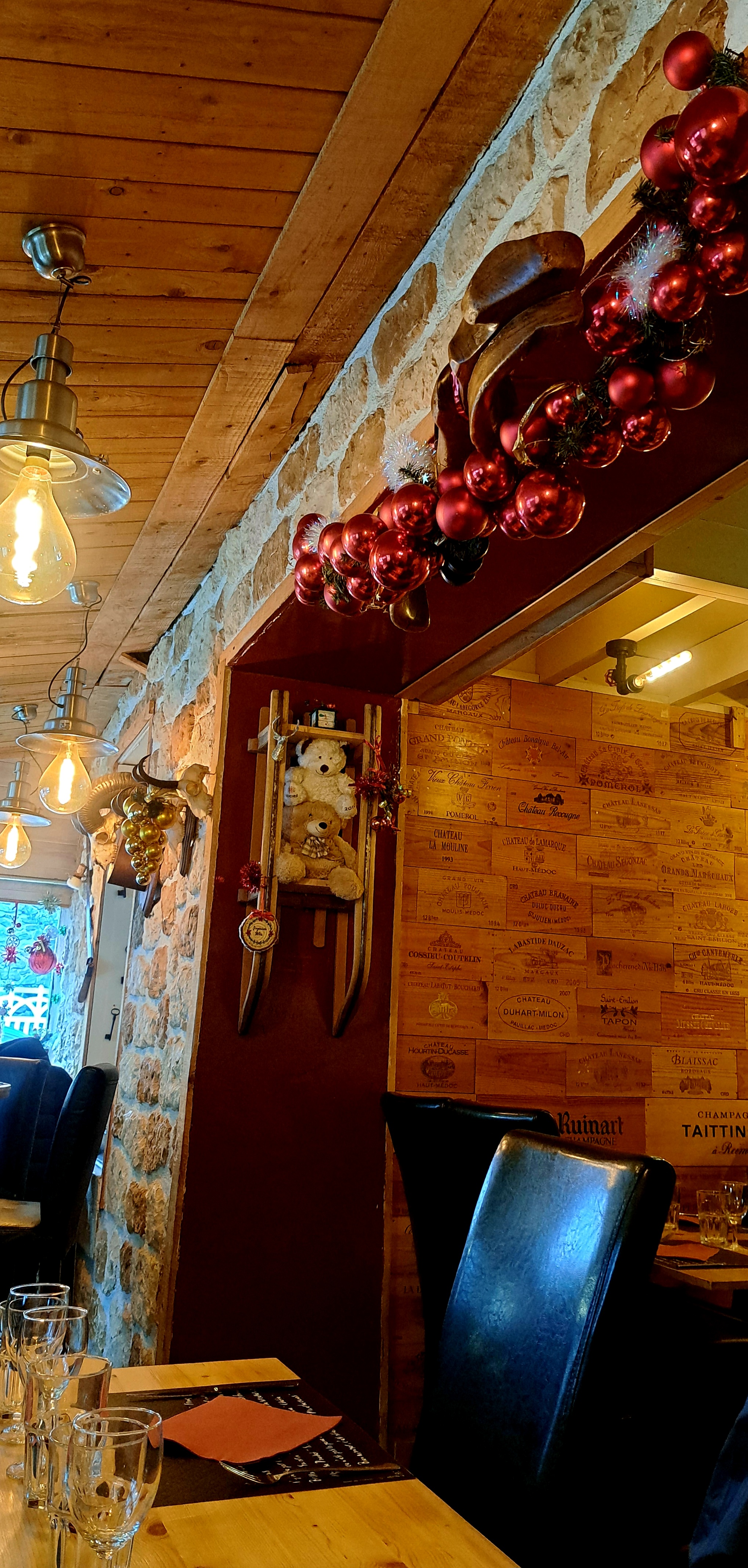 Décoration montagnarde chaleureuse comme on les aime ! Le coq au vin était très bon, je recommande. Personnel très aimable. En février, il vaut mieux réserver à l’avance car peu de place à l’intérieur.