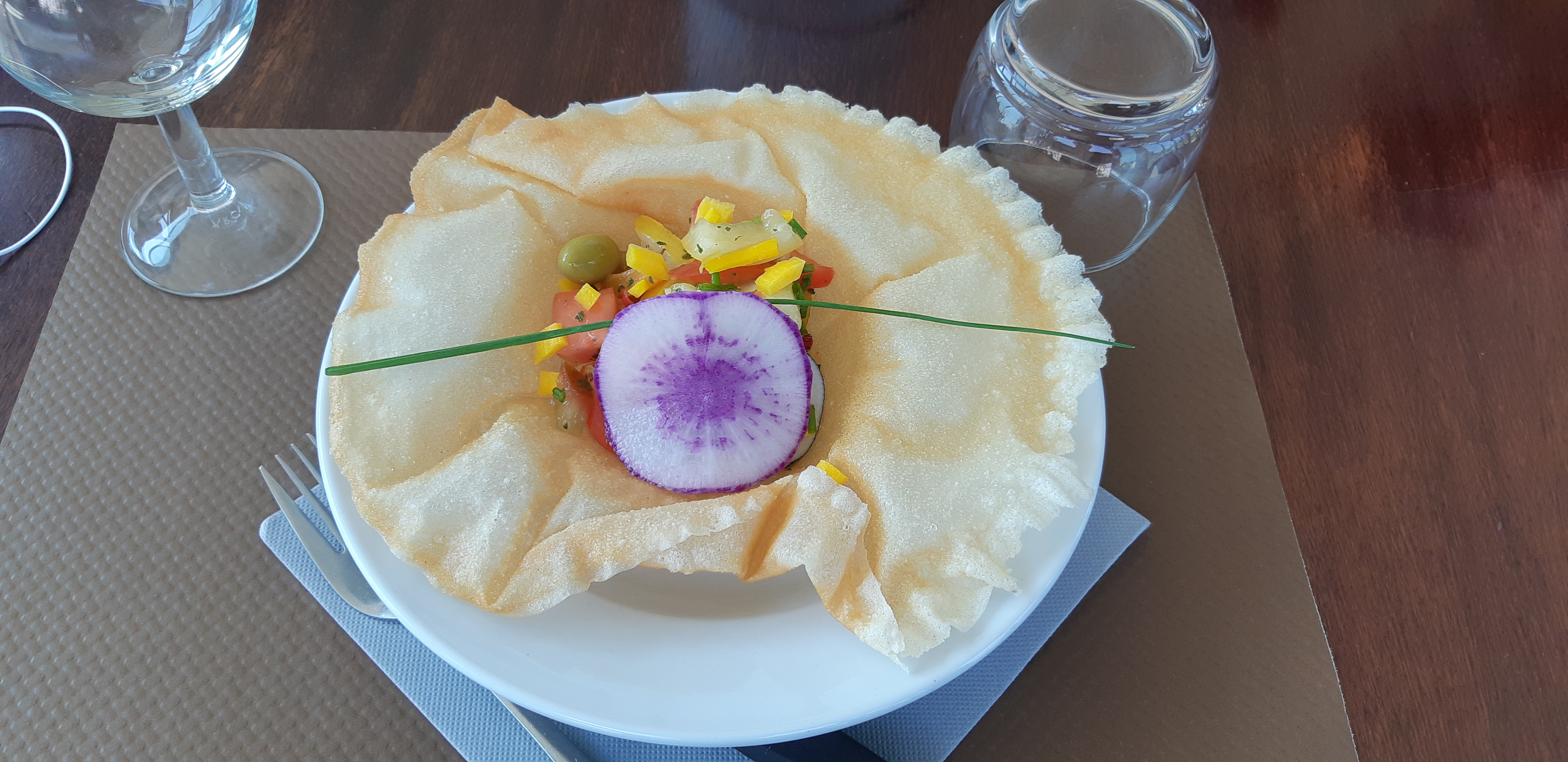 Mathieu nous accueille avec un delicieux menu ds un cadre de paix.. três belle rencontre avec terrasse ext et couché de soleil.. rien ne fait oublier les goûts au plaisir du palais.Finesse, délice et charme!! Place assise bien ouverte.. !!!