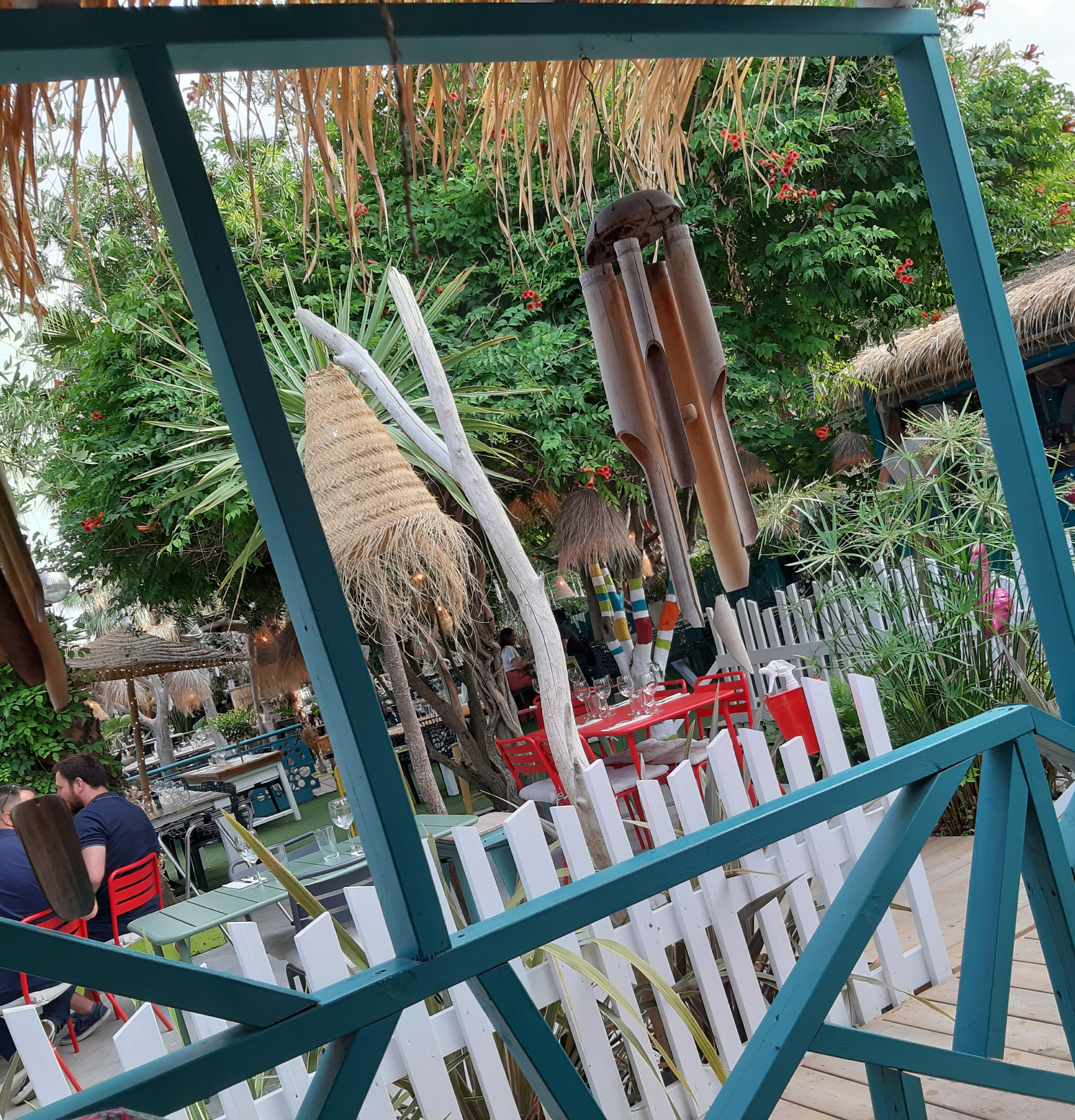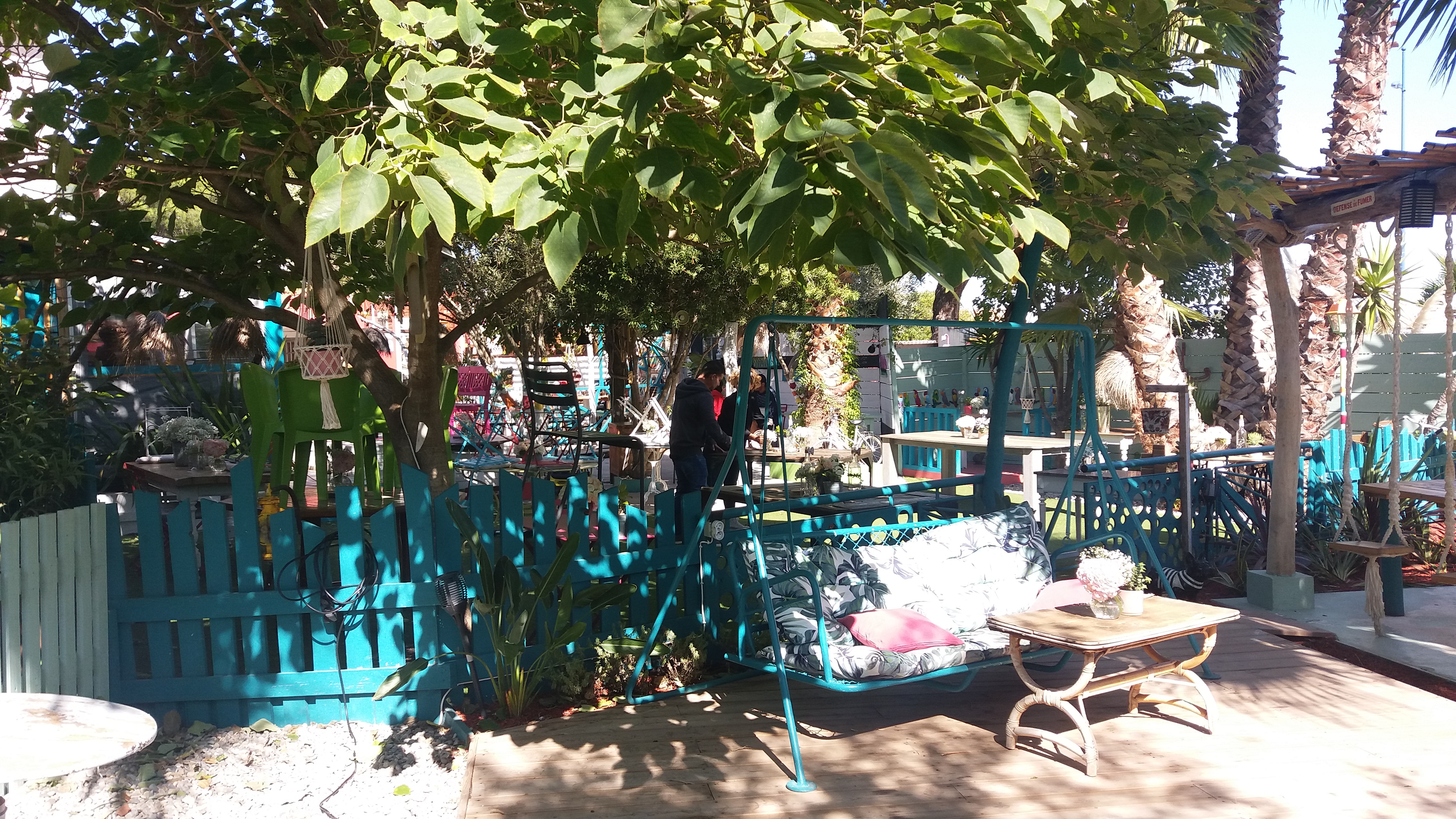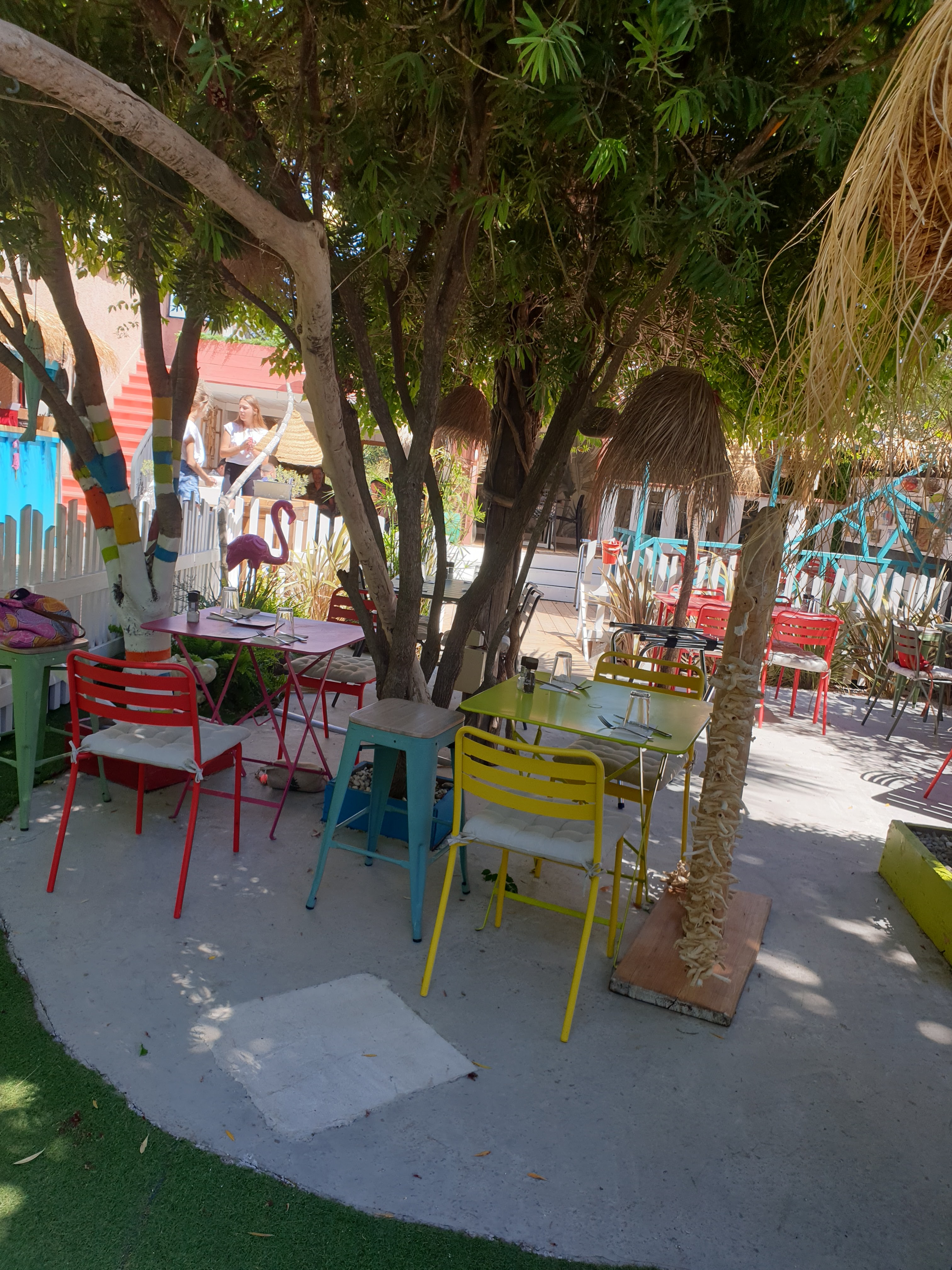 Une terrasse ombragée, du mobilier dépareillé, décalé..un décor très coloré, un petit côté ambiance paillotte outre-mer.. j'adore l'idée que la terrasse se soit adaptée à son environnement végétal et non l'inverse. Un accueil et service très chaleureux. J'ai beaucoup apprécié, hâte d'y aller en soirée..