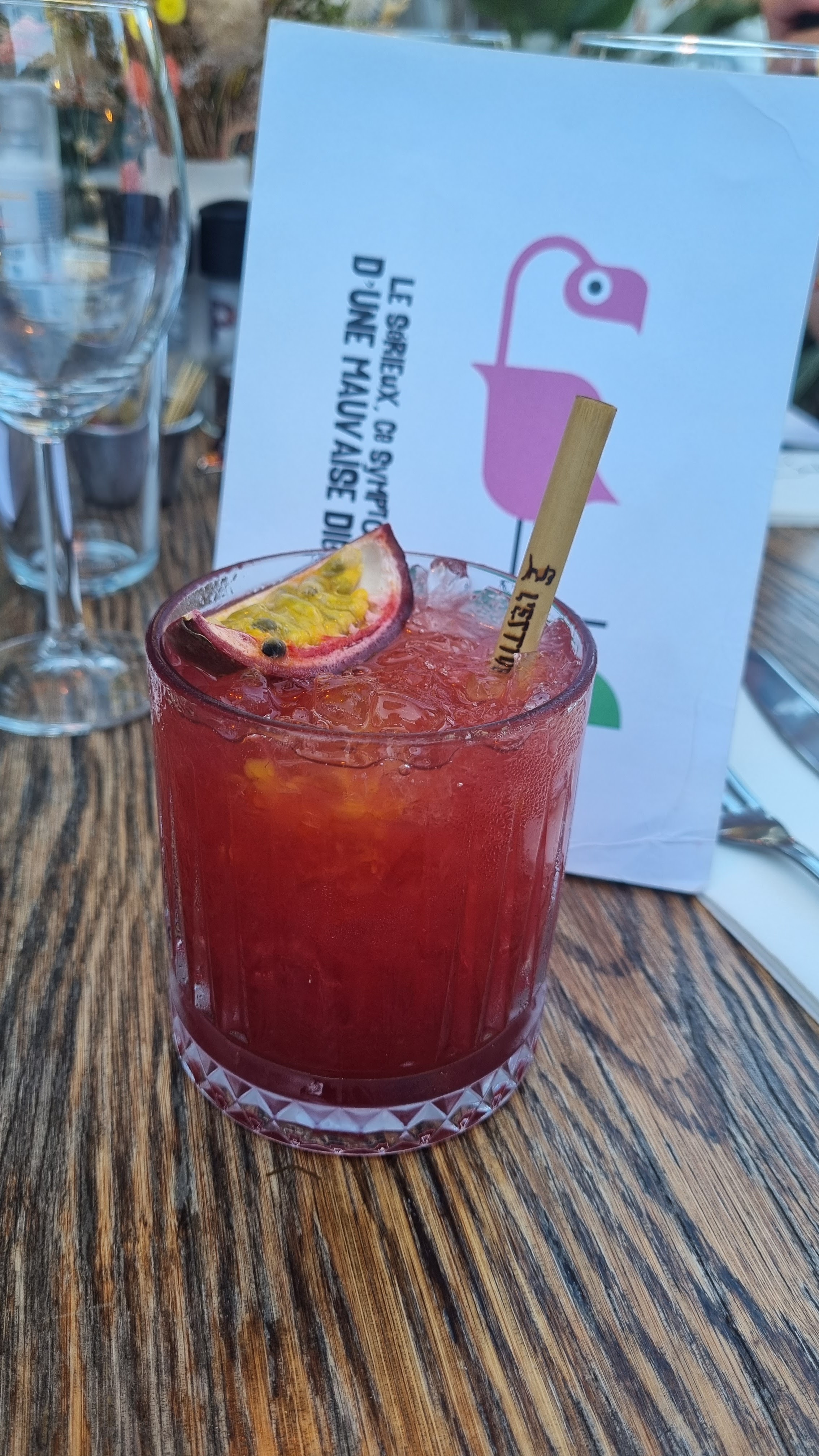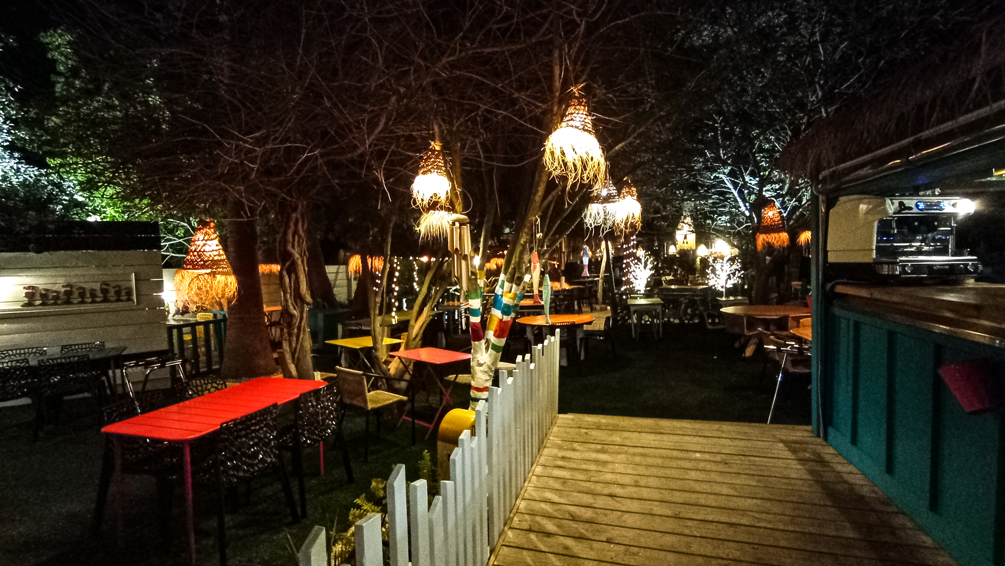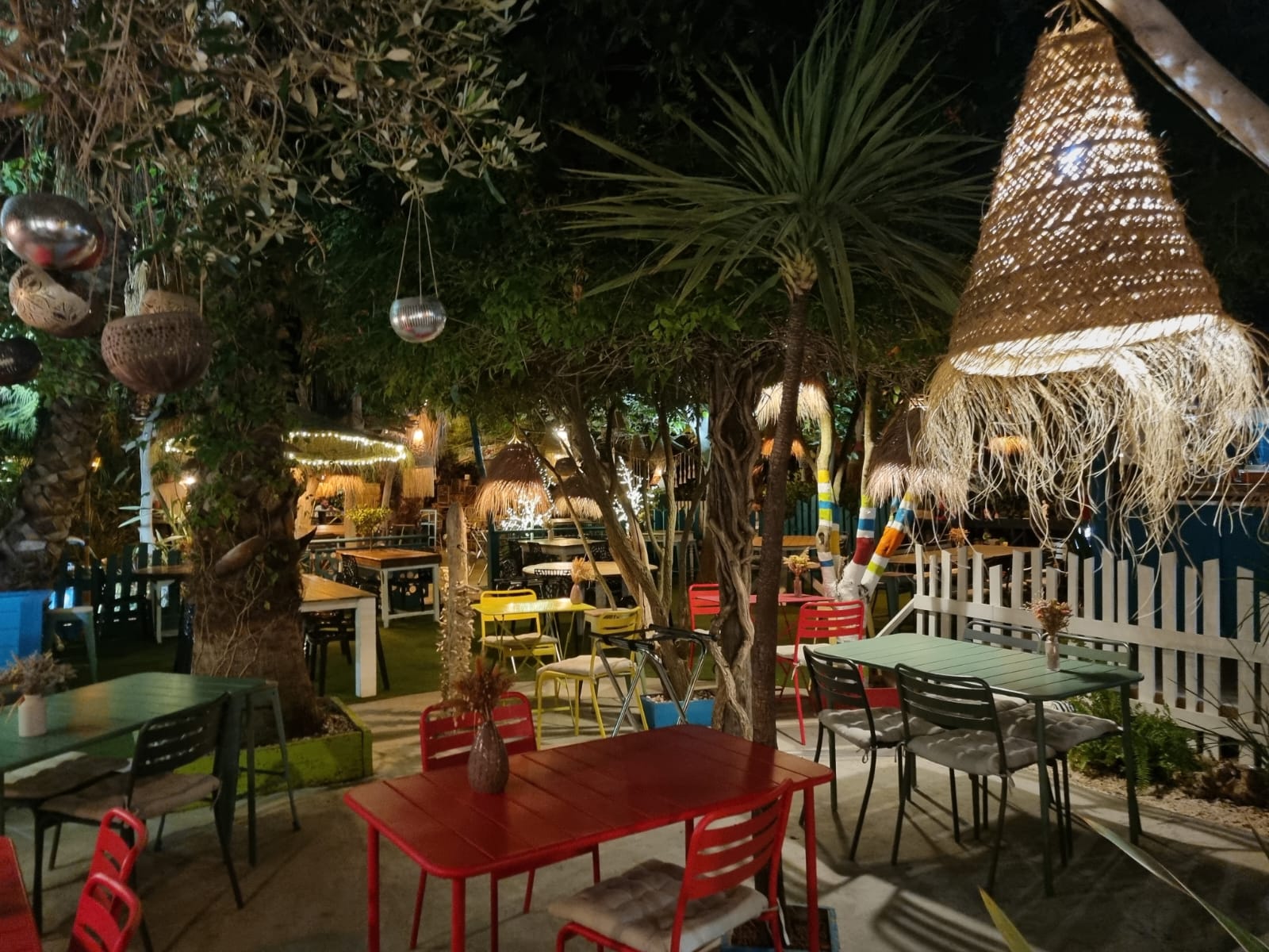 Une terrasse ombragée, du mobilier dépareillé, décalé..un décor très coloré, un petit côté ambiance paillotte outre-mer.. j'adore l'idée que la terrasse se soit adaptée à son environnement végétal et non l'inverse. Un accueil et service très chaleureux. J'ai beaucoup apprécié, hâte d'y aller en soirée..