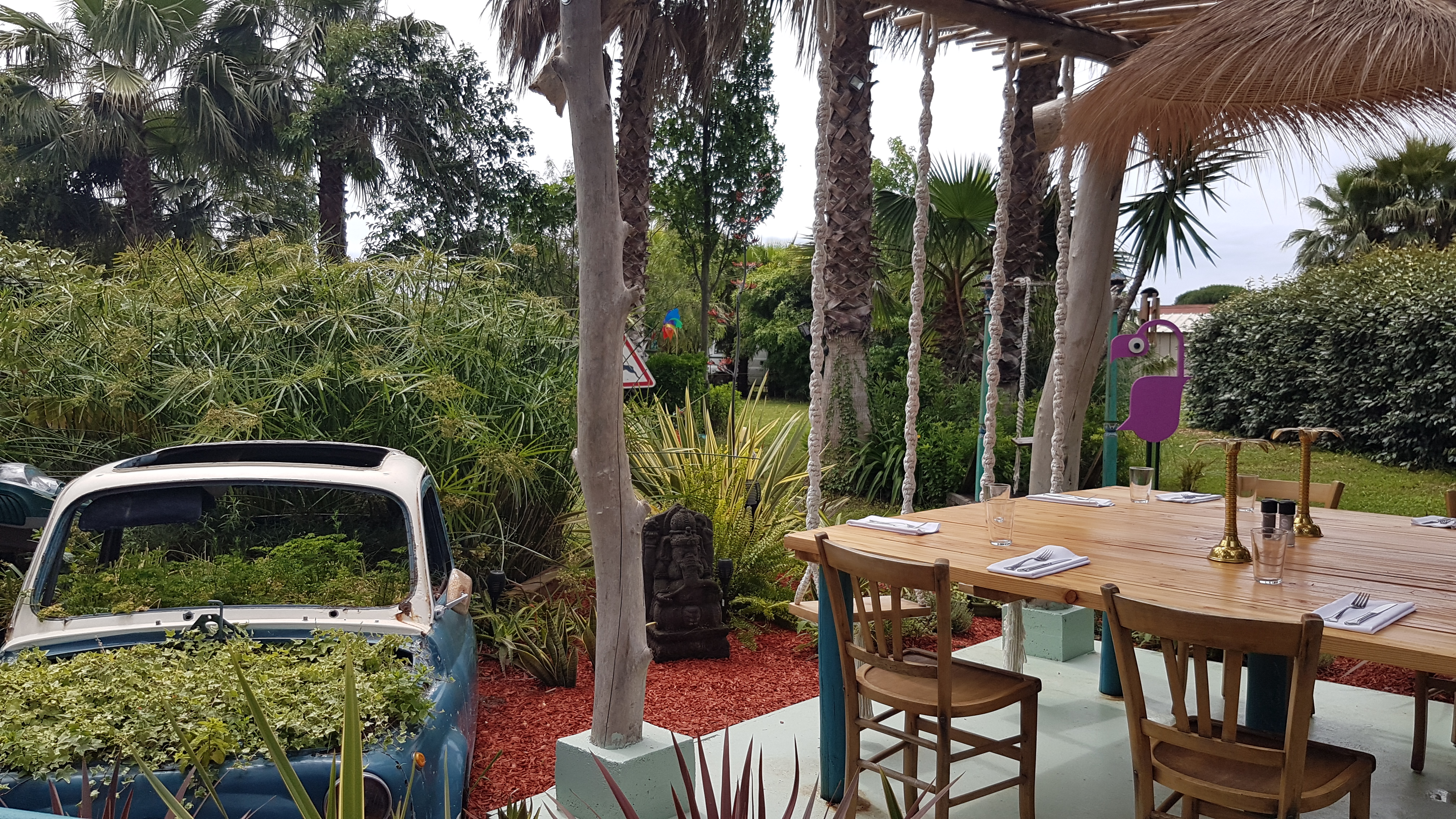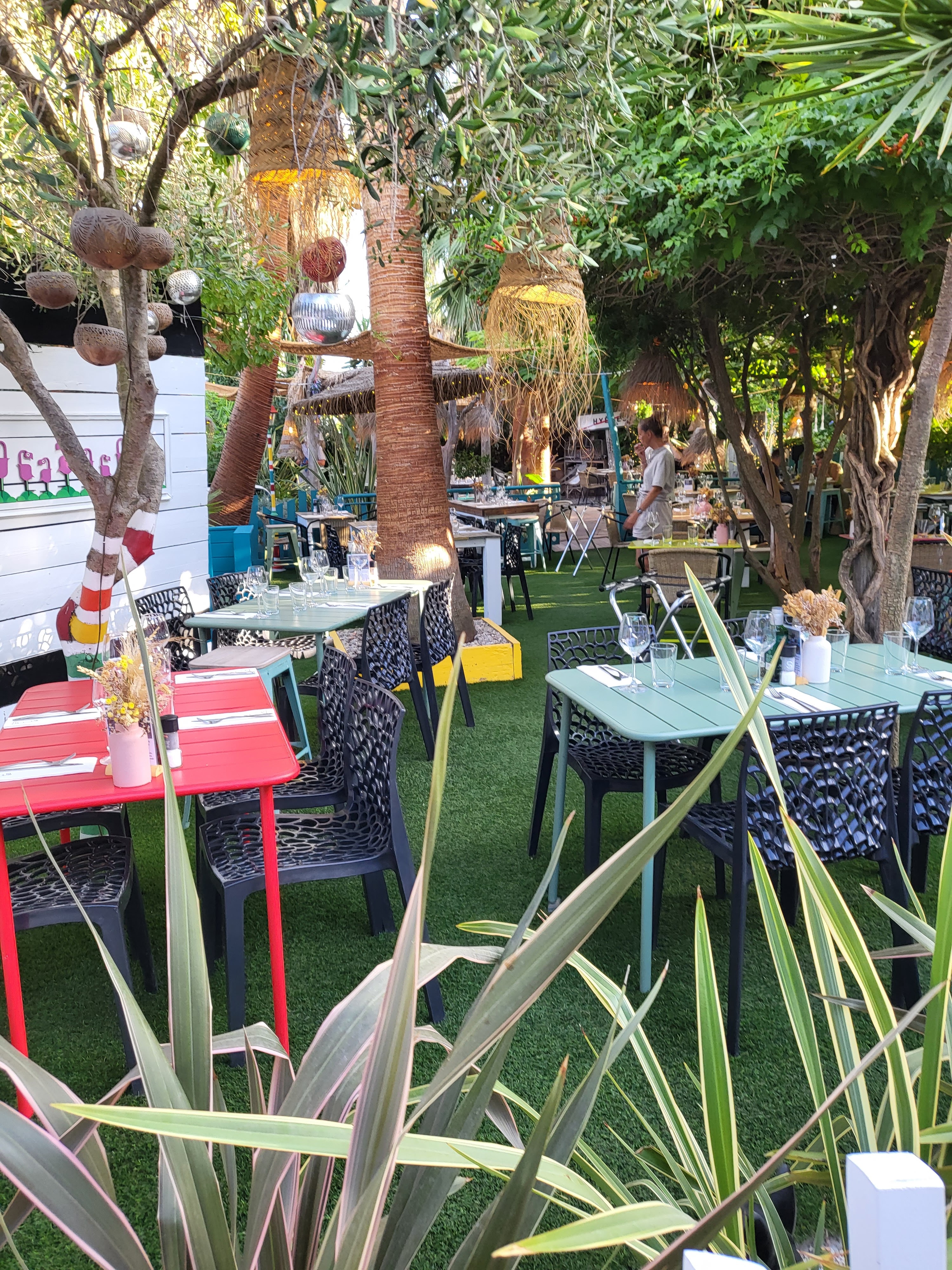 Lieu improbable à Hyères, plein de charme, on mange à l'ombre des arbres et sous la protection des brumisateurs en cas de forte chaleur. Le personnel est très aimable et souriant, les plats sont véritablement très bon. À recommander le midi et le soir quand il n'y a pas de moustique.