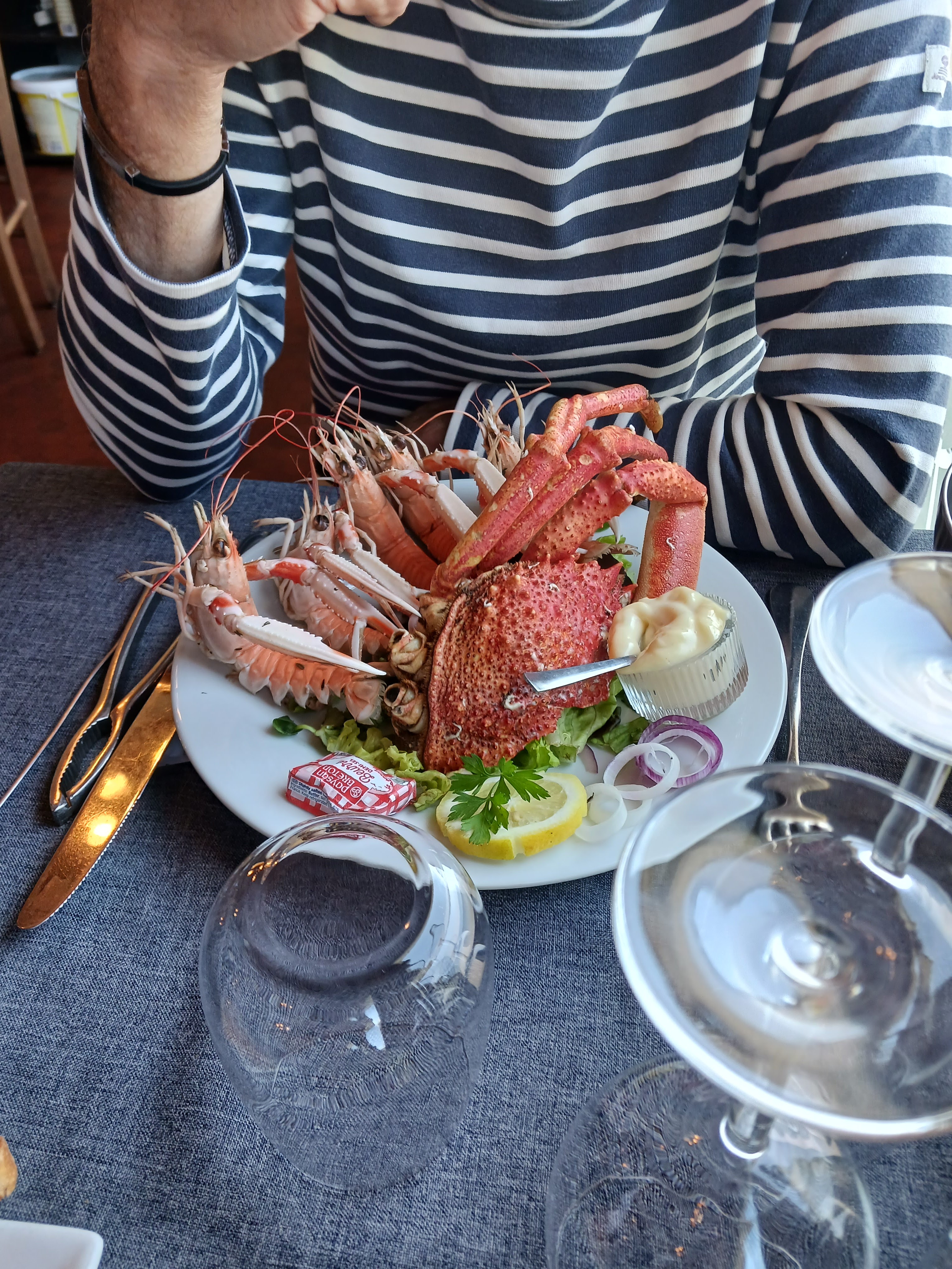 On a commencé par une arrivée un Dimanche midi, on nous a installés sur la Terrasse et le plus beau : On a occupés nos petits enfants avec des crayons et coloriage 😍 Et en prime un menu enfant adapté ou ils ont pu manger un filet de poisson a la sauce au beurre ! Puis on s’est commandé une bouteille de blanc vendée sous les conseils avisés du Staff : Super choix, Et là le défilé de notre commande est arrivée : Huîtres, langoustines, brochettes de st jacques aux cèpes, Crevette 🦐 au whisky 🥃😍, fricassé de Grenouilles 🐸 😍 mon dieu ça a été un régale mais je vous ai pas encore raconté l’histoire du fromage 🧀 : C’EST UN CHARRIOT aïe aïe aïe je me suis fait un véritable plaisir … puis le croquant à la pomme à ne pas rater mais faut le commander en début de repas! ça au moins s’est dit… J’ai quand même été jaloux des enfants ils ont eu un fondant au chocolat 🍫 avec une fraise tagada…. je voulais avoir 4 ans à ce moment 🥹 Mais c’est pas fini après avoir séjourné en vacances on a testé les resto aux alentours à emporter, avec 3 enfants en bas âge le resto c’est pas tout les jours, que dire : Ben très décevant donc pour manger maison et sain j’ai appelé le restaurant pour savoir s’ils faisait à emporter : Mamamia ils ont dit oui ça nous a valu une grosse commande à retirer en tout début de service avec huîtres, moules, gravelax de saumon avec sa sauces MAGNIFIQUES, puis le Jarret de porc et celui la ca faisait longtemps qu’on en avez pas mangé comme ça ! Le rapport qualité prix est inégalable, la fraîcheur des plats, l’accueil franchement Un Grand merci au Chef & à toute l’équipe