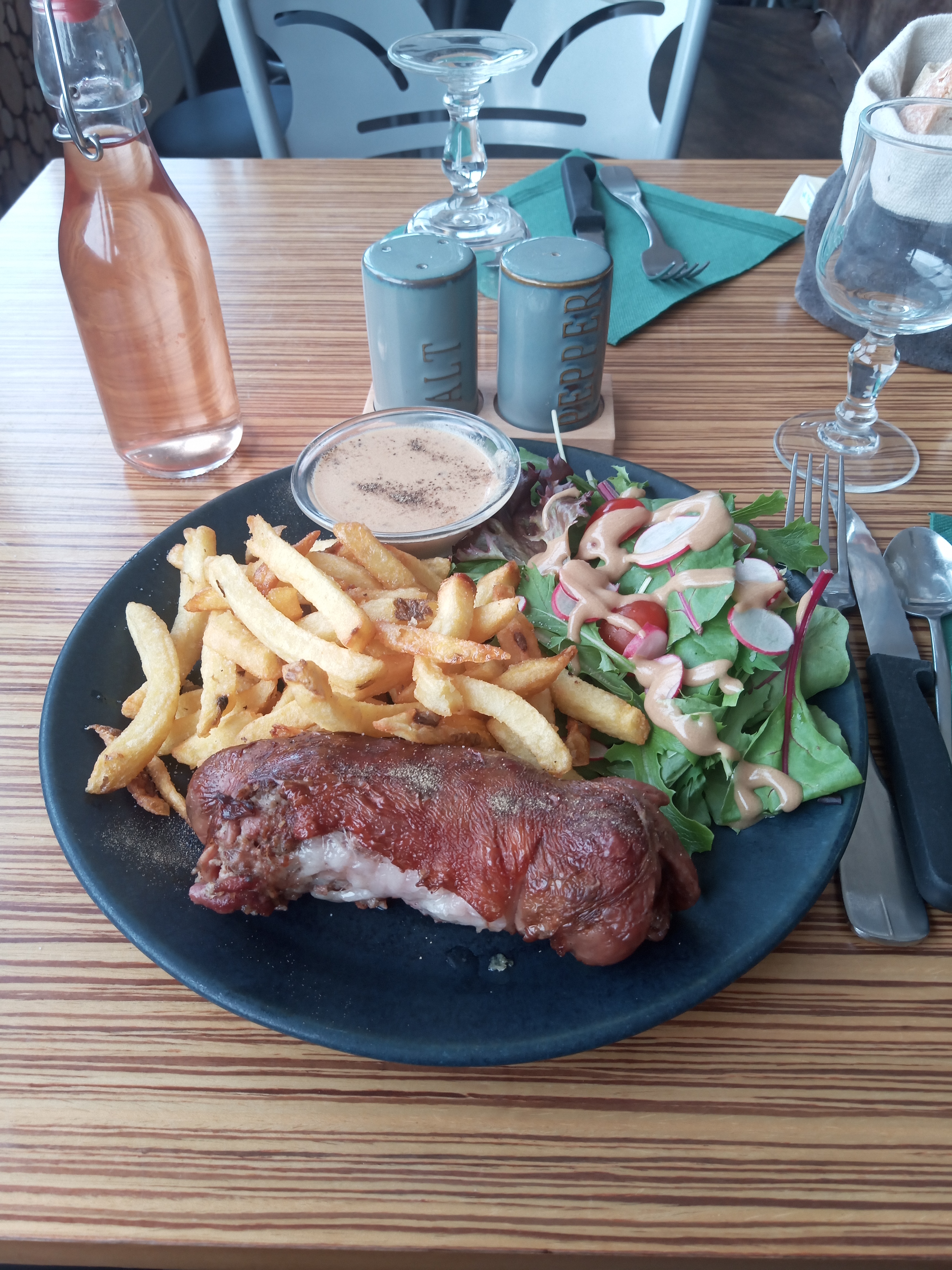 L'entrecôte à la carte à 25 euros accompagnement frites pourrait être plus généreuse, ridiculement trop fine si elle pesait 120g c est déjà beaucoup, franchement c est se moquer j aurai dû refuser et demander à voir le patron. Donc très déçu. Je voyage souvent dans ce coin là, je ne retenterai pas l'expérience. Cétait le soir.