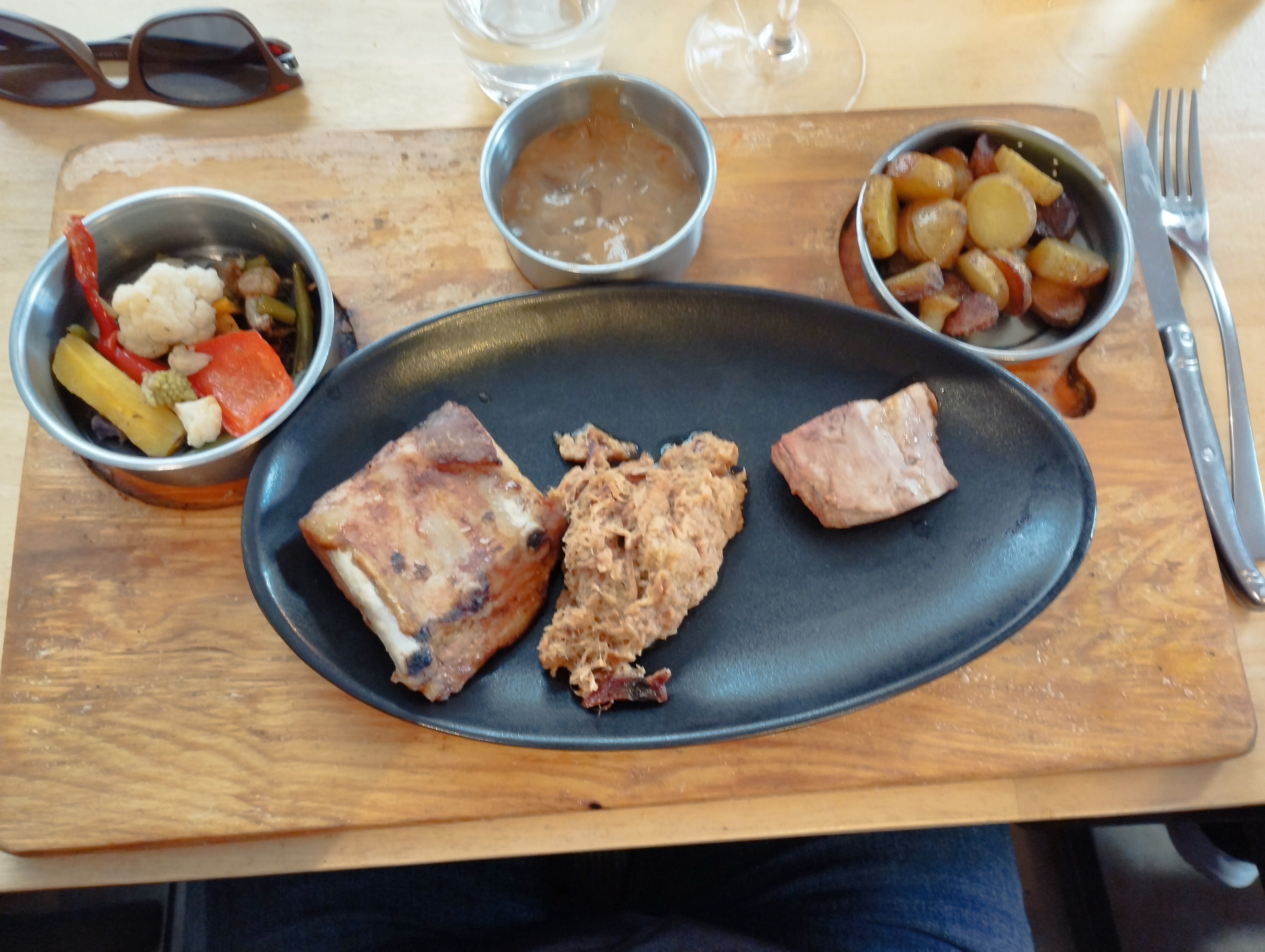 Dîner ce soir même, avec nos deux enfants, ça commence bien avec la mise en bouche, et une cuisine maison avec produits frais, ma cote de cochon était top, la pièce de bœuf cuite à la perfection ( bien croutée dehors, bien saignante dedans )… franchement, on a passé un agréable moment. Seul bémol, nous avions tellement bien mangé qu’on avait plus de place pour le dessert …