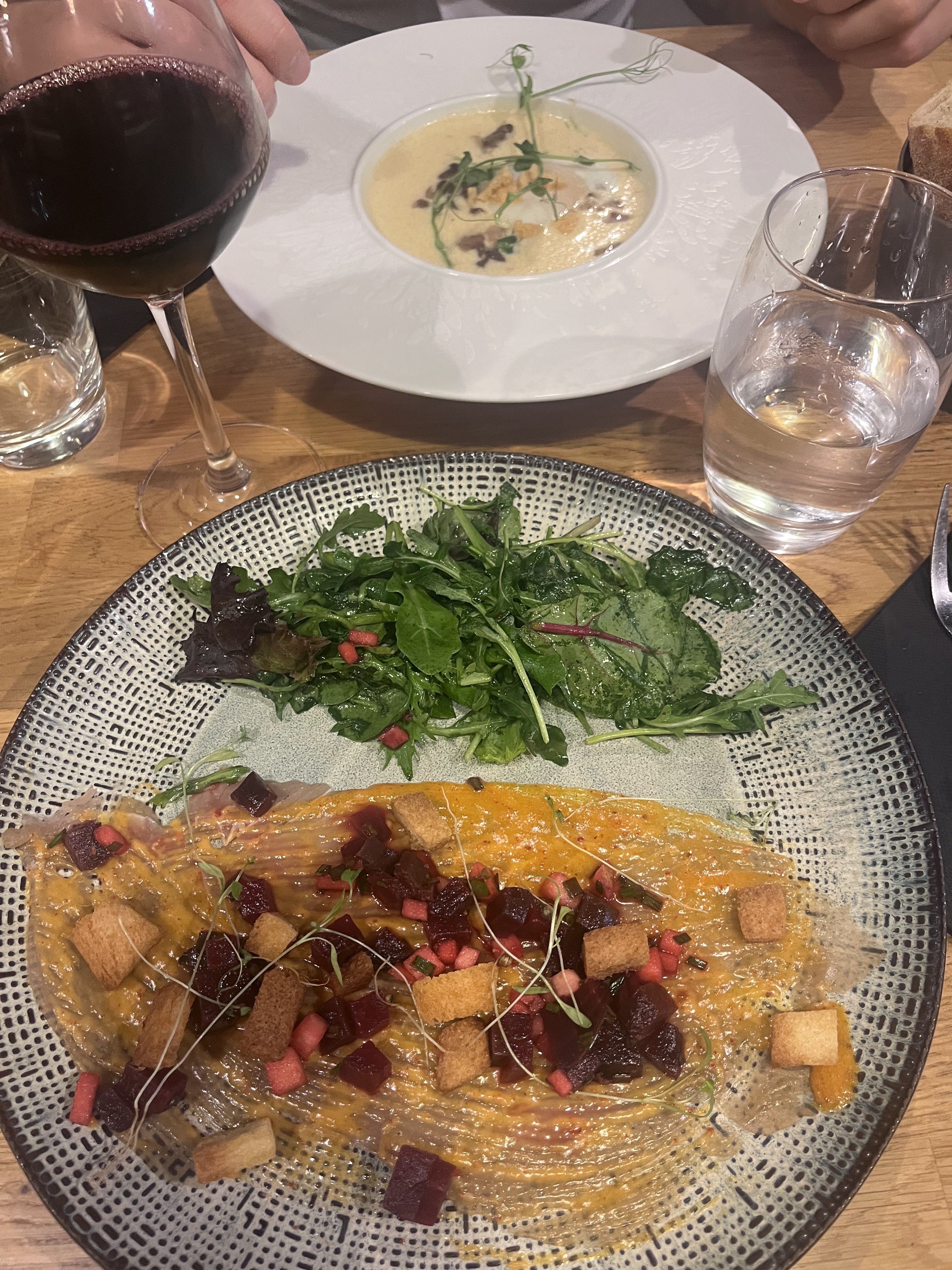 Très bonnes entrées et plats a la carte, avec beaucoup de parfum. Néanmoins attente assez longue (lundi soir). Surtout, assiette d'accompagnement en guise de solution végétarienne (dans l'idée, très bien) mais très chère (24 euros) et une partie non mangeable (risotto extrêmement cuit sans texture ni goût). Pour manger du poisson et de la viande je dis OK mais pour les vege mieux vaut passer son chemin.