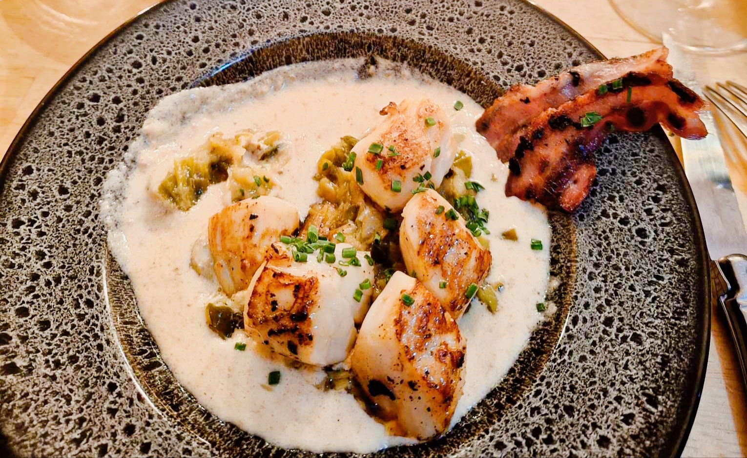 Enchantés par le plat de coquilles Saint Jacques à la crème au lard, l'entremet pomme vanille très gourmand également! Nous avons aussi apprécié l'ambiance chaleureuse de la salle, le service on ne peut plus efficace et le patron très sympathique! Super découverte pour nous où nous reviendrons très certainement.