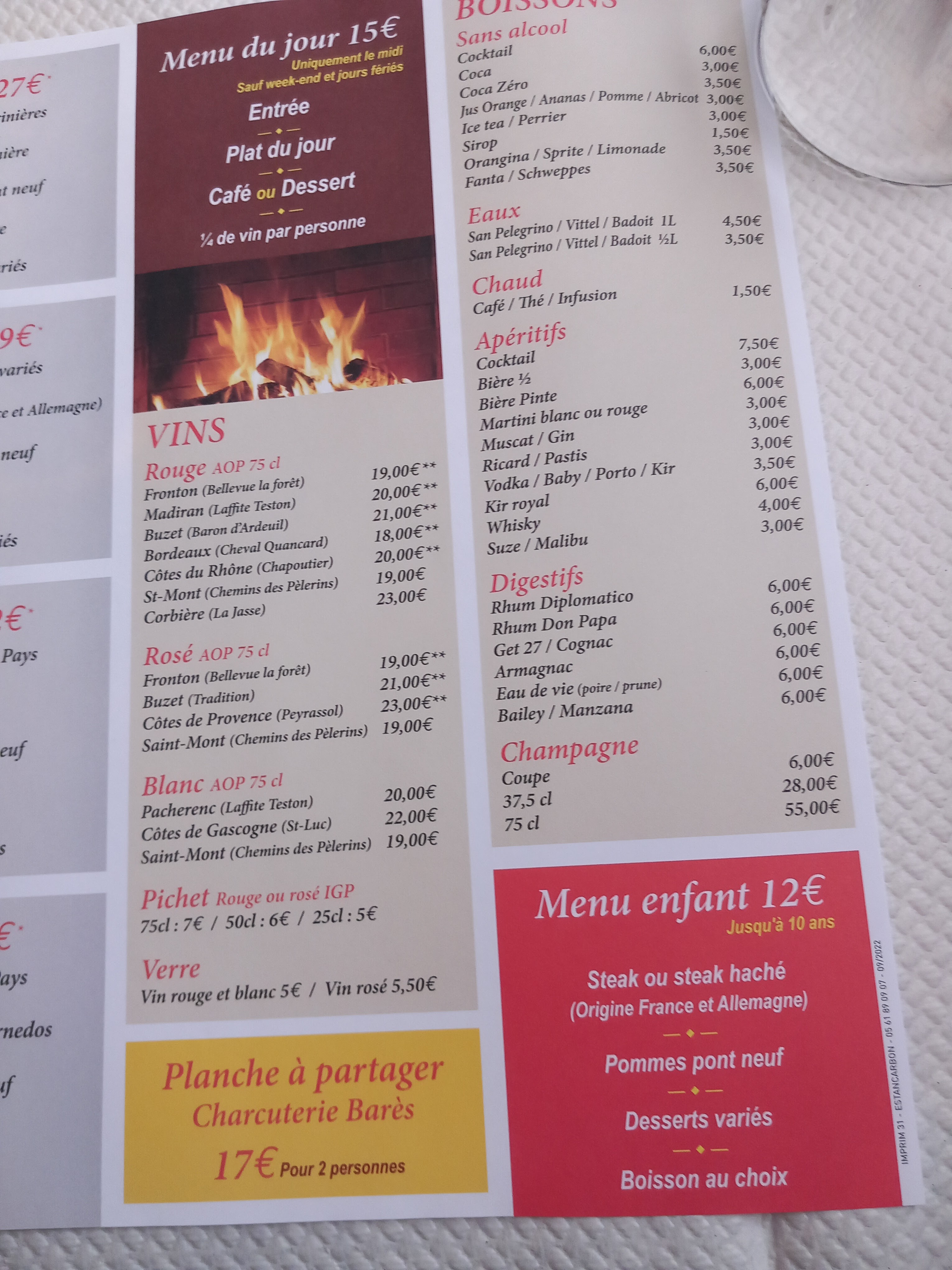 Restaurant chaleureux et authentique avec un personnel adorable. Parfait pour les amateurs de bonnes viandes CUISSON FEU DE BOIS. Il propose un menu du jour du lundi au vendredi (hors jours fériés) à 14€. Avec entrée, plat du jour (le steak est très très copieux), dessert et 1/4 de vin rouge par personne, café en supplément. Il propose également d'autres menus avec confit de canard (20€), entrecôte, magret de canard... Et le menu enfant à 12€. Il est aussi possible de choisir son plat à la carte. Ps : il propose une entrecôte de 1kg pour 2 personnes à 45€. L'origine des viandes est indiqué en toute transparence au restaurant. De nombreux plats, accompagnement sont également fait maison et sont délicieux 😋