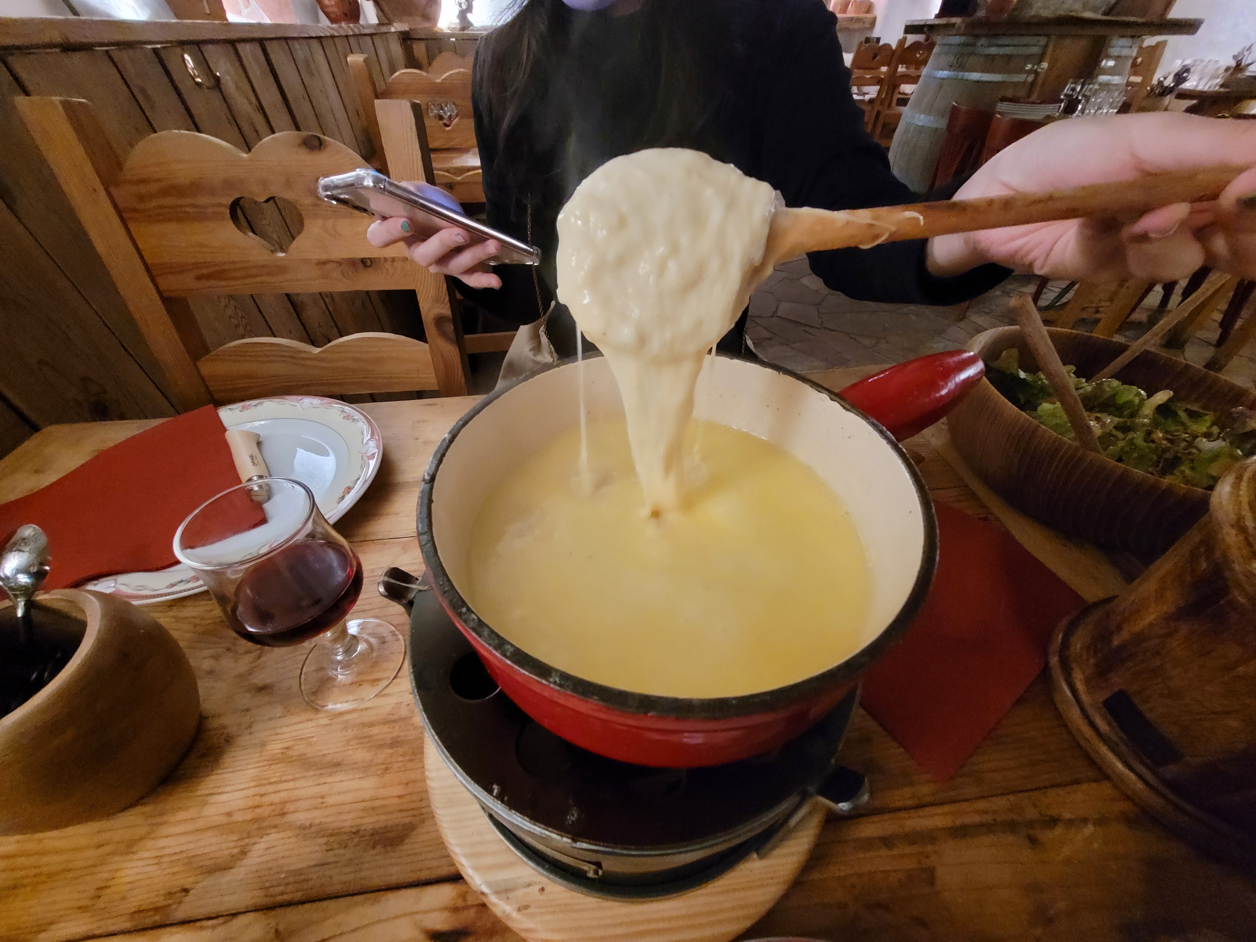 L'endroit a une très bonne ambiance et la nourriture est plutôt bonne, nous avons commandé la fondue, je la recommande ! Il est accompagné de pommes de terre bouillies, de charcuterie et de salade. Les serveurs étaient gentils et nous ont aidés à choisir quoi commander. La seule chose que nous n'avons pas aimé, c'est que nous avons réservé une table à l'avance et qu'ils ne nous ont pas assis dans la salle à manger principale, ils nous ont mis sur une table haute qui était inconfortable près de l'entrée, ils ont dit qu'il n'y en avait pas. Il n'y avait pas d'autres tables disponibles dans le hall principal mais après quelques minutes, un autre groupe est entré et le serveur leur a donné la dernière table (donc en fait il y avait une table disponible mais ils ne voulaient pas que nous soyons là). Je pense que lorsque vous faites une réservation dans ce type de restaurants, ils devraient vous avertir s'il n'y a pas de table normale disponible, pour nous cela faisait partie de l'expérience de s'asseoir dans la salle à manger principale car elle avait une très belle décoration.