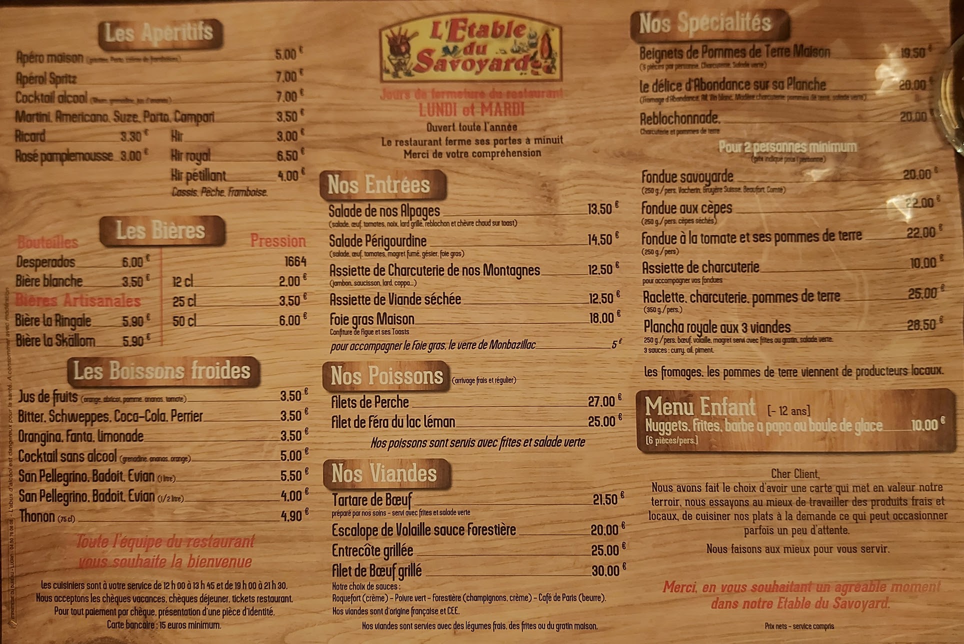 Jolie carte pour ce restaurant typique savoyard. Très conviviale et gourmand. Quantité généreuse et serveuses très sympathique.
