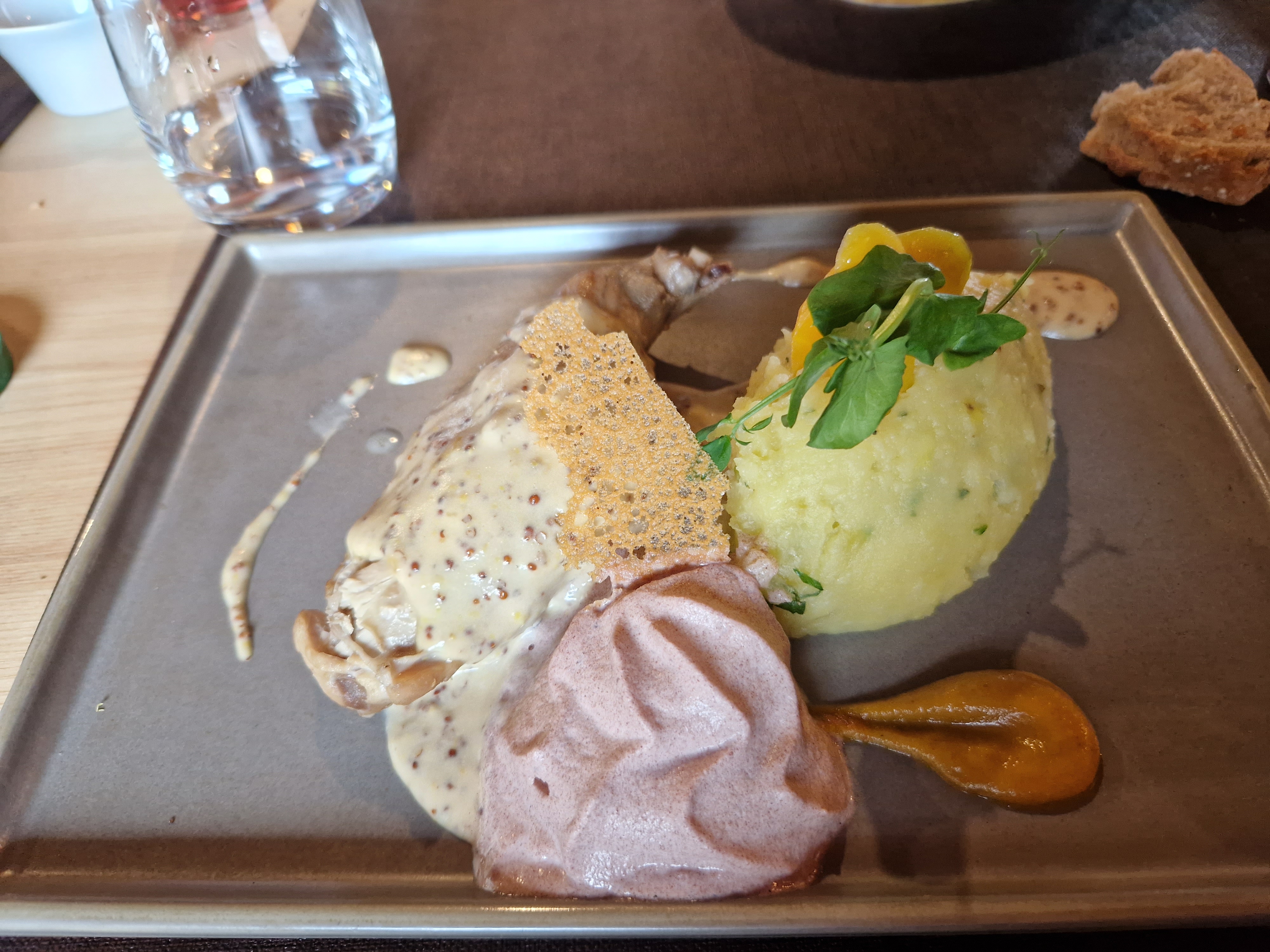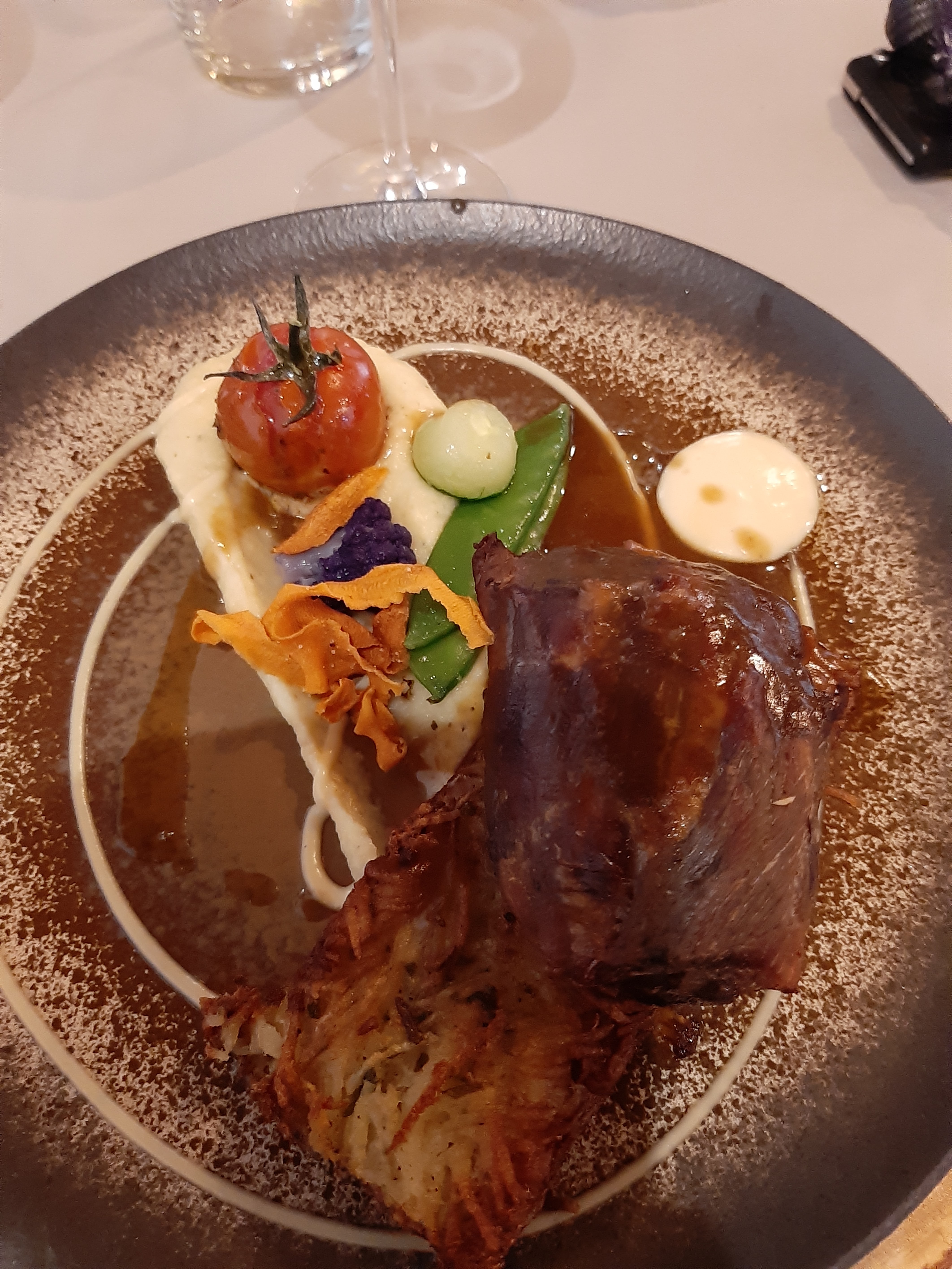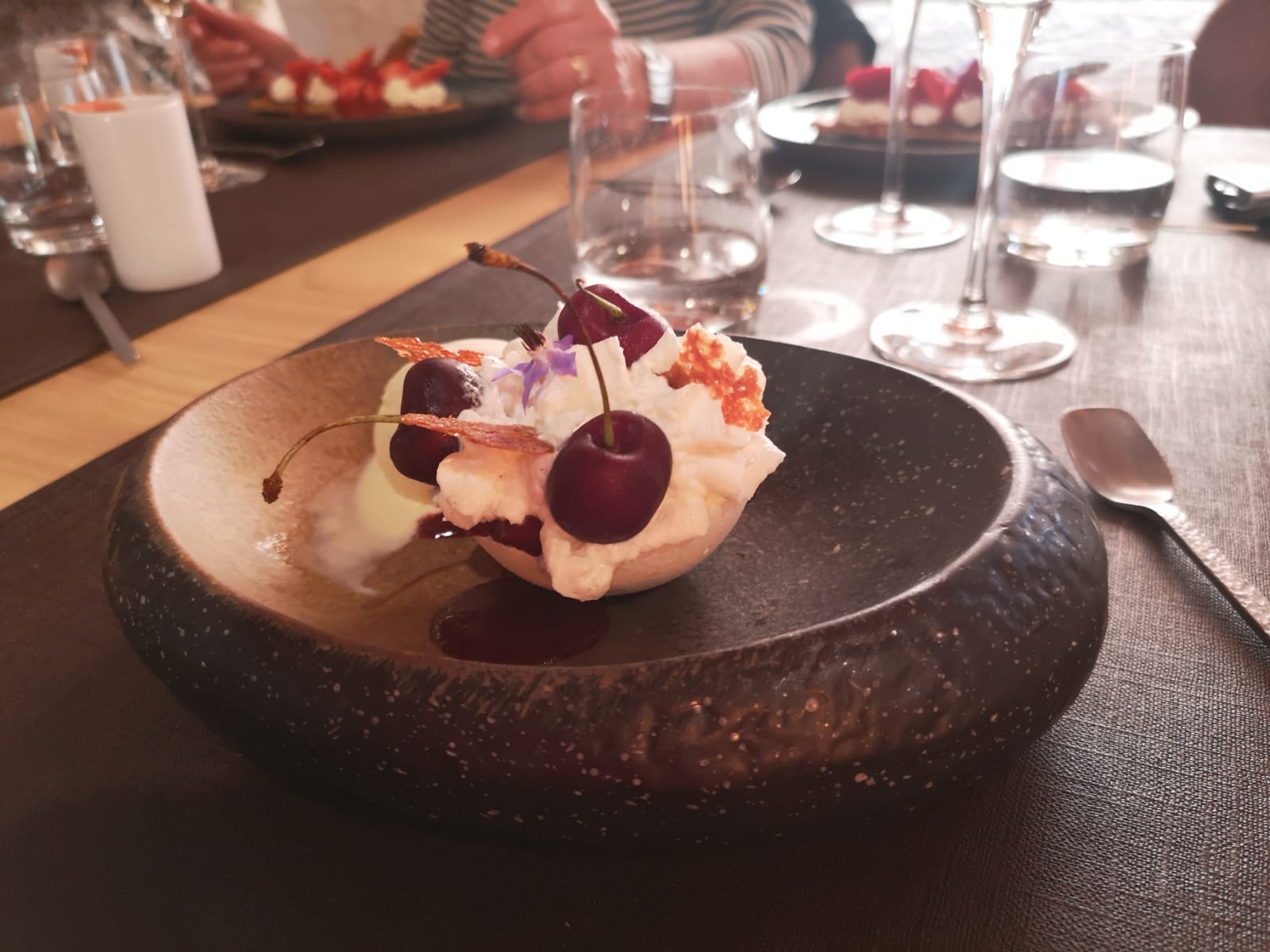 Un restaurant de classe une présentation à dévorer des yeux une magnifique vaisselle et verres à dégustation bravo à de jeune couple à la Bresse col de grosse pierre 😜🍴🥂👍🍀☀️👏😋
