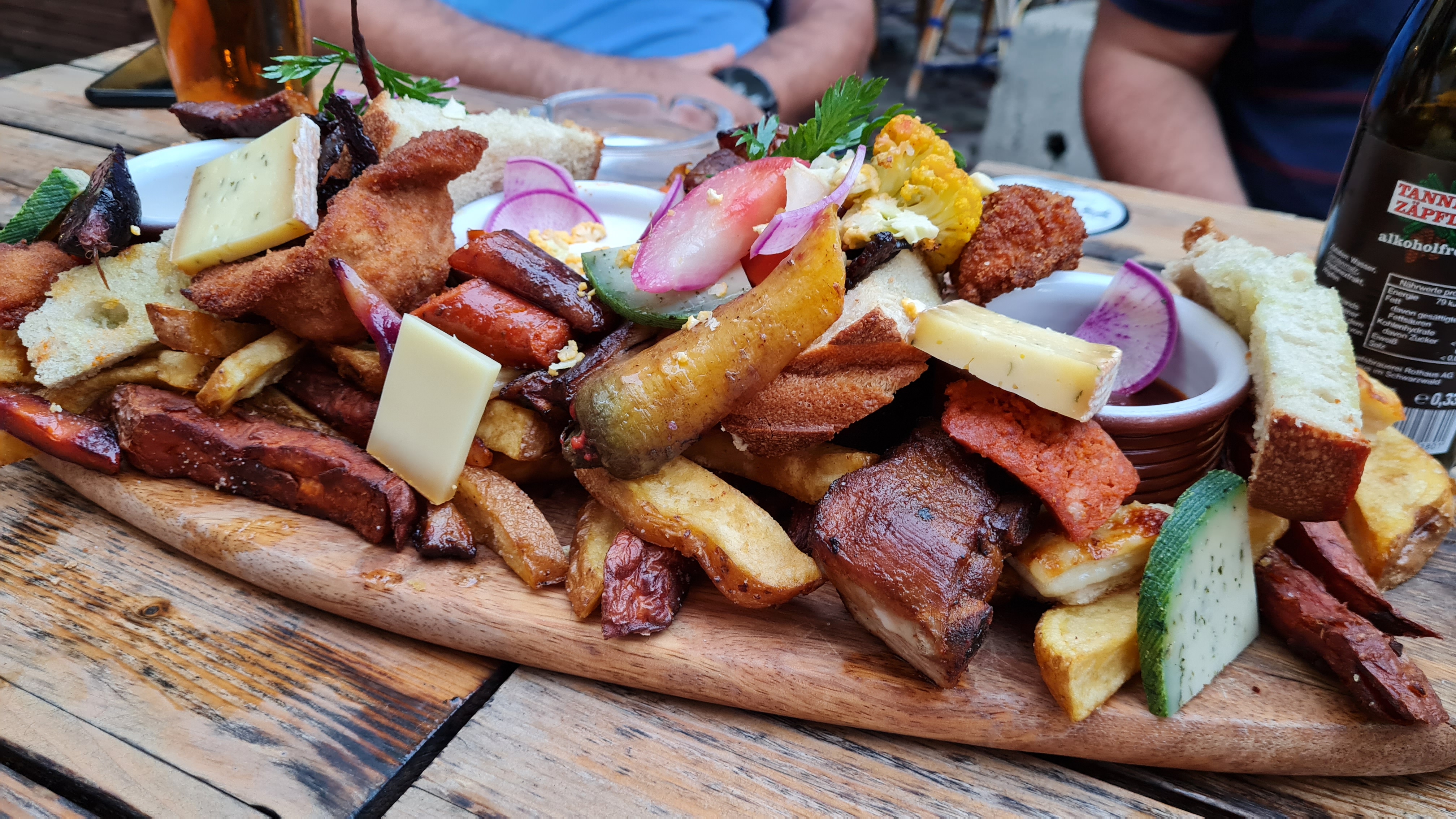 De bonnes bières, un très bon service, mais la nourriture est une PURE ARNAQUE !!! 35€ pour une planchette composée de restes : - 3 petites rondelles de saucisse blanche - 2 demis nuggets de poulet qui étaient tout sauf maison - 5 fines tranches de lard grillé - 1 bout de brie de la taille d'un cube de levure - 3 minis pilons de poulet du style Père Dodu - 4 rondelles de navet fines comme du papier - Et le reste en pseudo frites molles... En gros, une planchette à 35€ composée d'environ 70% de frites... C'est certain qu'en quittant la table, vous n'aurez plus faim, puisque votre estomac sera plein de patate ! Nous étions unanimement d'accord pour dire qu'une telle planchette ne valait pas plus de 15€.