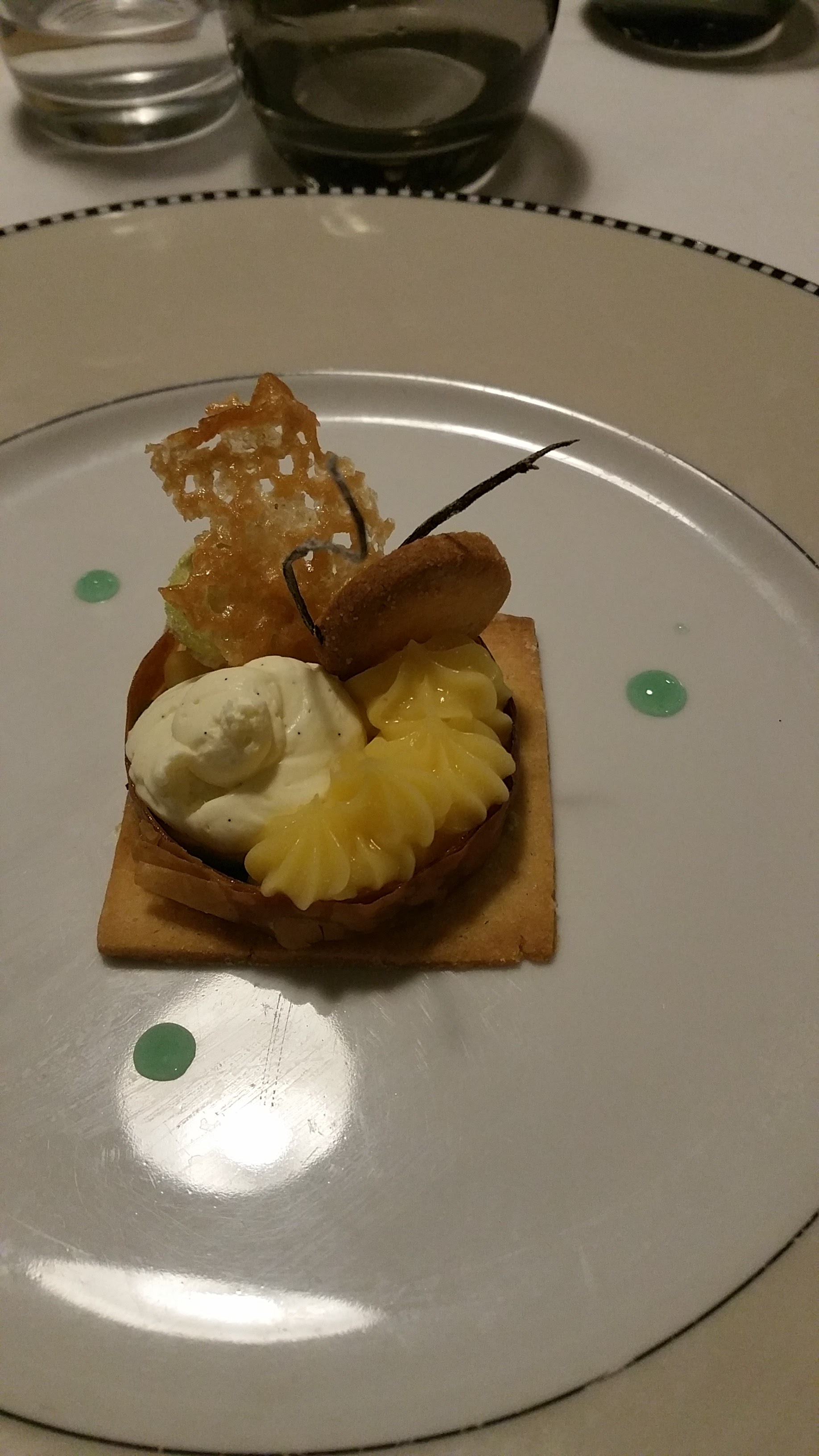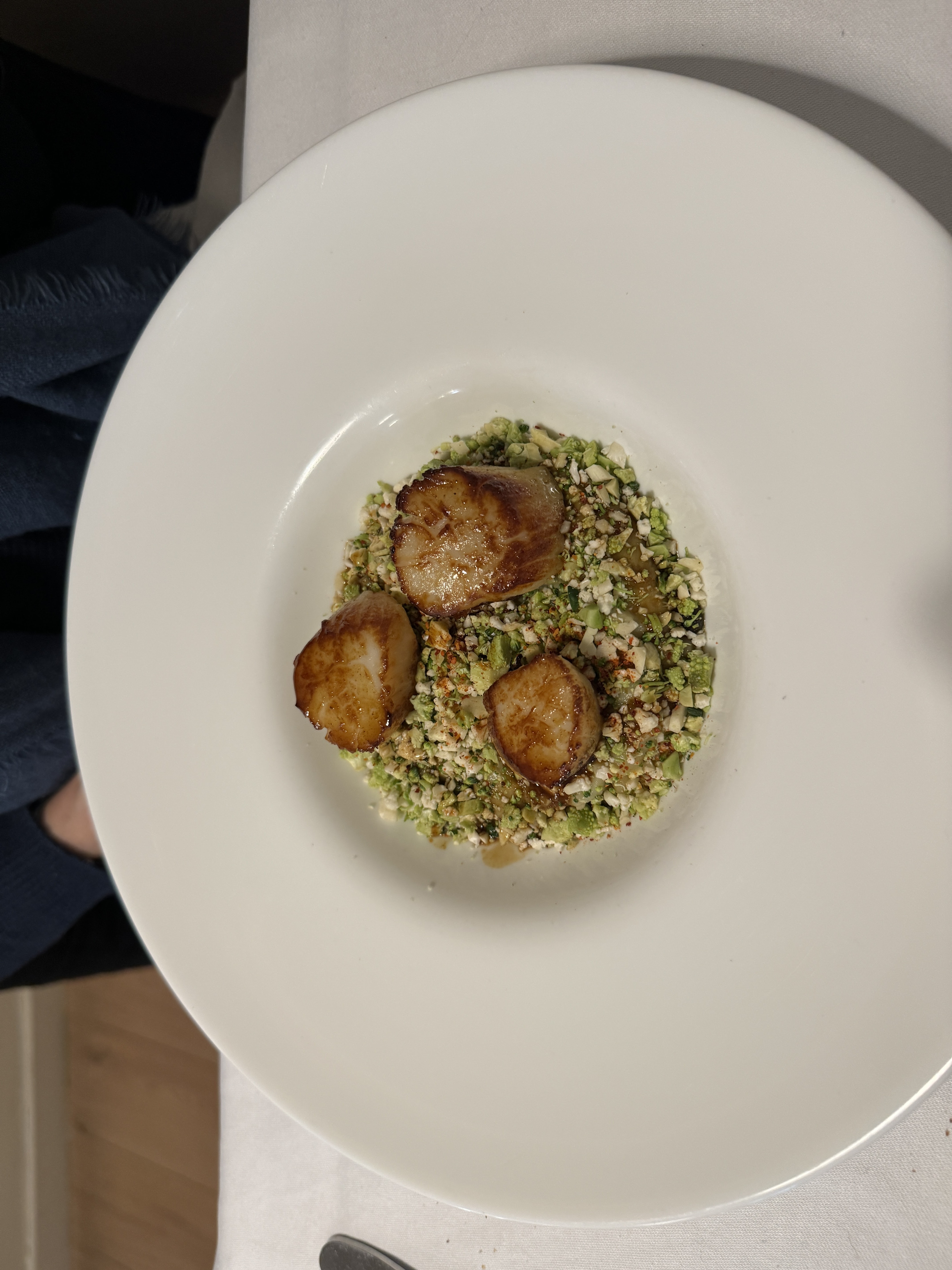 Ah la la que c'était bon! Le saumon gravlax, posé sur du chou rouge mariné, ces disques sablés accueillant le tout... Le filet de veau, les Saint Jacques, les desserts... merci pour cette expérience, et merci à la charmante jeune femme pour avoir pris soin de nous avec délicatesse !