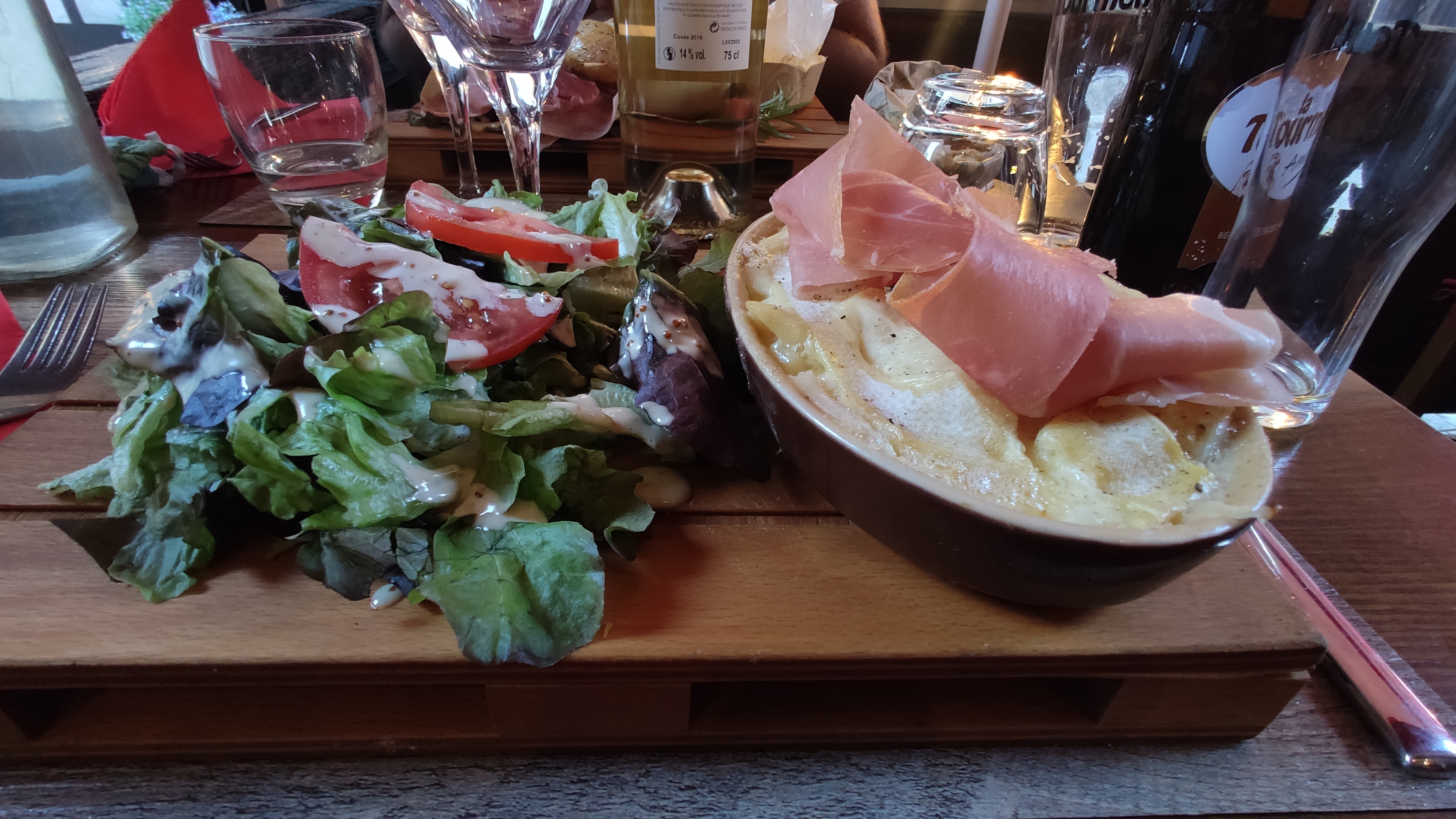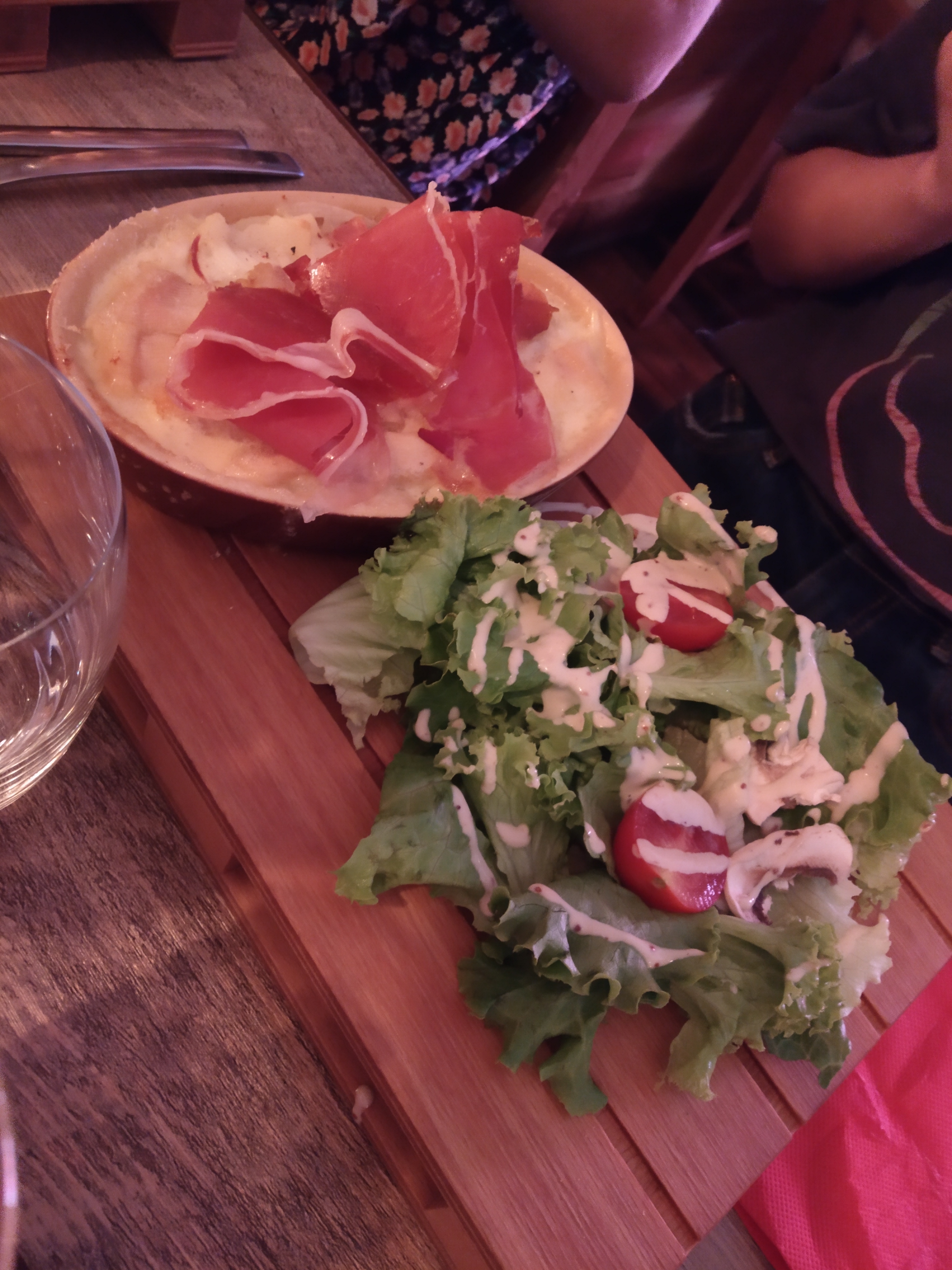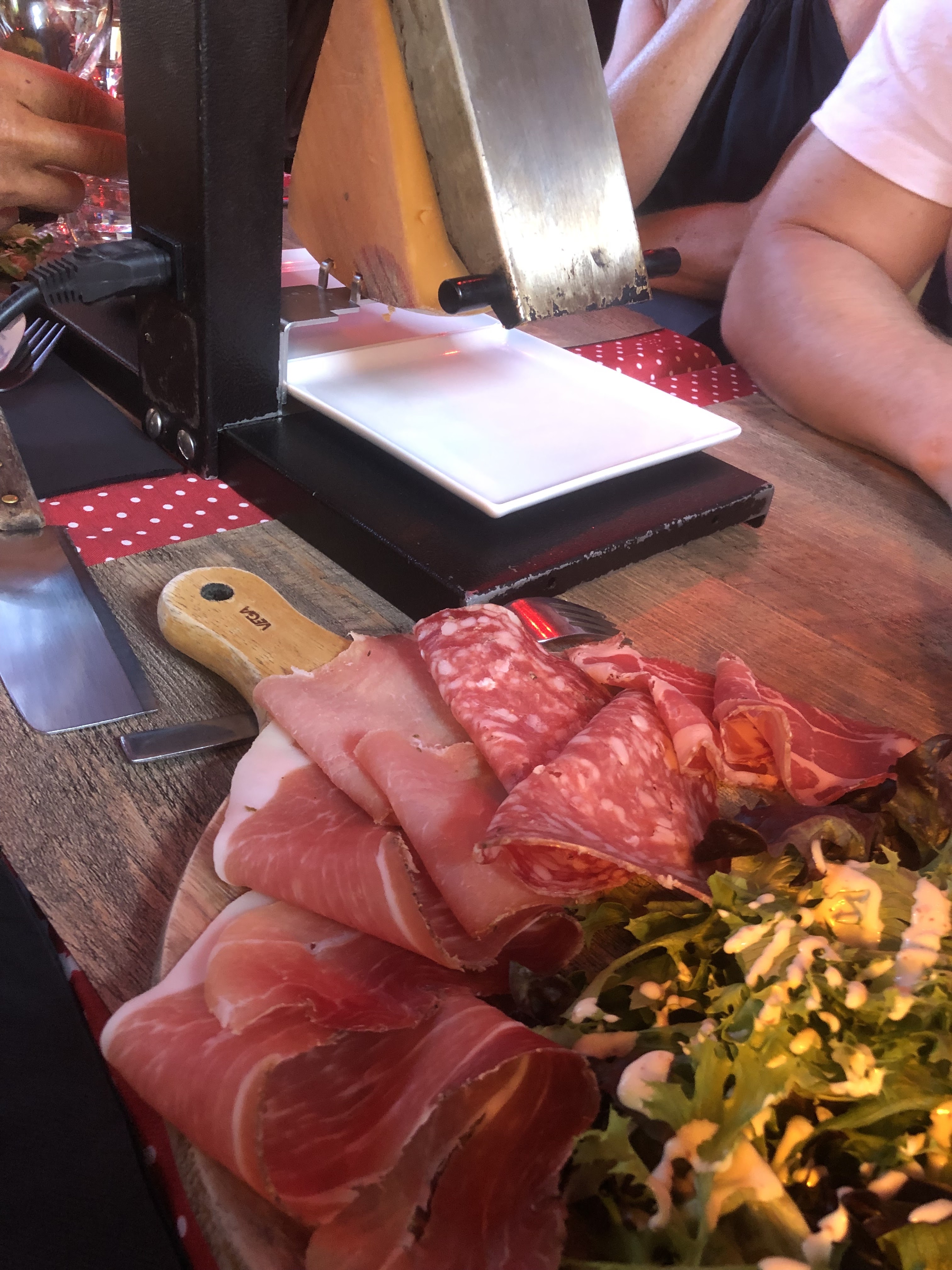On y a mangé a 4 donc on testé la raclette et la fondue , le fromage pour les 2 très bons , léger sur la charcuterie et les plateaux en bois pour manger passable je trouve , on était 2 adultes et 2 enfants ça passe limite, mais pour 4 adultes trop juste .