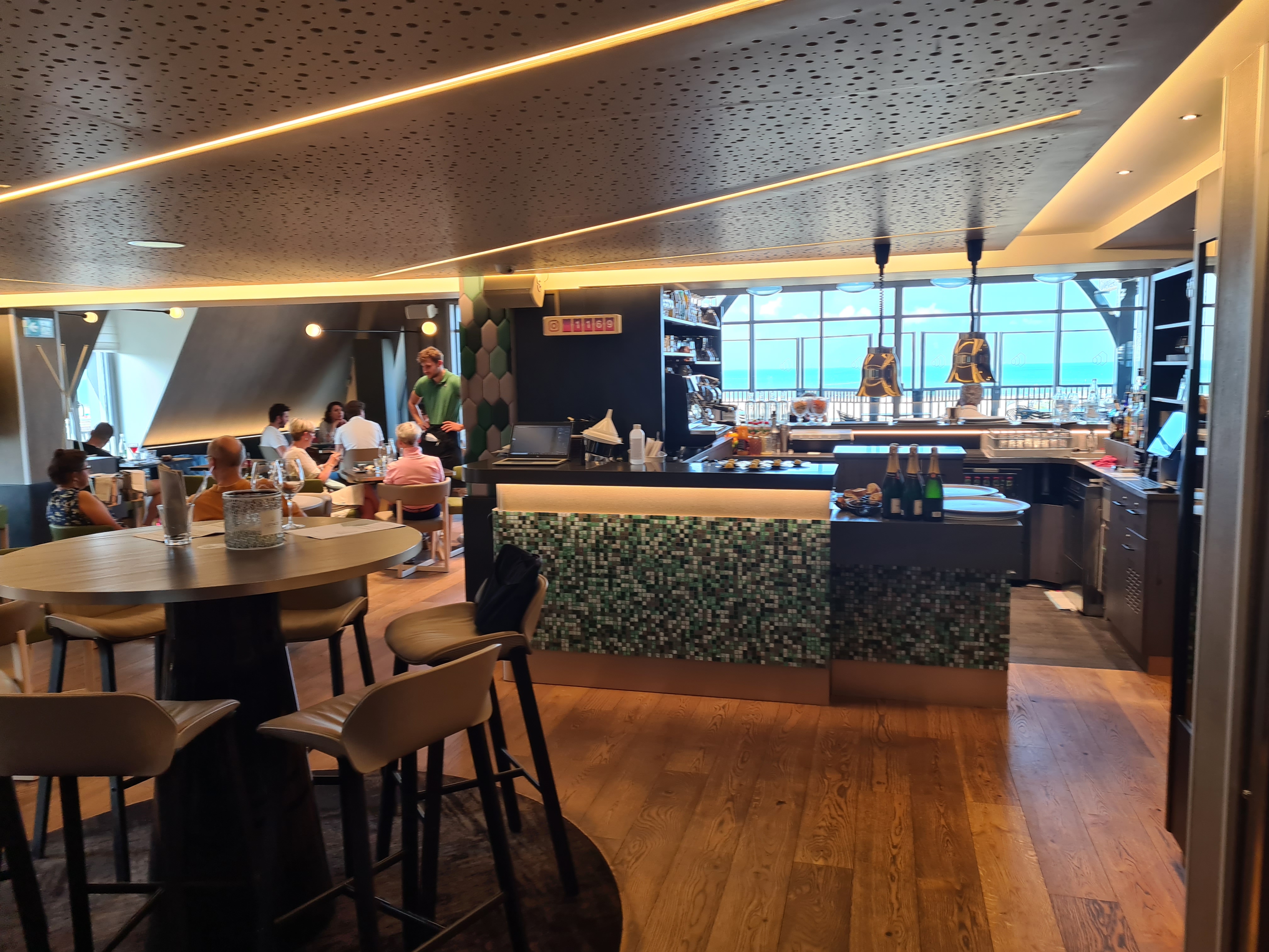 Un restaurant idéalement situé à Deauville, avec une vie imprenable sur la plage, au 5e étage de l'hôtel Novotel. Un personnel jeune, dynamique, toujours disponible et agréable. Une salle à la décoration moderne et dans laquelle on se sent bien. Possibilité de manger sur le balcon (un peu frais, mais là vue est belle). Les plats sont beaux, bons et savoureux. Les assiettes et verres sont toujours design et choisis avec justesse pour mettre en valeur les plats et cocktails. Nous y sommes déjà allés en février il y a quelques années, nous y sommes revenus cet été et nous y reviendrons toujours en confiance et avec plaisir.
