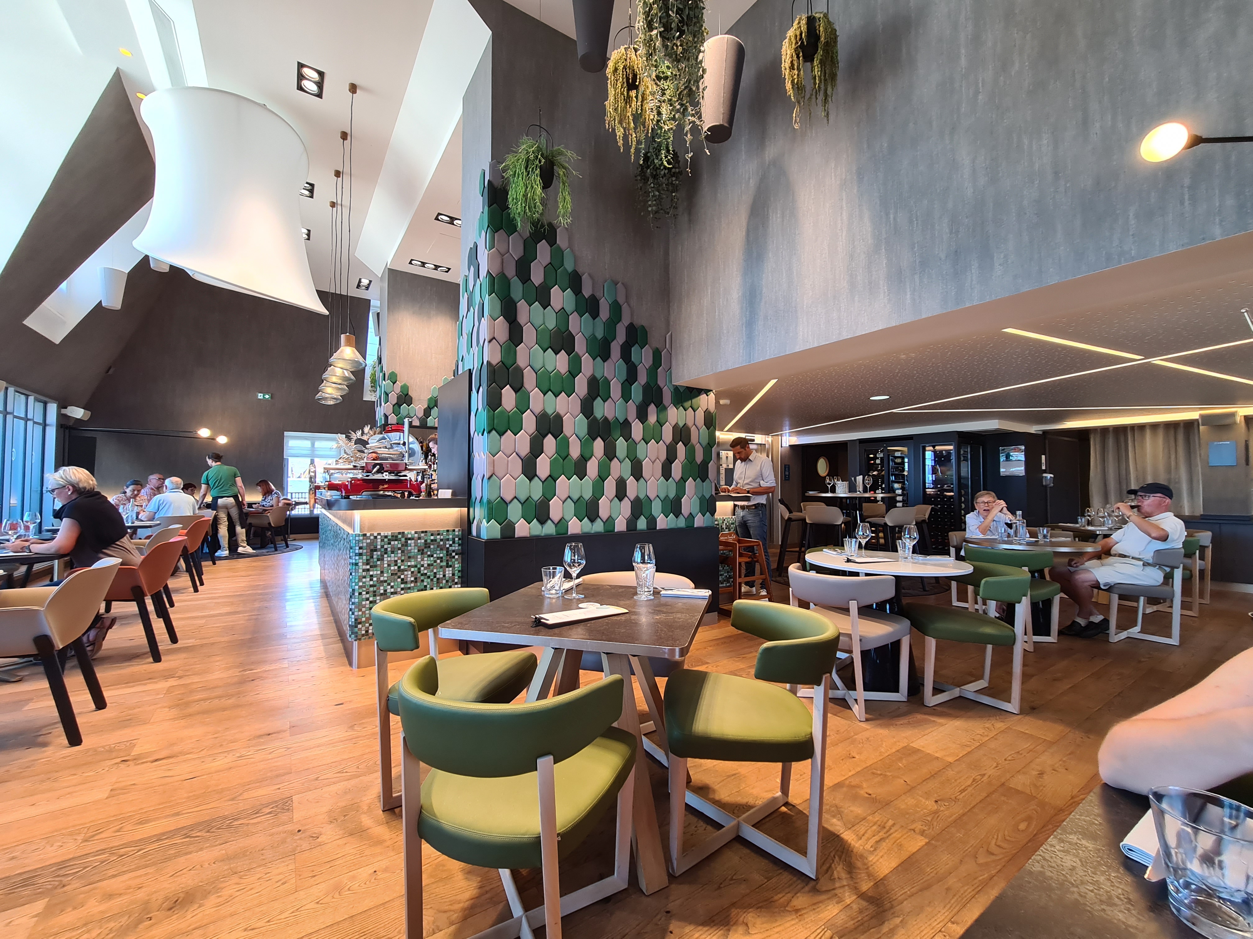 Mitigée... points positifs : le personnel, vin resservi régulièrement, à peine on fait tomber une fourchette qu on nous la ramasse et nous la change,on passe régulièrement demander si tout va bien. Service impeccable, grande gentillesse. Mention spéciale pour le barman au polo vert, incroyable, impressionnant, concentré sans faire la moindre seconde de pause, sur tous les fronts, seul à faire le boulot de 3 personnes selon moi, et tout ça avec le soleil dans le visage..bravo. Plats à la carte relativement copieux, bons, le hamburger me semble un bon rapport qualité prix. Pas de place en terrasse dommage je la pensais plus grande...points négatifs : le ménage, l énorme suspension Blanche au dessus du bar est couverte de gros moutons de poussière visible à l oeil nu, et qui forcément avec la clim ou le vent de la terrasse fini par tomber au sol, et donc....ensuite les gros pieds en bois de ma table, d un inconfort total, je me cognais les genoux dedans quoique je fasse, très désagréable. Et ma plus grosse déception : le menu enfant...portion de poisson minuscule...et que dire des desserts proposés...pompote, glace bi goût en pot, fromage blanc...si nous les adultes allons au restaurant pour manger des choses différentes du quotidien,c est également valable pour les enfants. déçus, surtout quand ils voient les desserts adultes arrivés..j ai donc mangé le bol de fromage blanc des plus banals, type cantine.....et laissé mon dessert à ma fille... Le menu enfant devrait vraiment être reconsidéré..🙏
