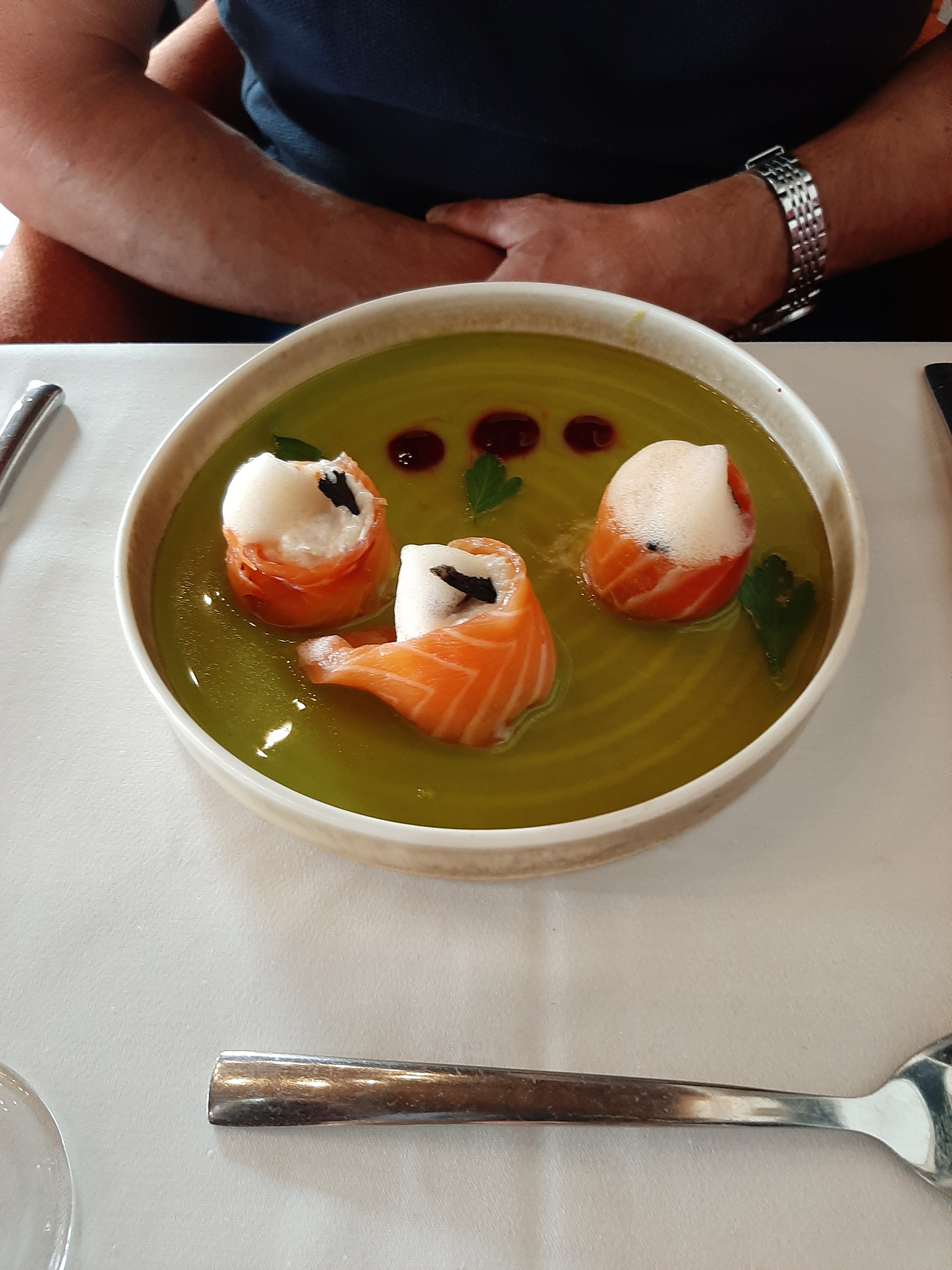 Accueil avec le sourire sur une petite terrasse tres agréable non loin d un petit étang. Le cadre est très sympa. Les plats sont surprenants tant visuellement que gustativement. C est ni trop ni pas assez . Tout le personnel qui s est occupé de nous à était très souriant . C était juste parfait .merci. Allez y . Ça vaut le coup