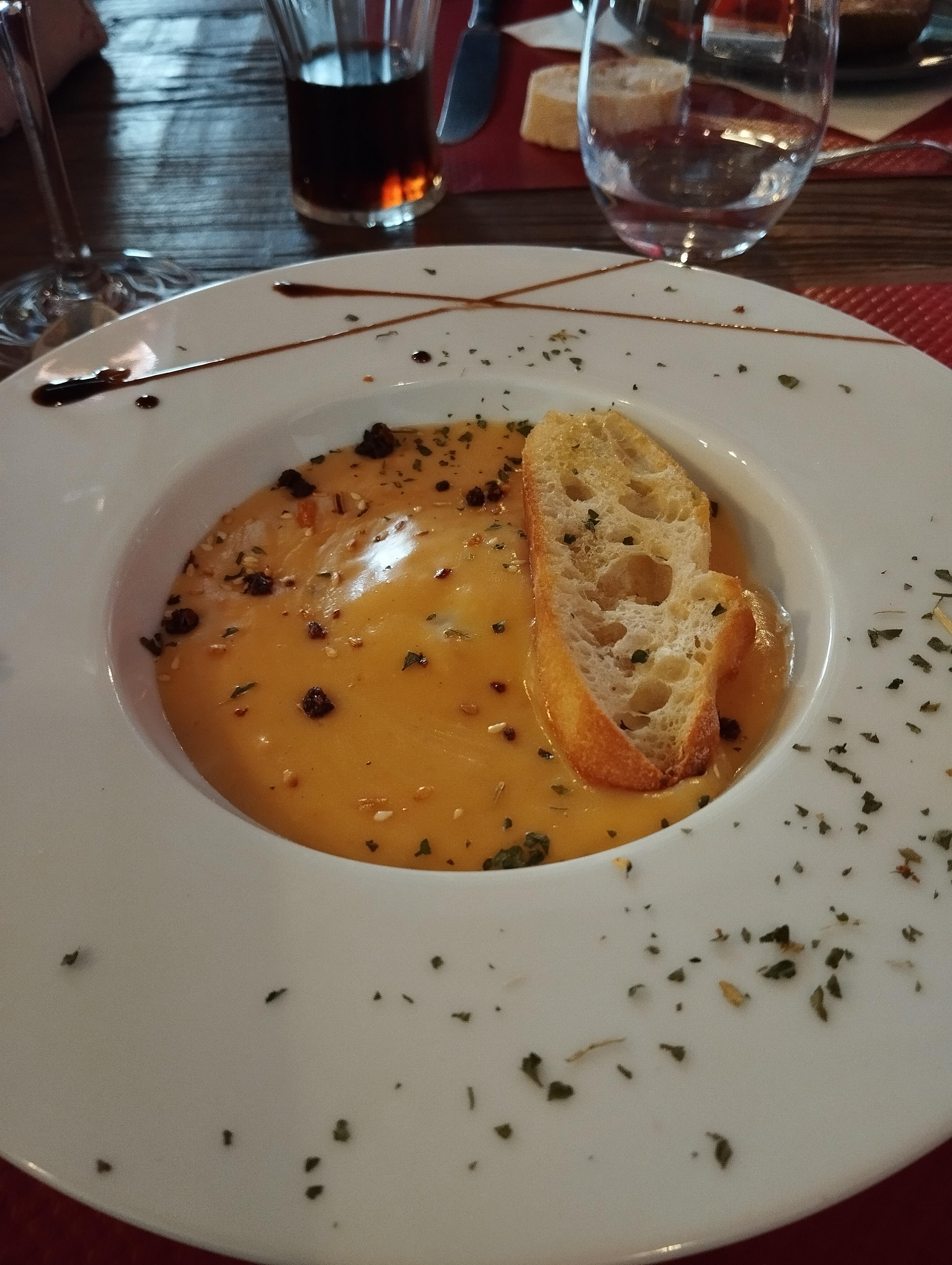 Nous sommes venus ici en octobre, donc pas vraiment une période chargée et ce soir-là, nous n'étions que quatre. Il n'y a aucun autre restaurant ouvert à plusieurs kilomètres à la ronde ! Le restaurant à salle à manger unique était joliment décoré et doté d'une cheminée. Le velouté de potiron et celui de dinde étaient très savoureux et la serveuse était serviable, bavarde et sympathique. Le dessert final, une pâtisserie salée croustillante à la crème et aux figues était une délicieuse touche finale du dîner ! Les prix sont corrects et il y a un bon choix de plats. Endroit étonnant, il vous surprendra par sa cuisine raffinée.