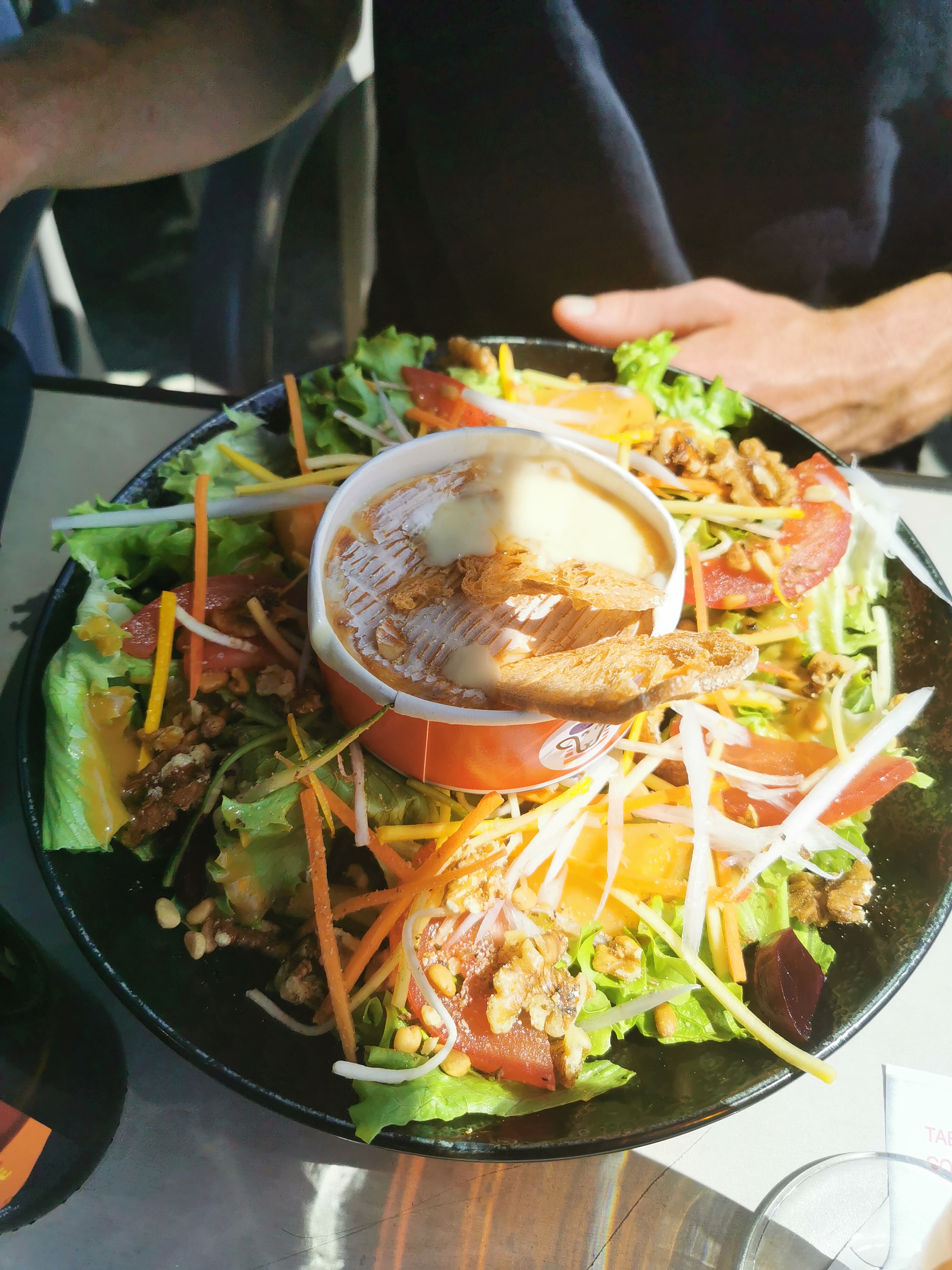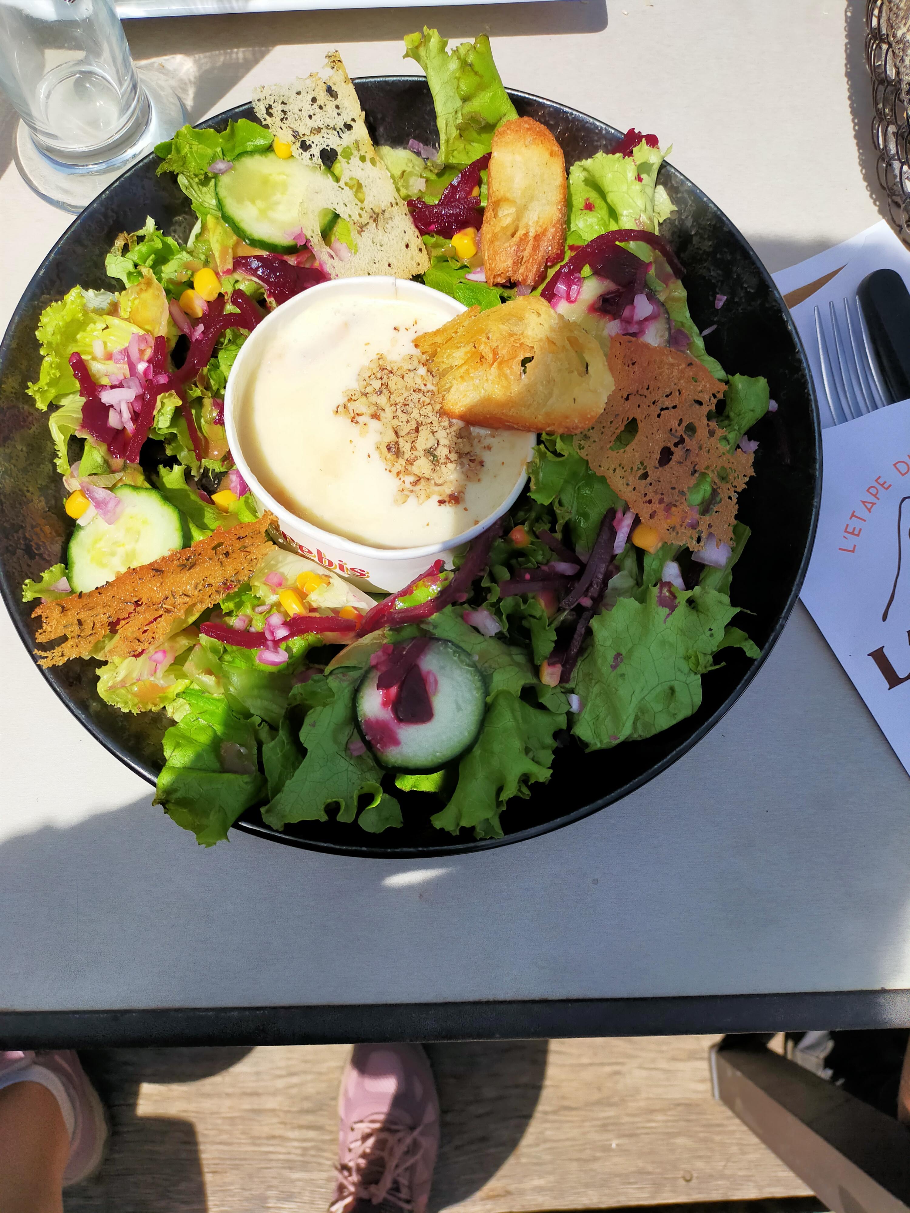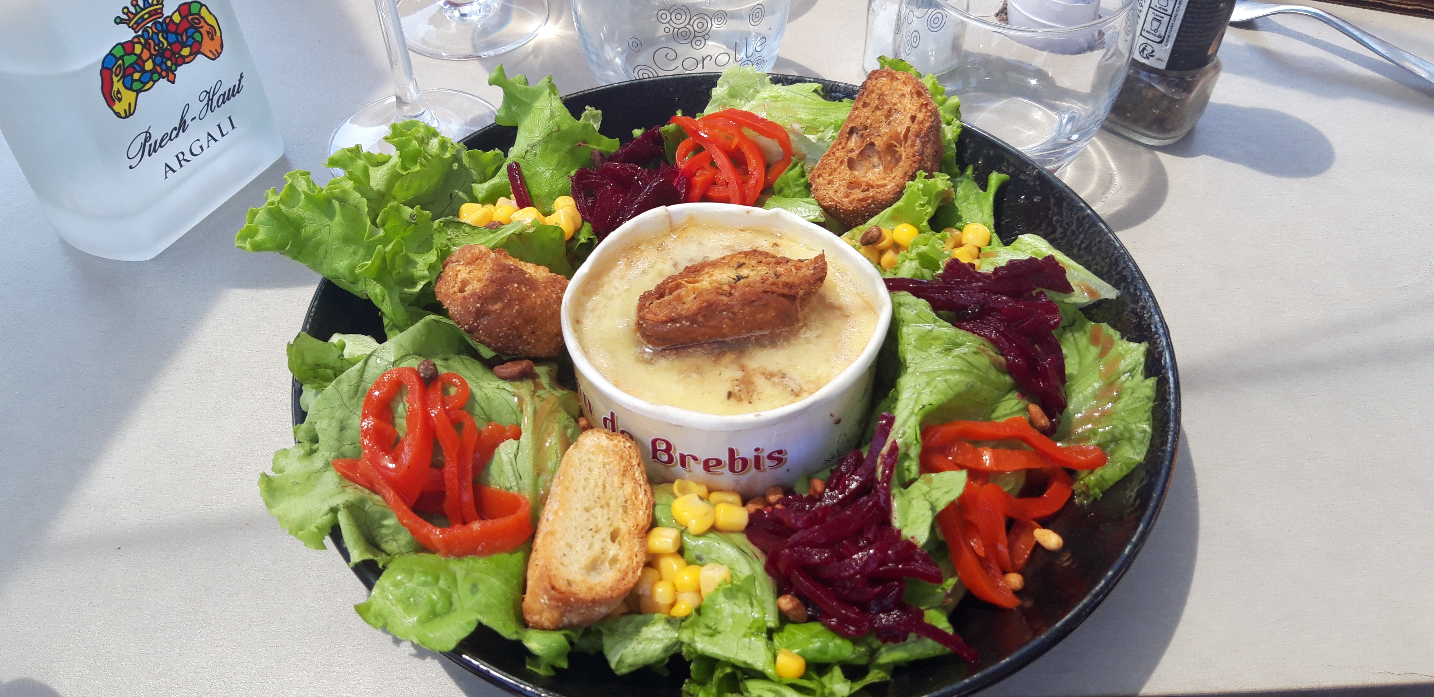 Bonjour,une vue a couper le souffle entre le soleil et les ( nuages) un paradis pour les yeux et le coeur. Serveur pressé mais souriant et a la vue du monde c'est topissime.Seul bémol une salade ,qui ne correspondait pas au menu,salade verte,petits oignons, croûtons,, excellent fromage de brebis au centre avec des noix,mais a la vue du prix dommage que tous les ingrédients n'y étaient pas. Baba au rhum excellent ,rien a dire une gourmandise pour les yeux et le palais. Mon seul regret cette salade bien seule.