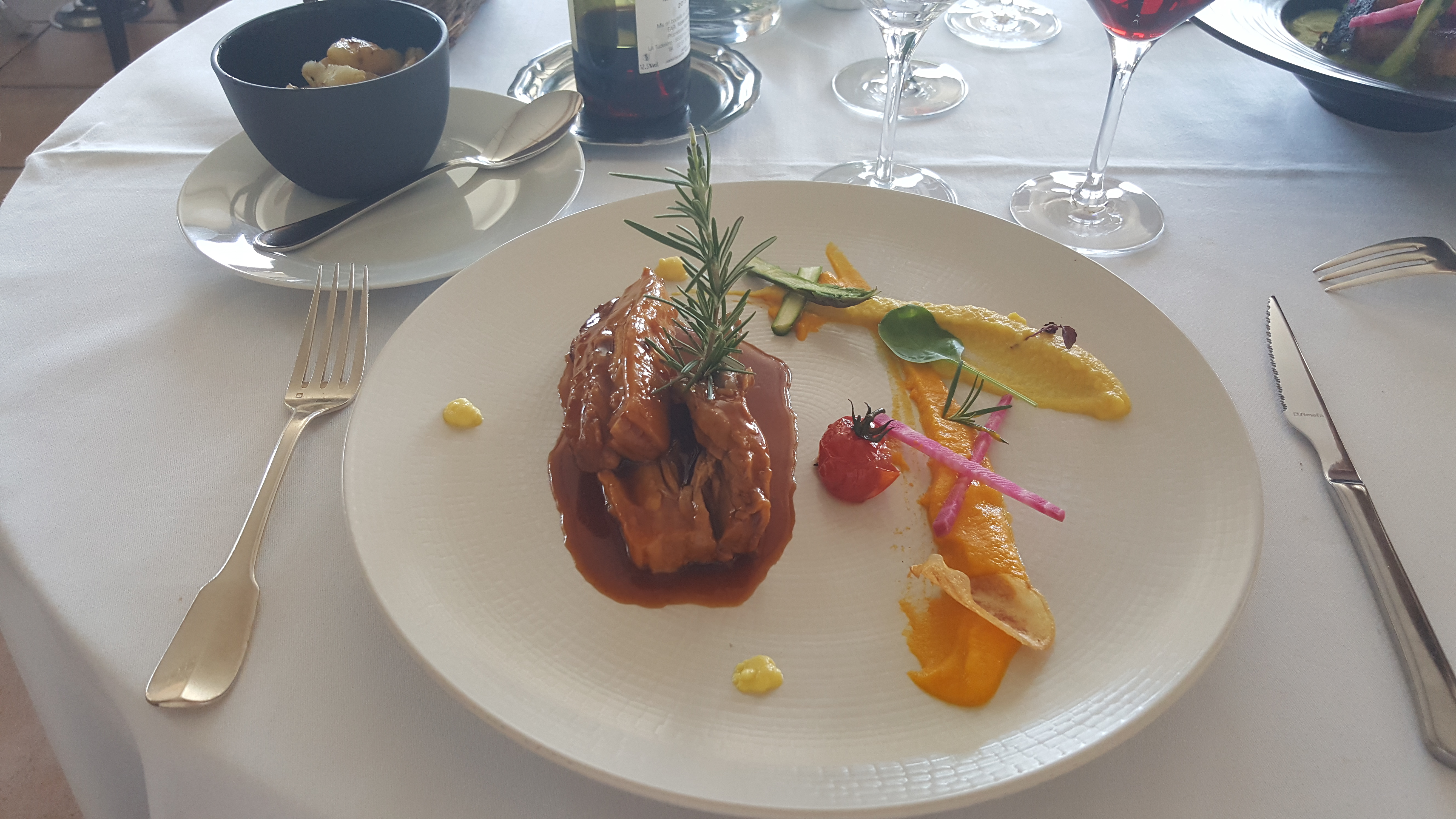 Très déçue par la proposition de la cuisine. J'avais choisi le menu à 43€, avec des ravioles de lougoustine extrêmement fades dans une bisque également fade (le cuisinier a-t-il seulement goûté son plat?), suivies d'un canard sauce orange avec purée de carotte sans goût et, à part, un bol de patates non salées, pas d'herbes aromatiques pour égayer un peu. La tarte au citron était en revanche très bonne et bien équilibrée, mais ca ne compense pas la déception du repas.