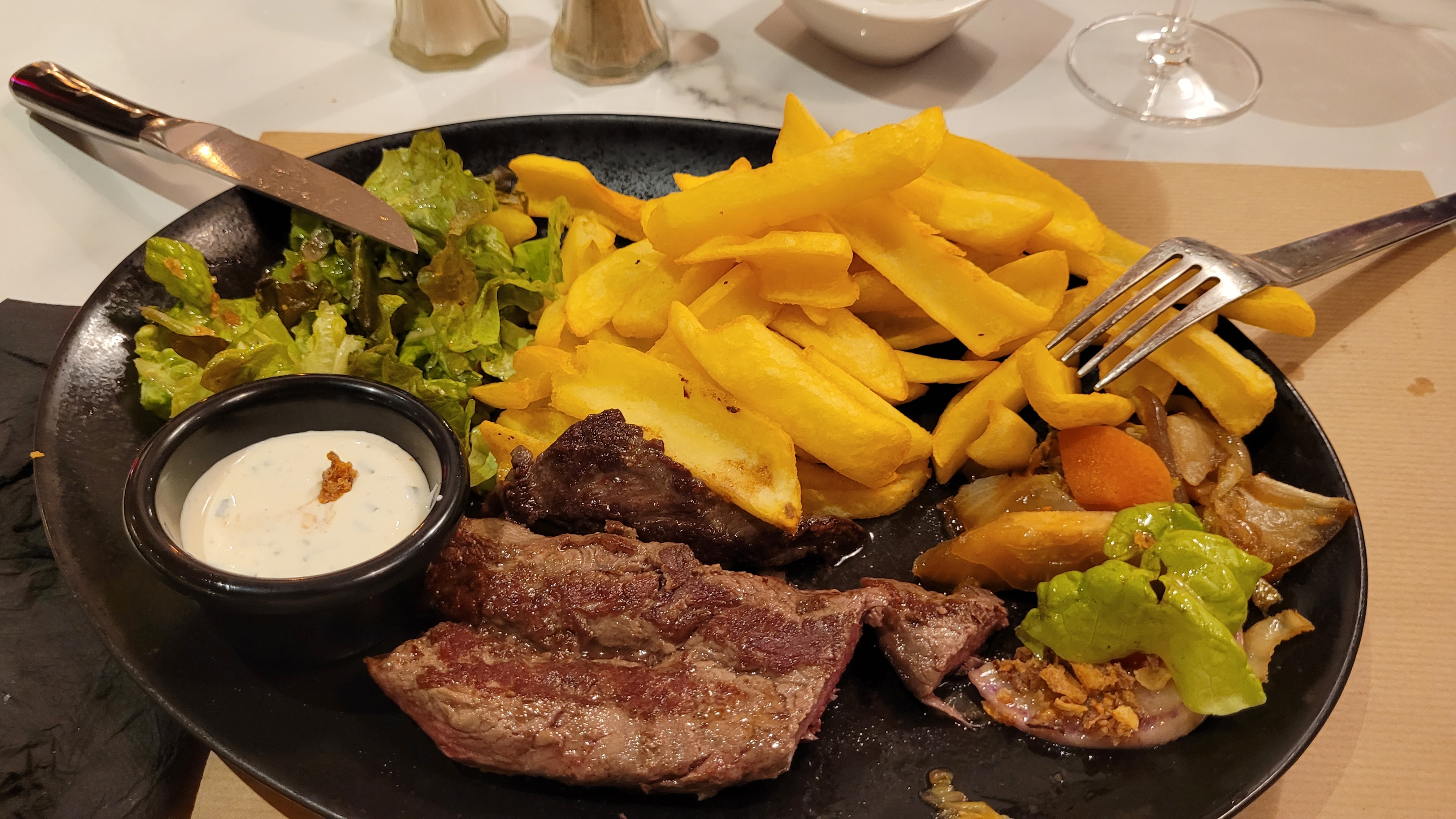 Franchement ni bon ni mauvais : sans grand intérêt. On a prit des plats différents et on a tous eu la même réaction : vraiment bof. Les moules à la crème sans goût, même pas d’oignon, obligé de salé par dessus (le comble pour des moules de devoir les salé). Frites congelées et trop grasses, tartares de bœuf avec de la menthe (ce n’était pas précisé) et sèche pas terrible. Pourtant que des bons avis sur Google donc soit nous sommes tombés le mauvais jour, soit il y a une différence de palais…