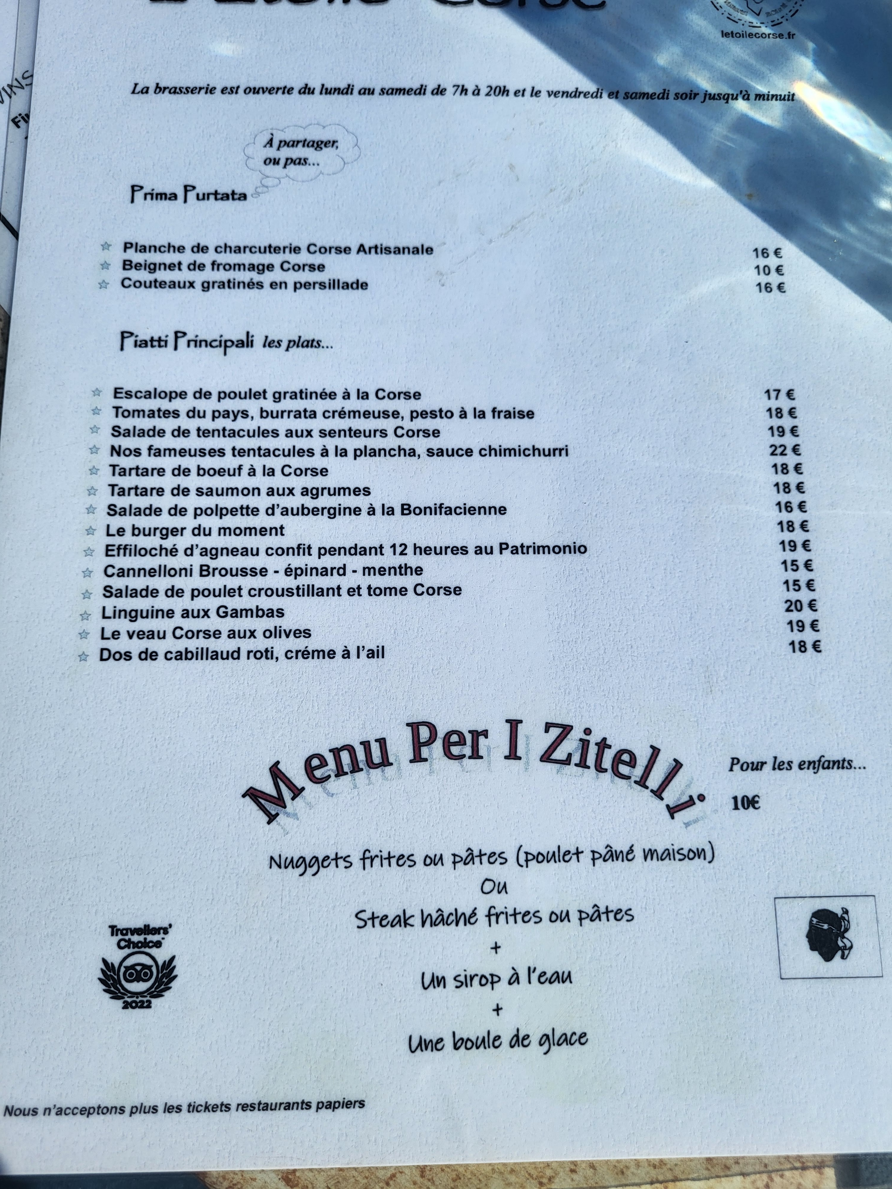 Au top !! Gentillesse, humour du personnel. Service impeccable ! Les plats... Extrêmement goûtu, belle présentation , portion plus qu'il n'en faut ! Prix raisonnable Les beignets de fromage corse .. un régal ! Ambiance, un fond de chant corse qui détend ! Tout est là pour passer un agréable moment ! Merci à vous !