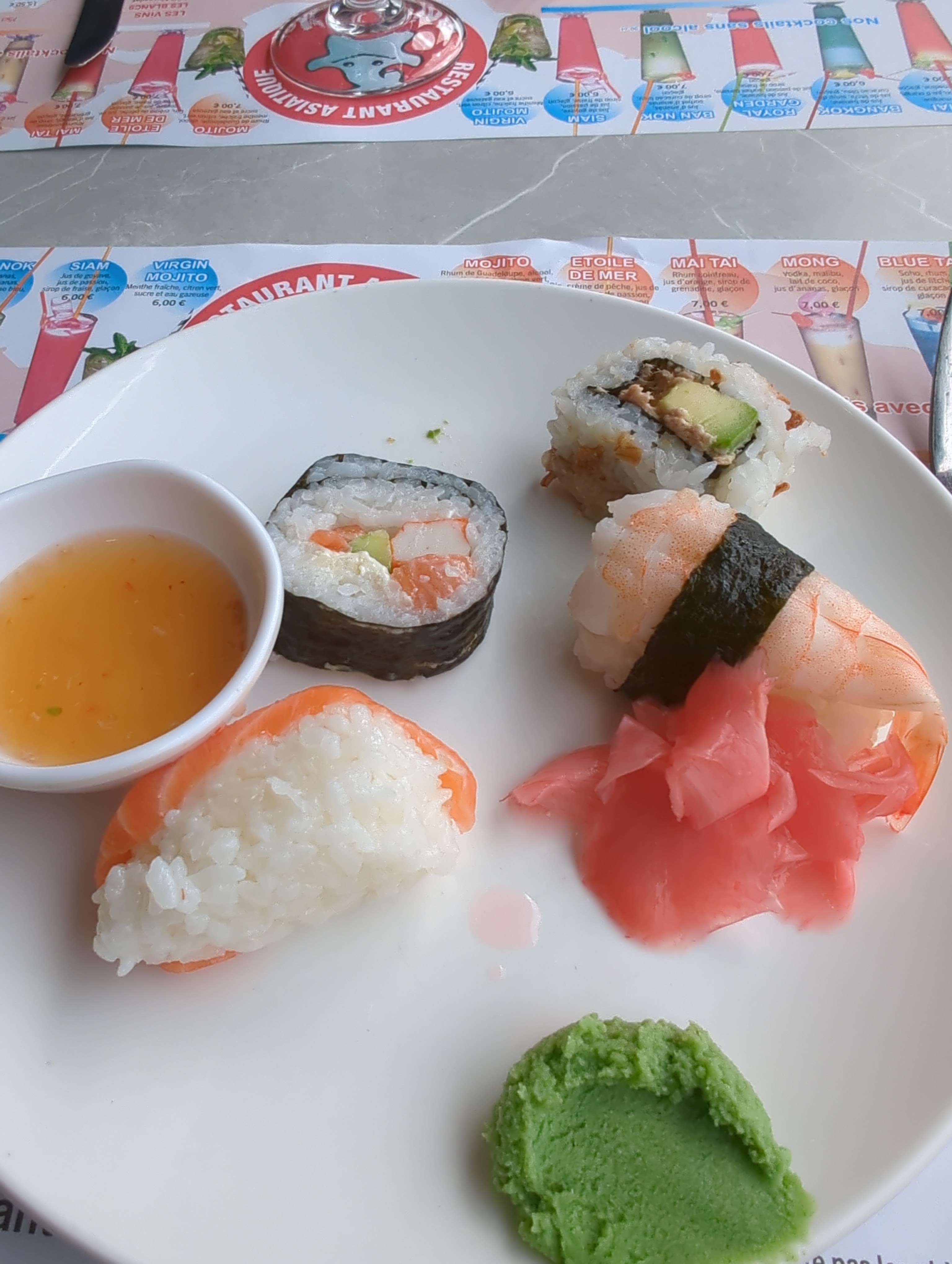 très bien et sympa choix des aliments notamment le wok : du surgelés certainement mais comme la plupart de ceux du coin les gens ont la critique facile typique français juste un manque perso le petit saké a la fin du repas